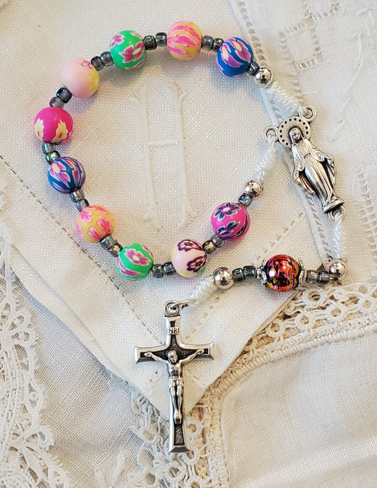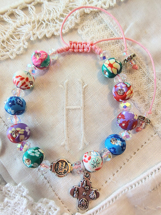 Scapular medal and Divine Mercy Bead rhinestone studded cross w/polymer clay floral beads, 4mm Crystal AB rondelles, pink nylon .5mm cord