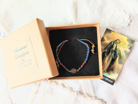 Miraculous Medal adjustable handmade bracelet with Cobalt blue Miyuki beads, red opaque Picasso Beads and Multi-colored pyramid beads