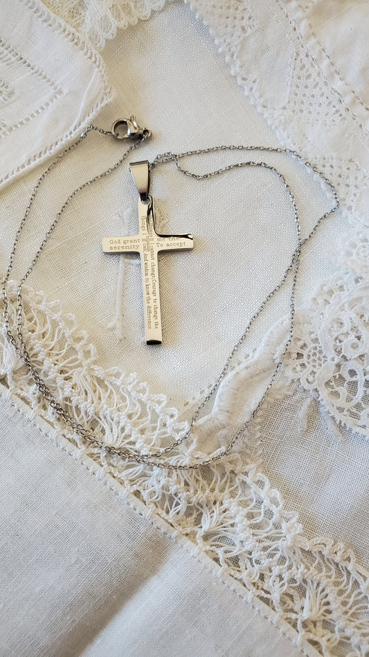 Serenity Cross Stainless Steel on Stainless Steel Chain English or Spanish choice of chain AA NA Recovery Anxiety Disorders Jewlery