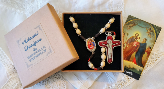 Rosario anudado a mano "Holy Love" con cuentas de madera ovaladas italianas | Crucifijo de María y Jesús | Centro de mesa de la Sagrada Familia | Detalles Miyuki con revestimiento plateado rojo | Regalo católico perfecto
