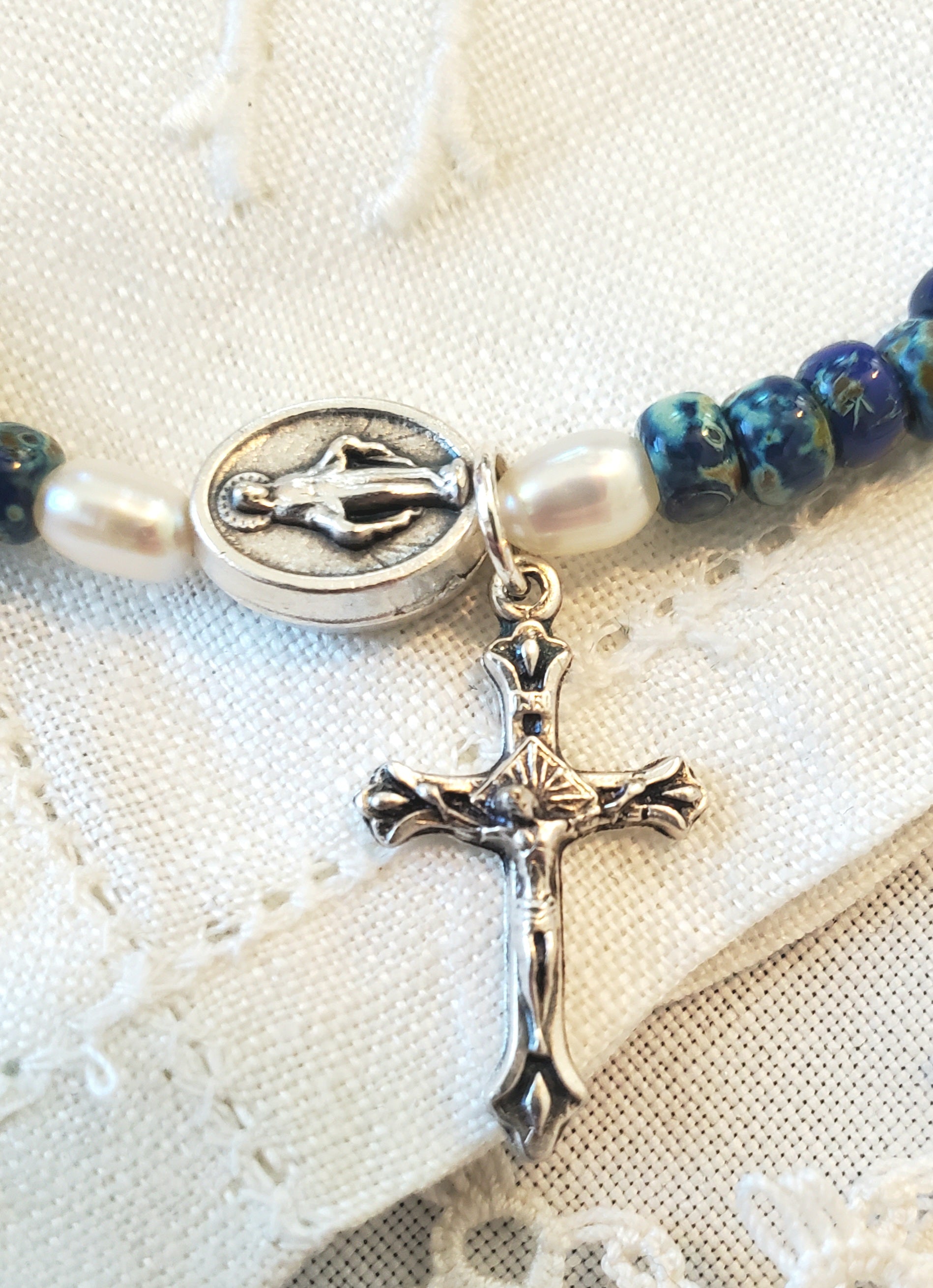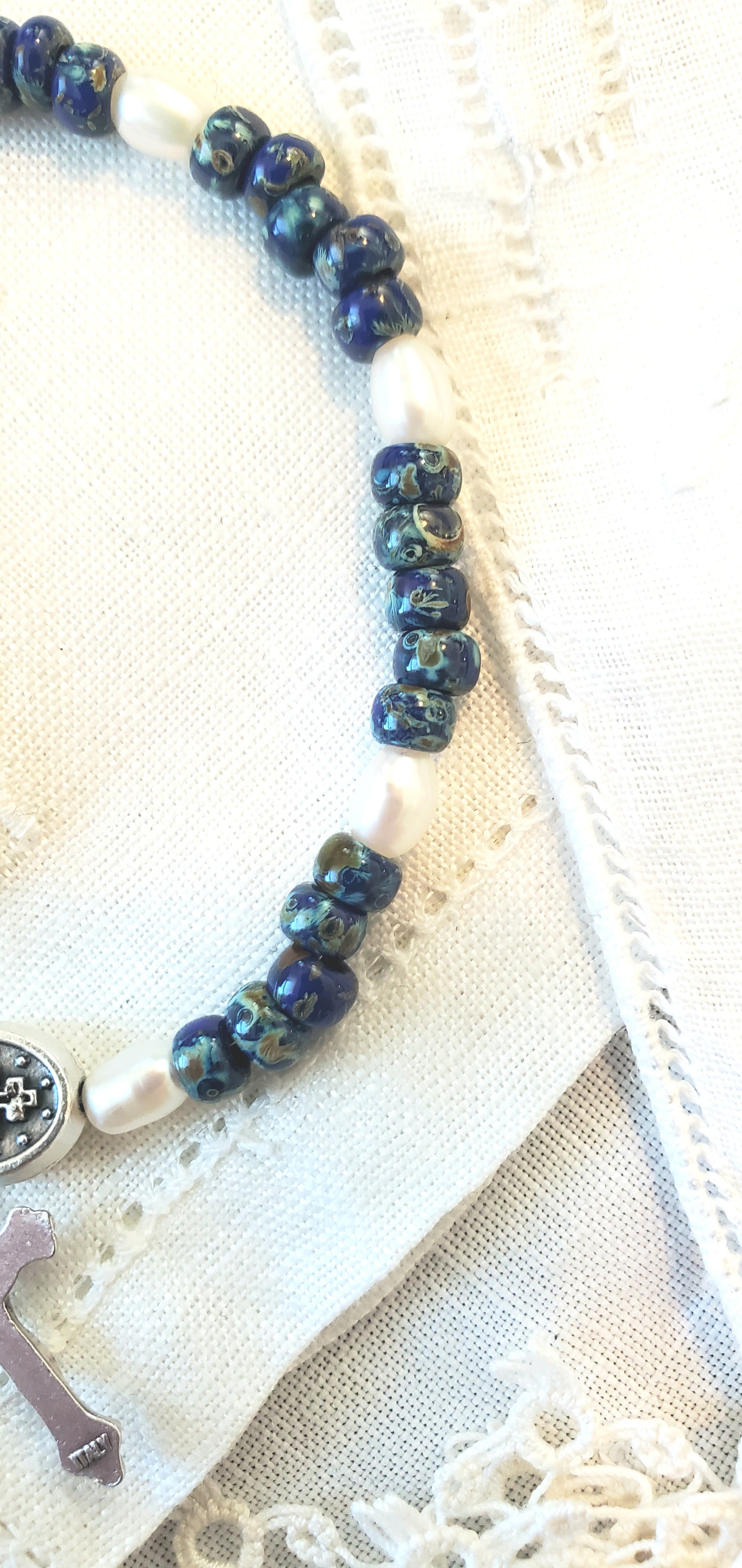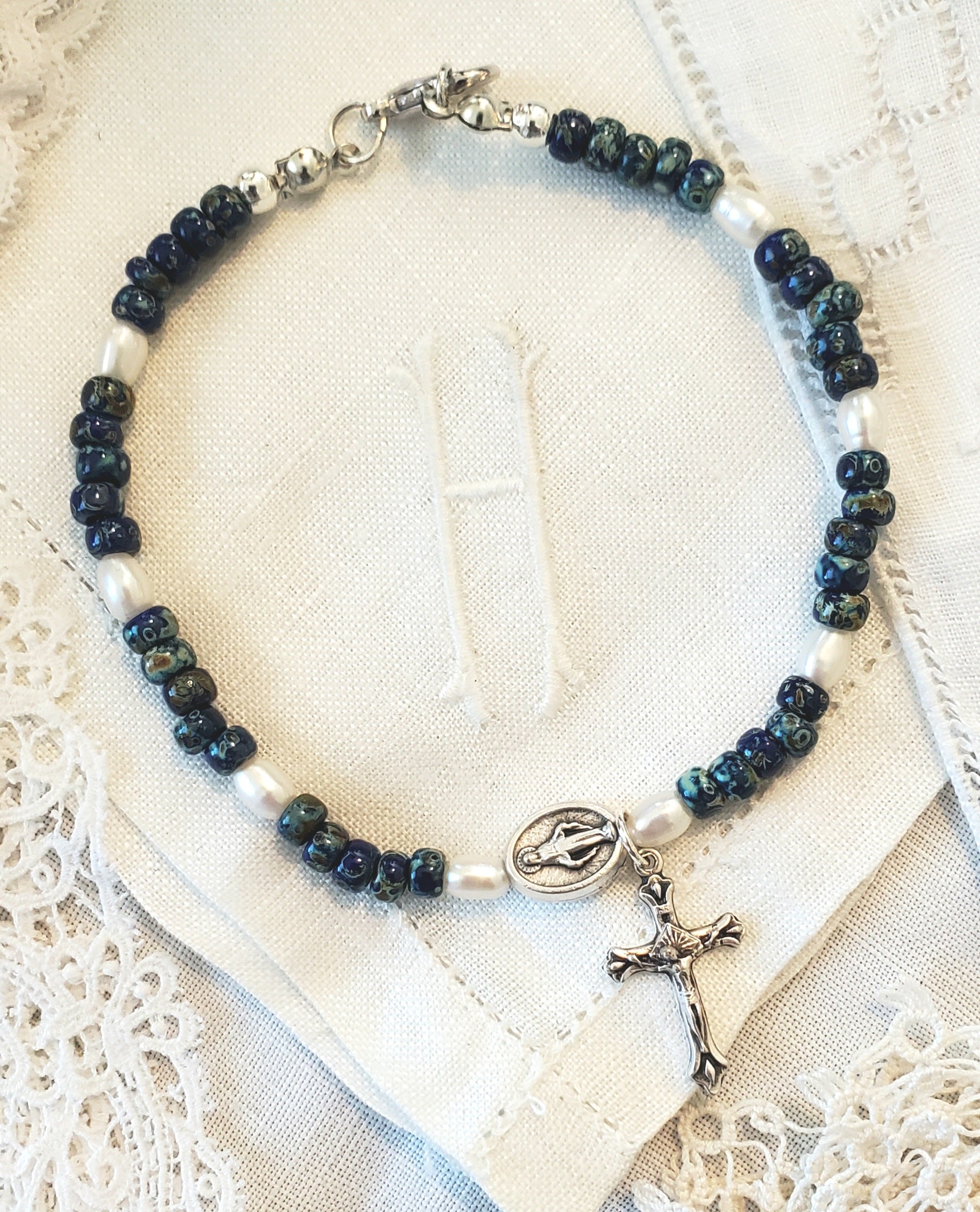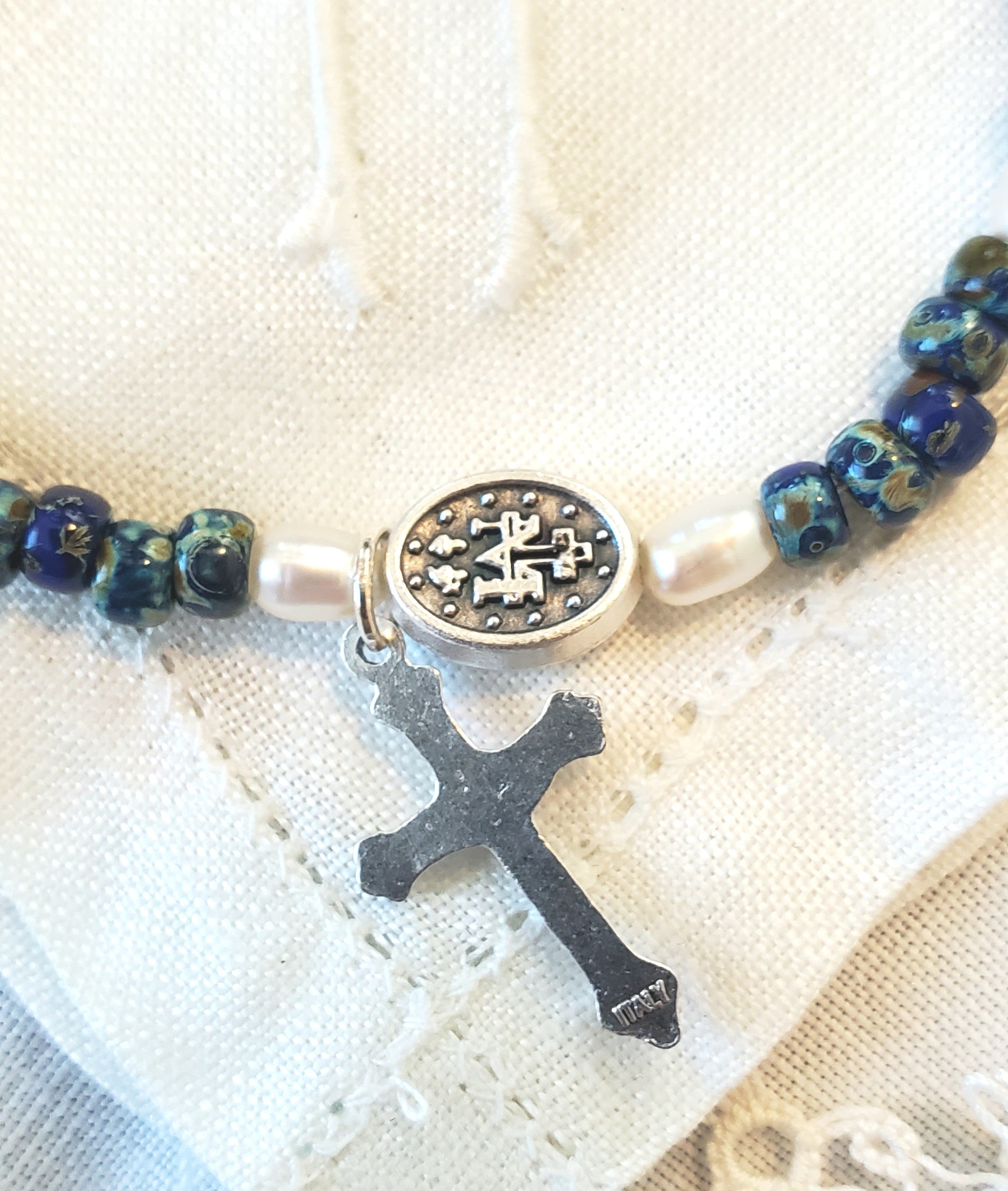 Esta pulsera, que se destaca por ocho hermosas perlas cultivadas en agua dulce, tiene una cuenta con una medalla milagrosa. La promesa de la medalla milagrosa es que se otorgan gracias especiales a quienes la usamos como sus hijos en la fe e intentamos imitar su virtud y caridad. Las otras cuentas son cuentas Miyuki Picasso. Miyuki es el fabricante de cuentas más antiguo de Japón. Las cuentas Miyuki son apreciadas por su tamaño uniforme, forma y hermosos colores. Las cuentas Picasso tienen un revestimiento especial en la base de la cuenta de vidrio que es única en cada cuenta, lo que las hace fascinantes. Ves algo diferente cada vez que las miras.