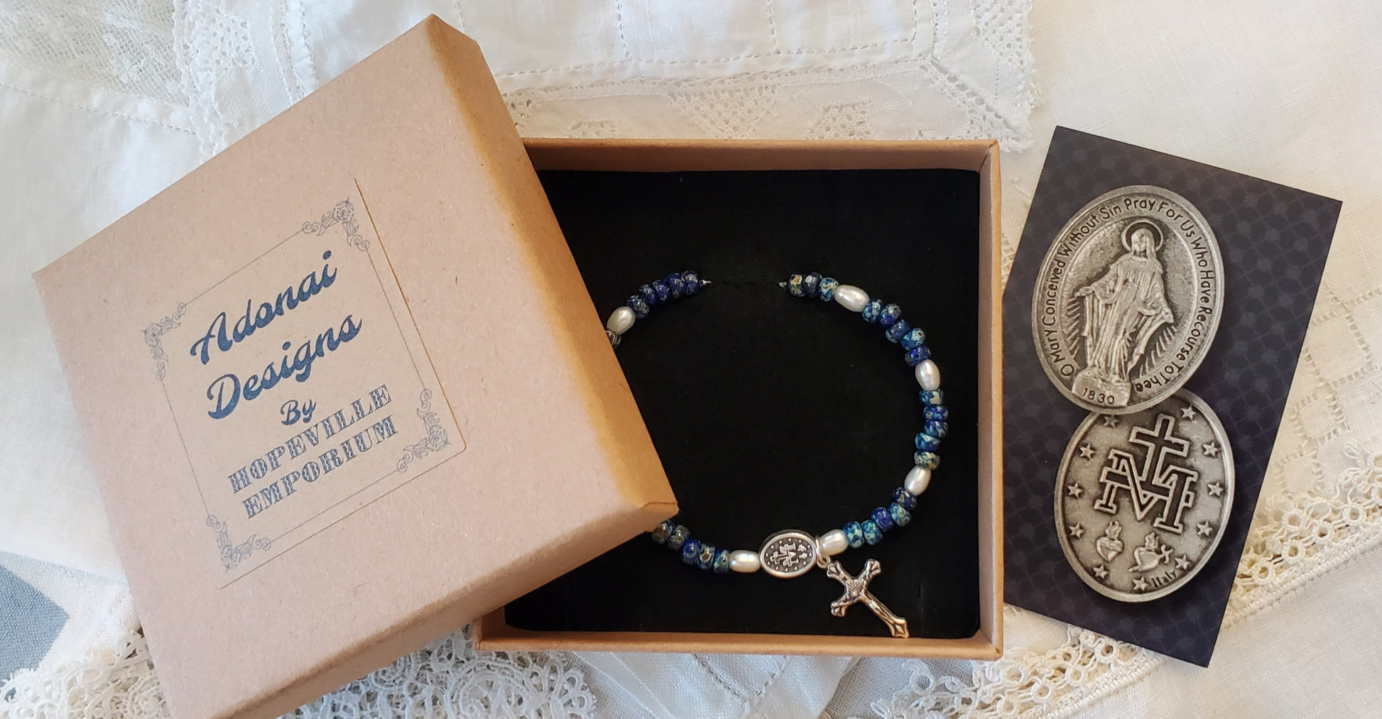 La pulsera viene empaquetada en nuestra caja forrada de terciopelo negro con una tarjeta de oración de medalla milagrosa incluida.