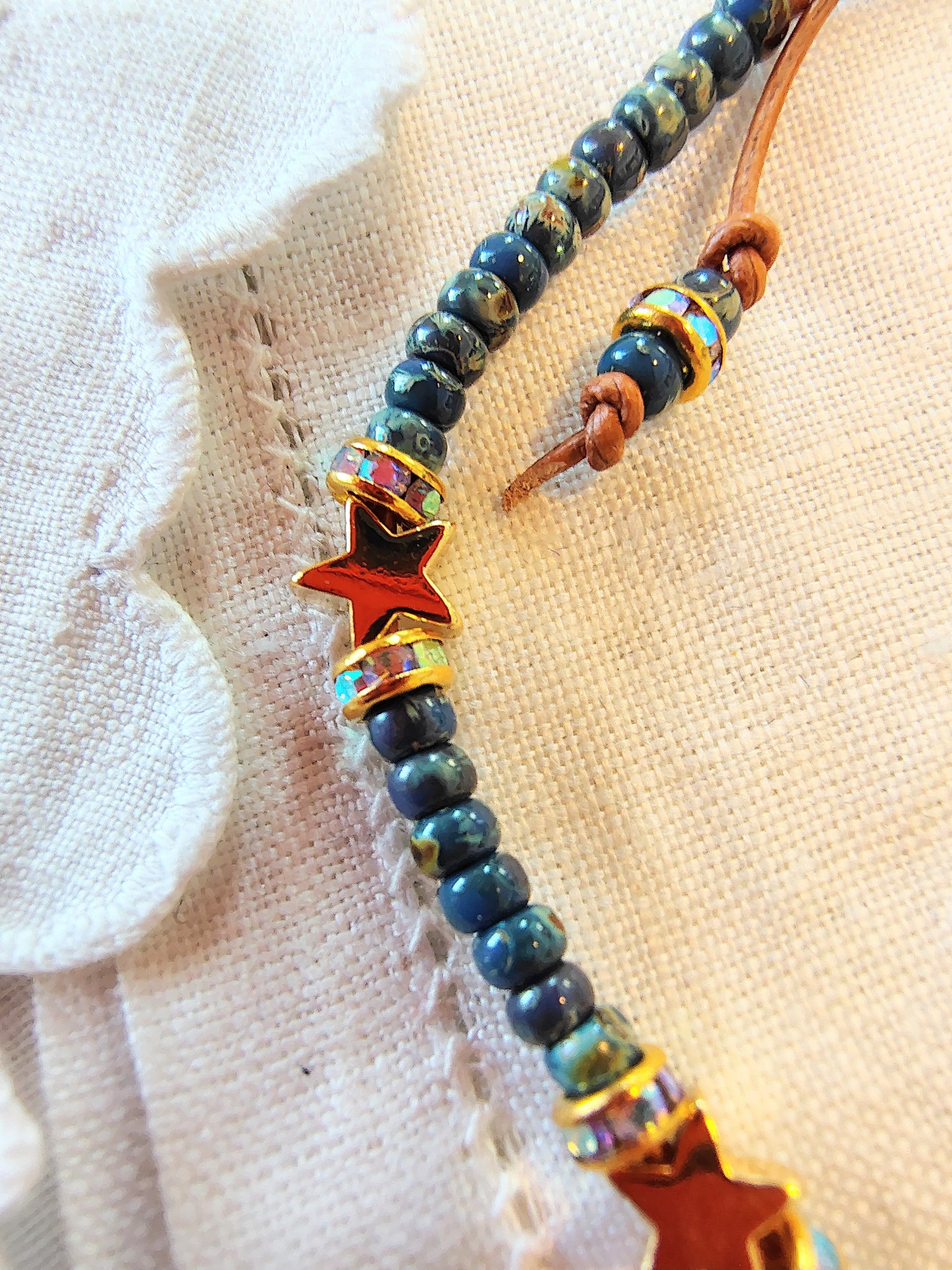 This bracelet is mesmerizing due to the Miyuki Picasso beads. Miyuki is the oldest bead manufacturer in Japan. These beads are sought after and prized for their unique beauty and uniformity in size and shape. Picasso beads are multi colored mottled beads that are stunning in appearance. Highlighted by the sparkling gold tone stars flanked by AAA Crystal rondelles that subtly shine with each movement. This is a fun and dazzling combination.