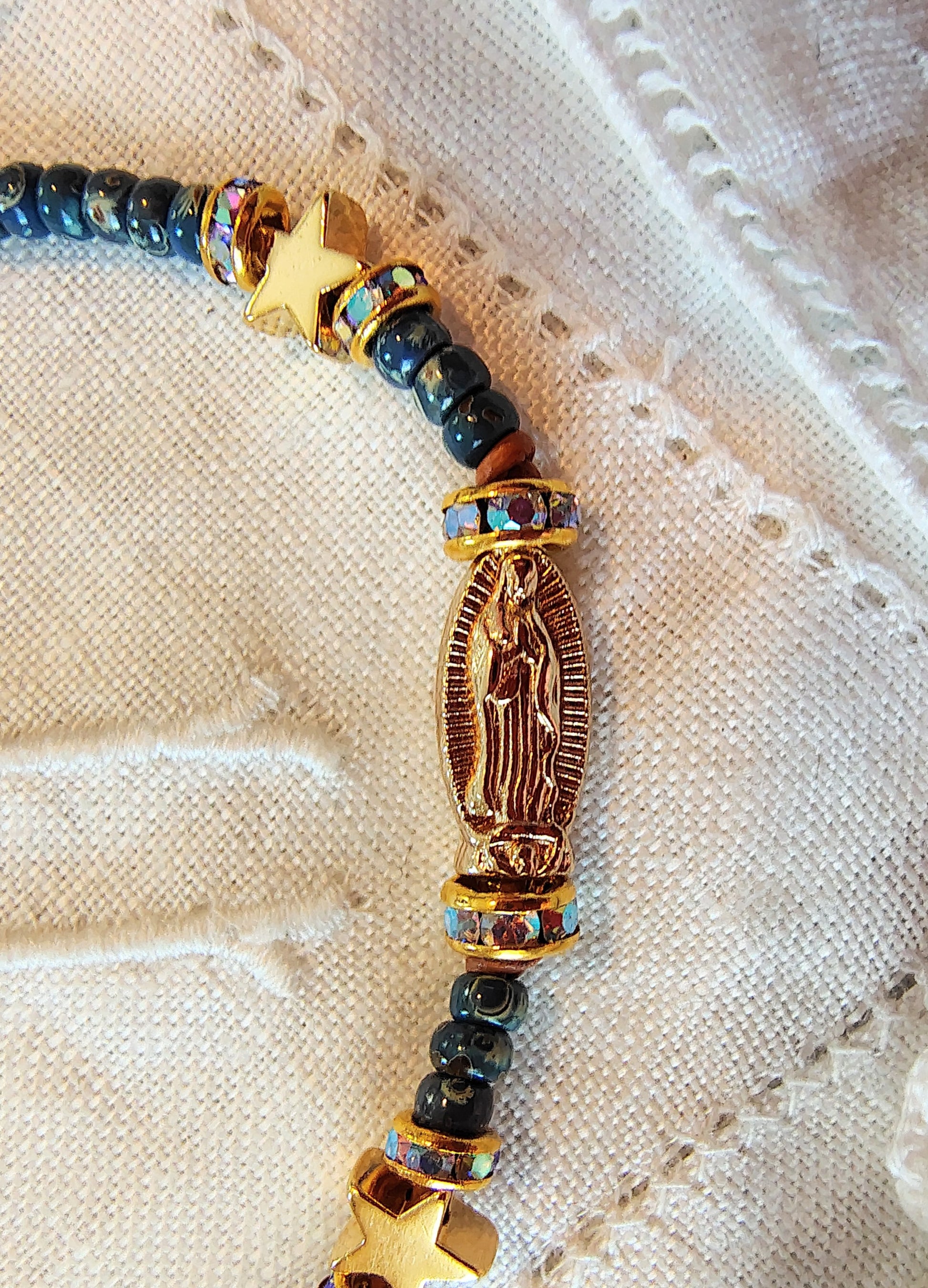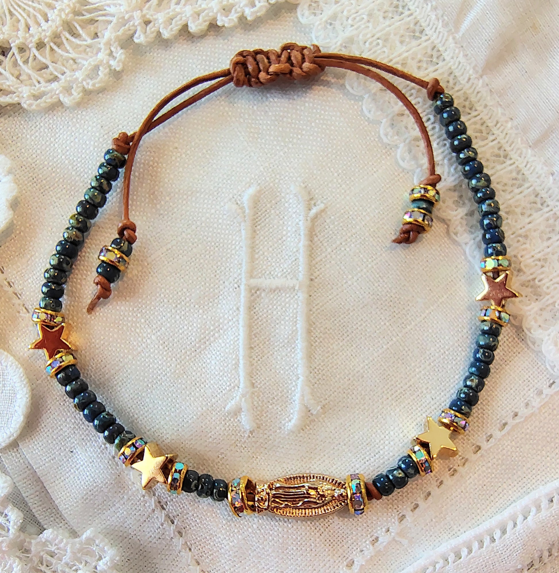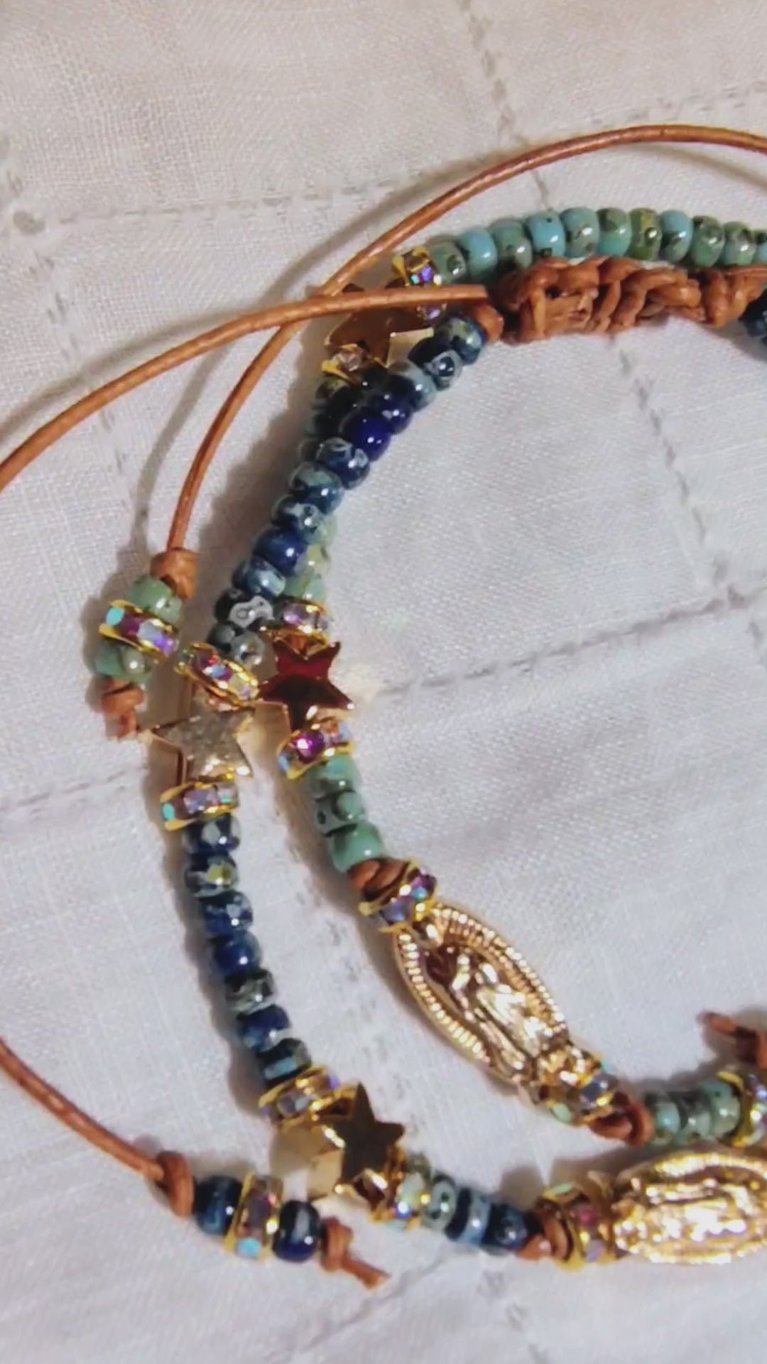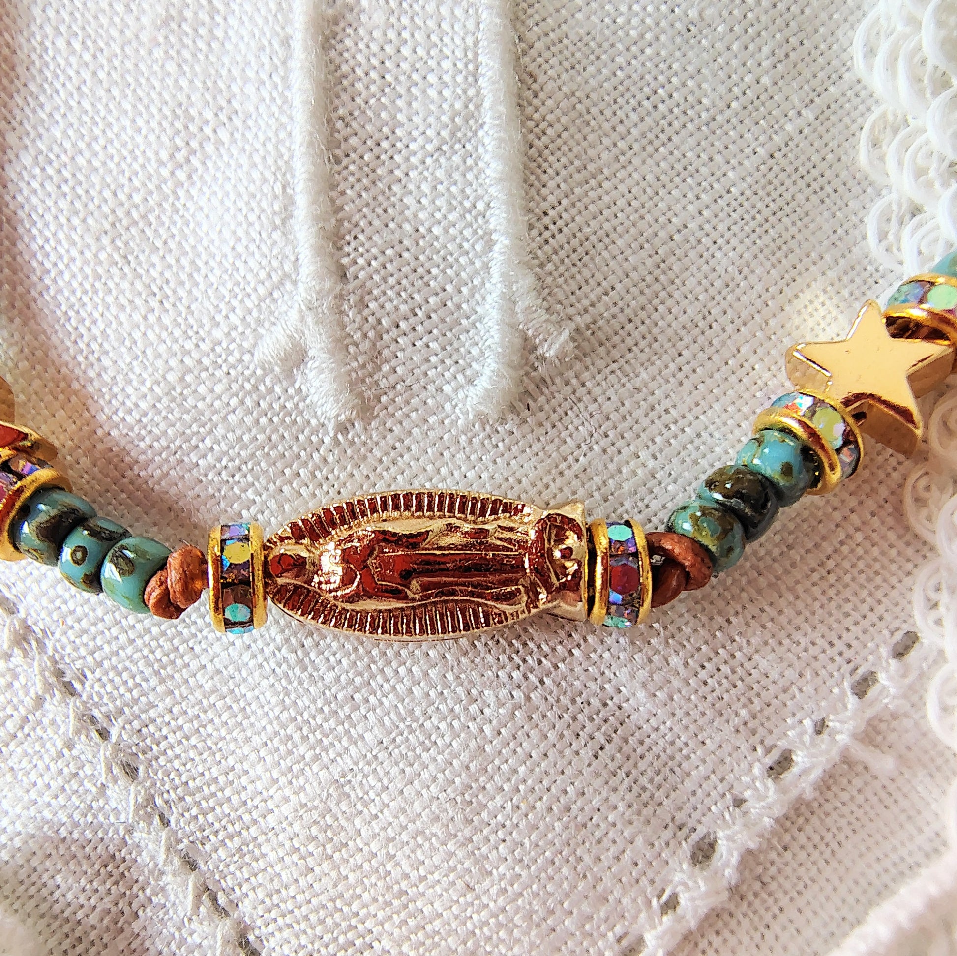 Outstanding sparkle and beauty that honors Our Lady of Guadalupe. Your choice of Cobalt or teal. This dainty Our Lady of Guadalupe bracelet features a gold tone bright Our Lady of Guadalupe bead surrounded by 11/0 2mm Miyuki Picasso beads in Cobalt blue or teal. Each color choice is accented by bright gold tone alloy 6mm star beads and 4mm AAA crystal AB rondelles. This is all knotted on a brown 1!2 mm leather cord. Delicate yet tough, this is a durable adjustable bracelet because of the square knot slider.