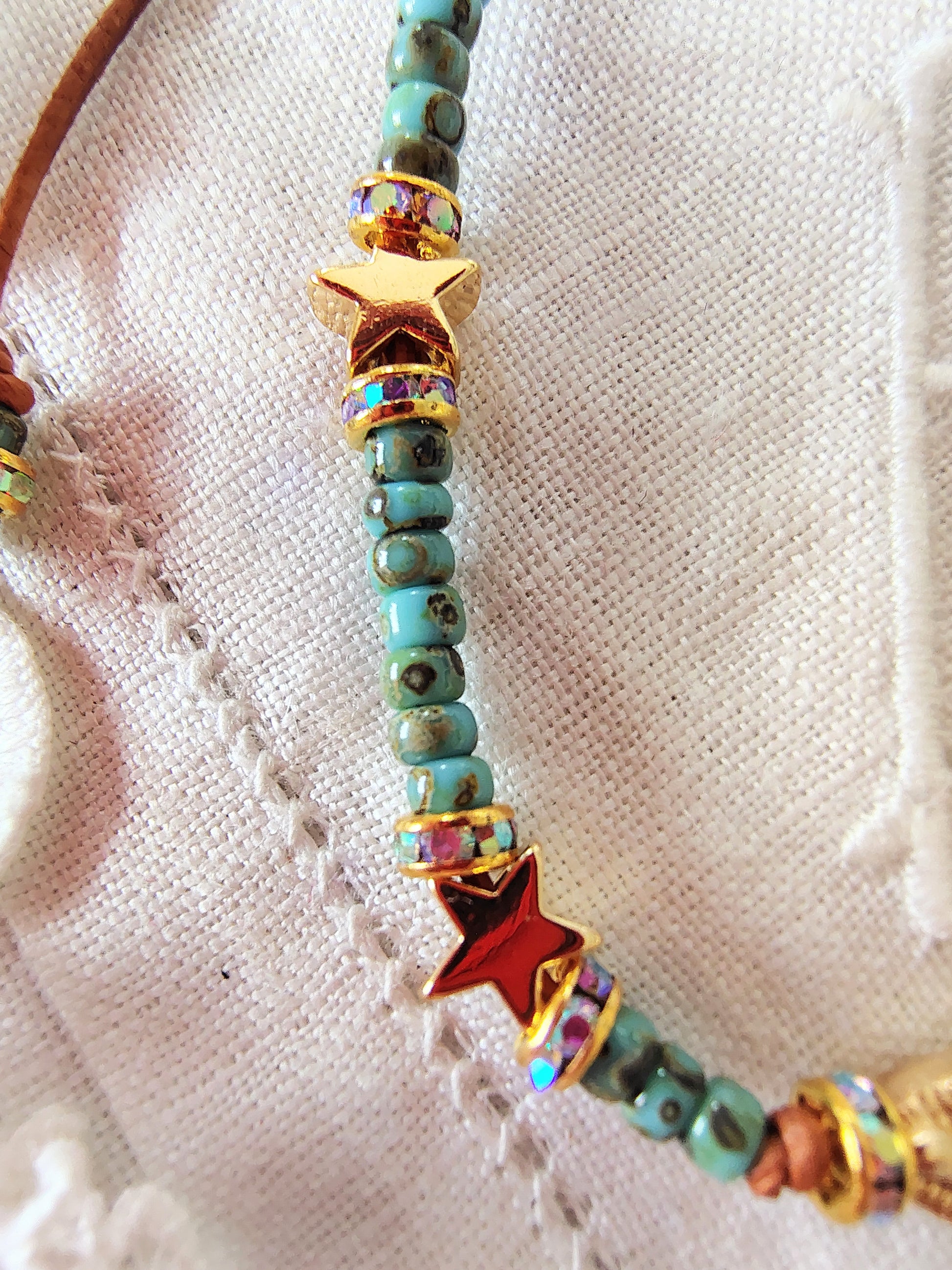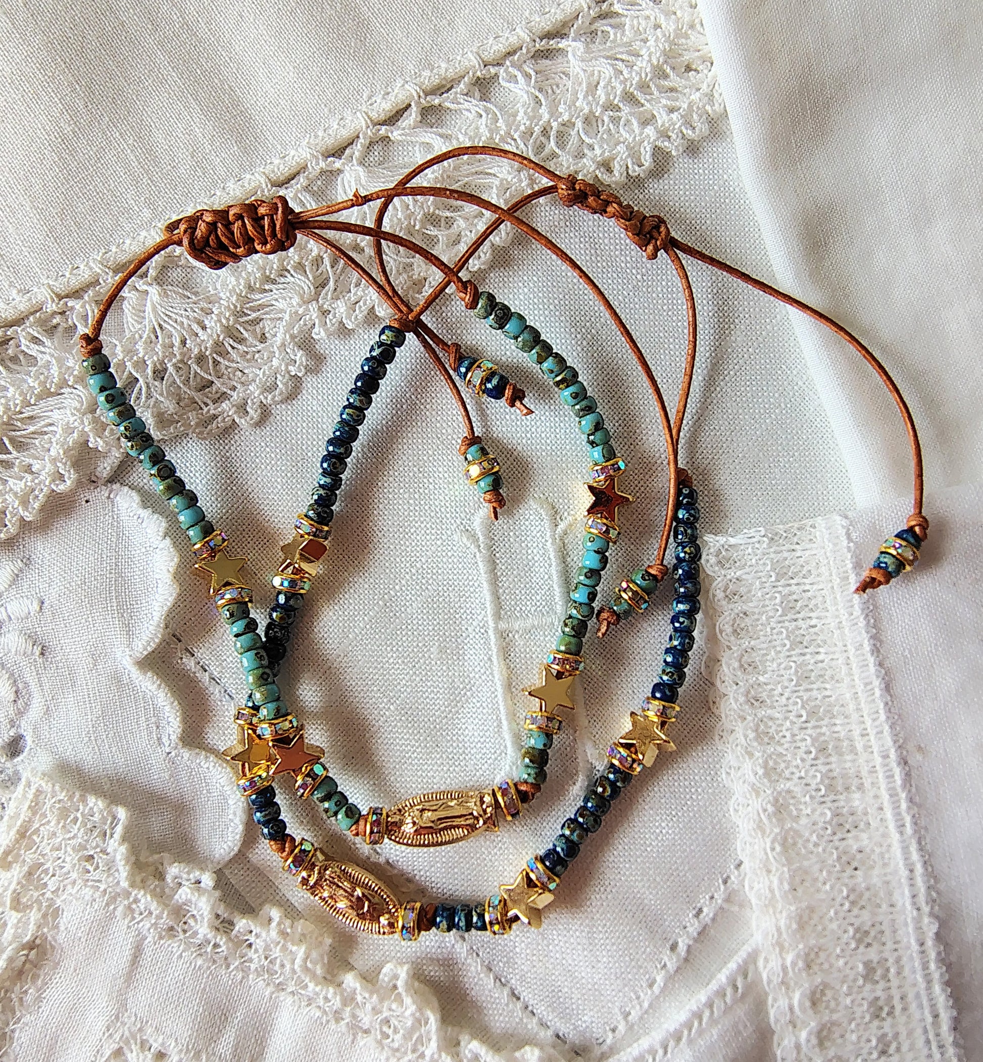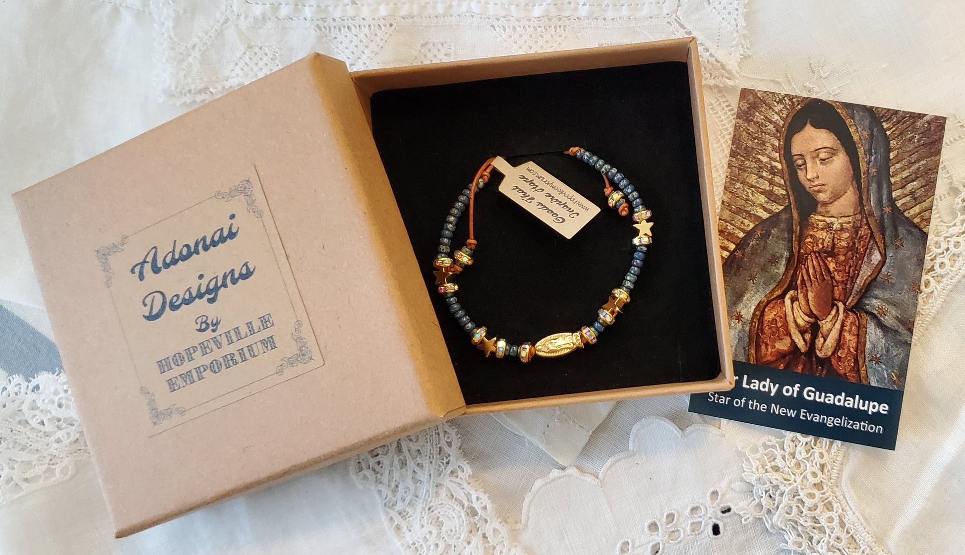 Outstanding sparkle and beauty that honors Our Lady of Guadalupe. Your choice of Cobalt or teal. This dainty Our Lady of Guadalupe bracelet features a gold tone bright Our Lady of Guadalupe bead surrounded by 11/0 2mm Miyuki Picasso beads in Cobalt blue or teal. Each color choice is accented by bright gold tone alloy 6mm star beads and 4mm AAA crystal AB rondelles. This is all knotted on a brown 1!2 mm leather cord. Delicate yet tough, this is a durable adjustable bracelet because of the square knot slider.