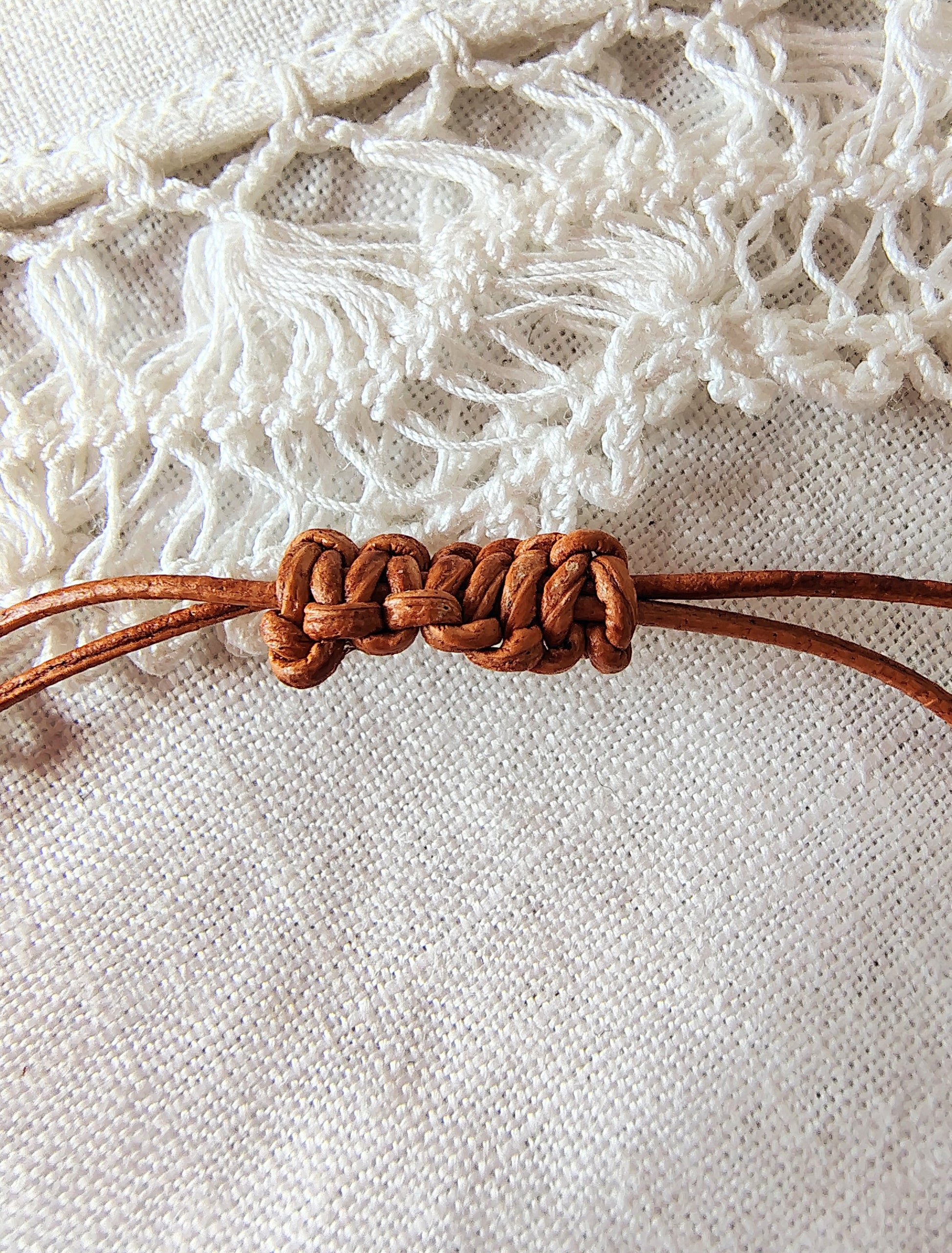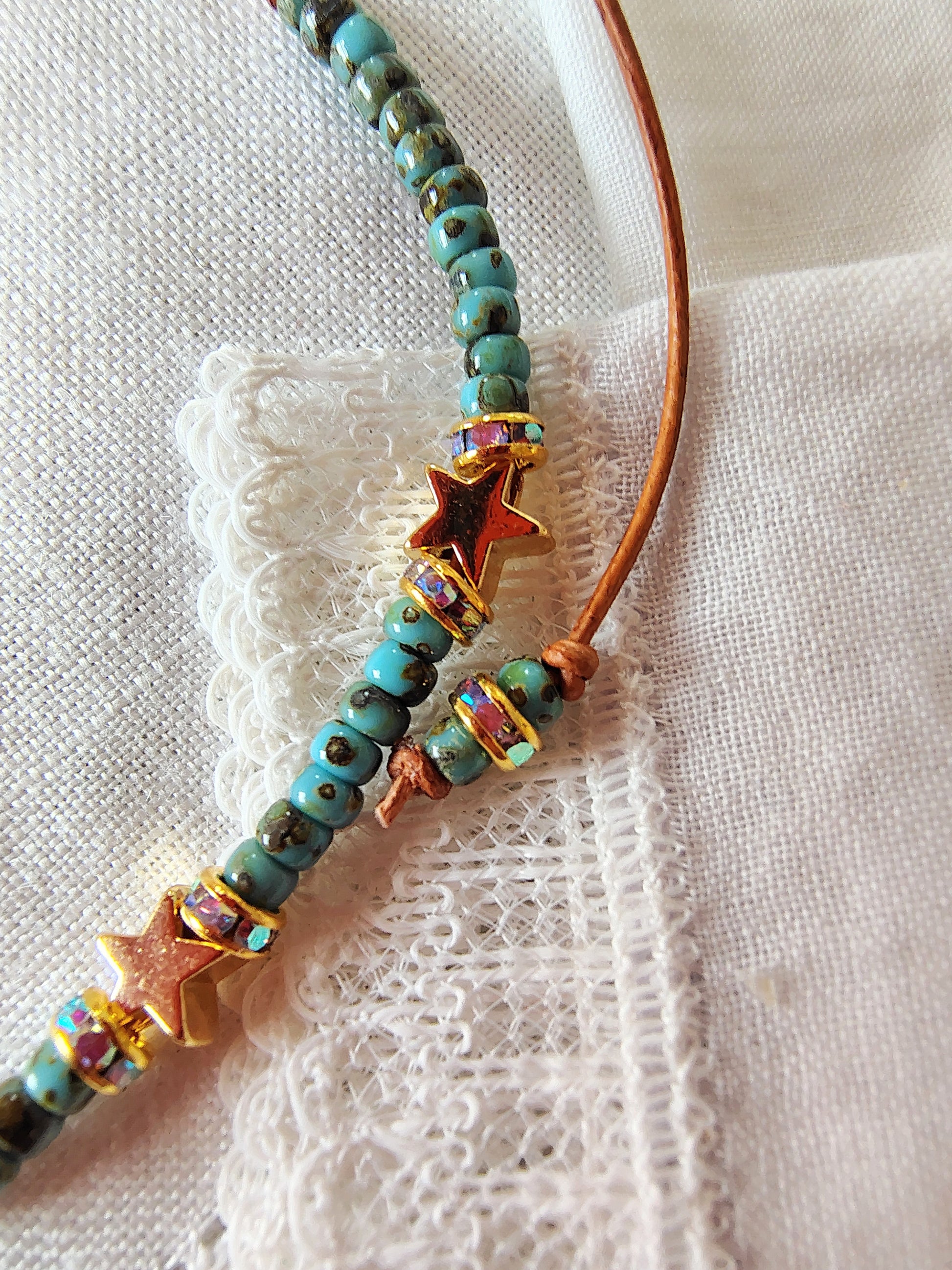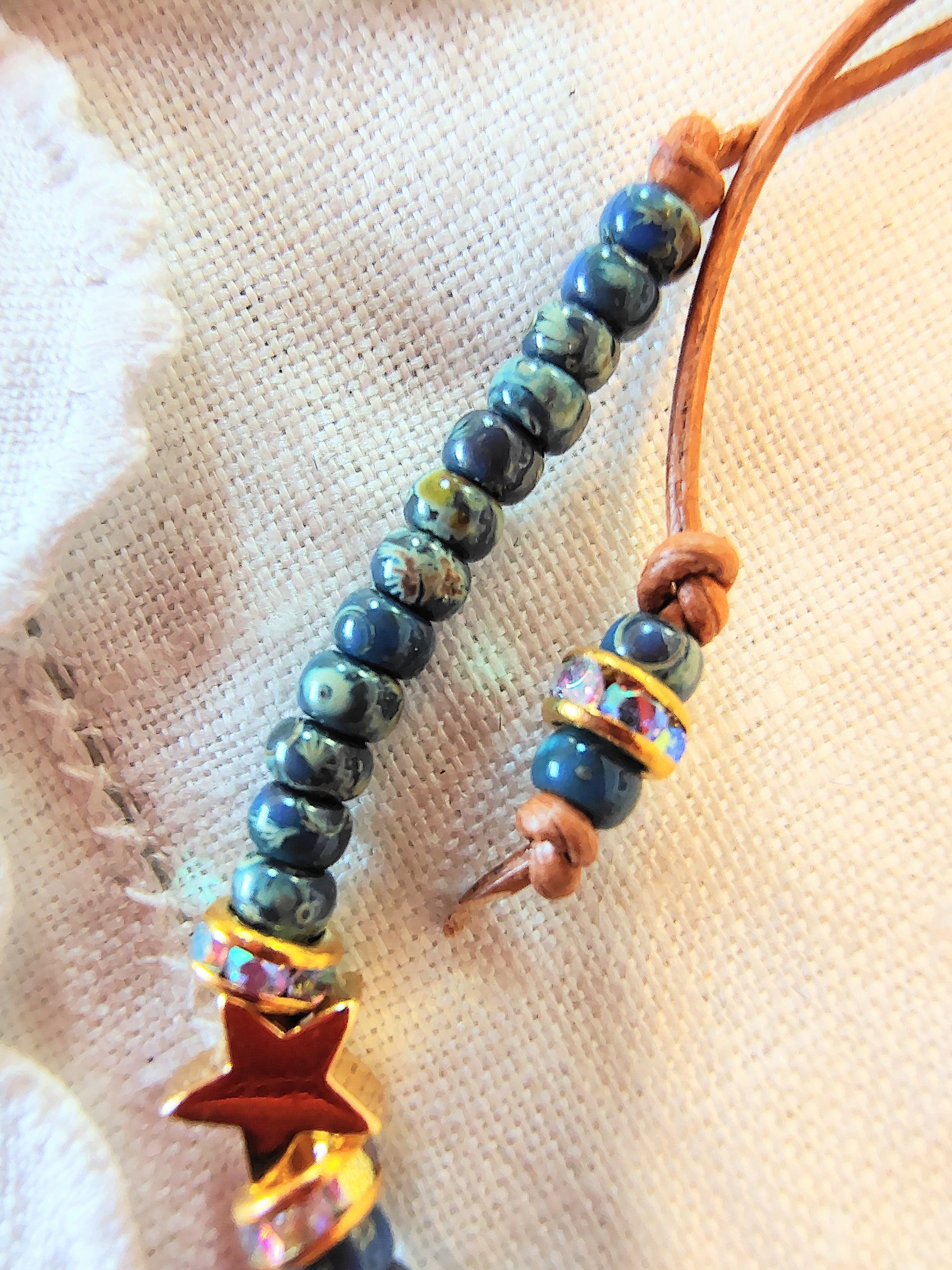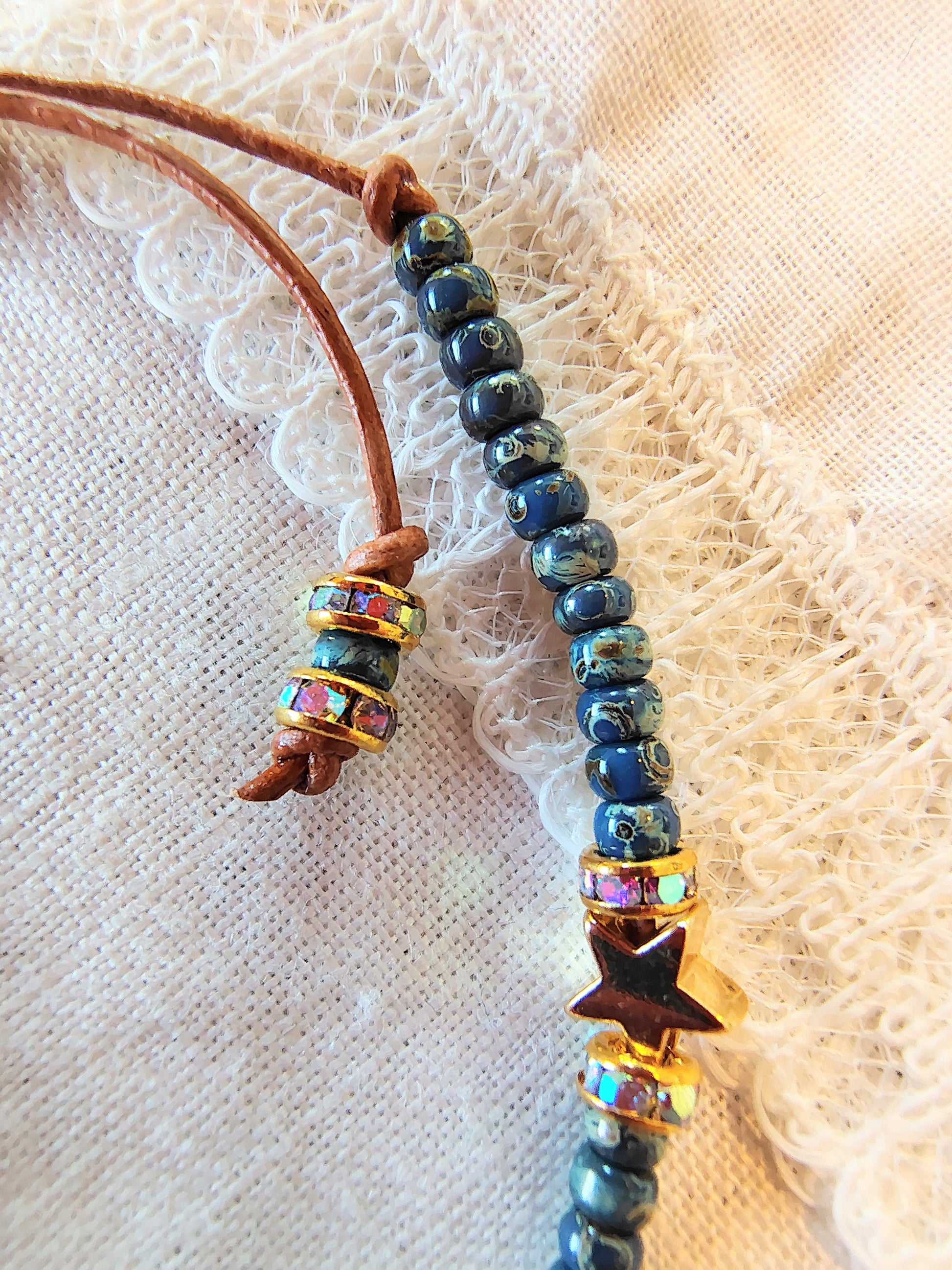Outstanding sparkle and beauty that honors Our Lady of Guadalupe. Your choice of Cobalt or teal. This dainty Our Lady of Guadalupe bracelet features a gold tone bright Our Lady of Guadalupe bead surrounded by 11/0 2mm Miyuki Picasso beads in Cobalt blue or teal. Each color choice is accented by bright gold tone alloy 6mm star beads and 4mm AAA crystal AB rondelles. This is all knotted on a brown 1!2 mm leather cord. Delicate yet tough, this is a durable adjustable bracelet because of the square knot slider.