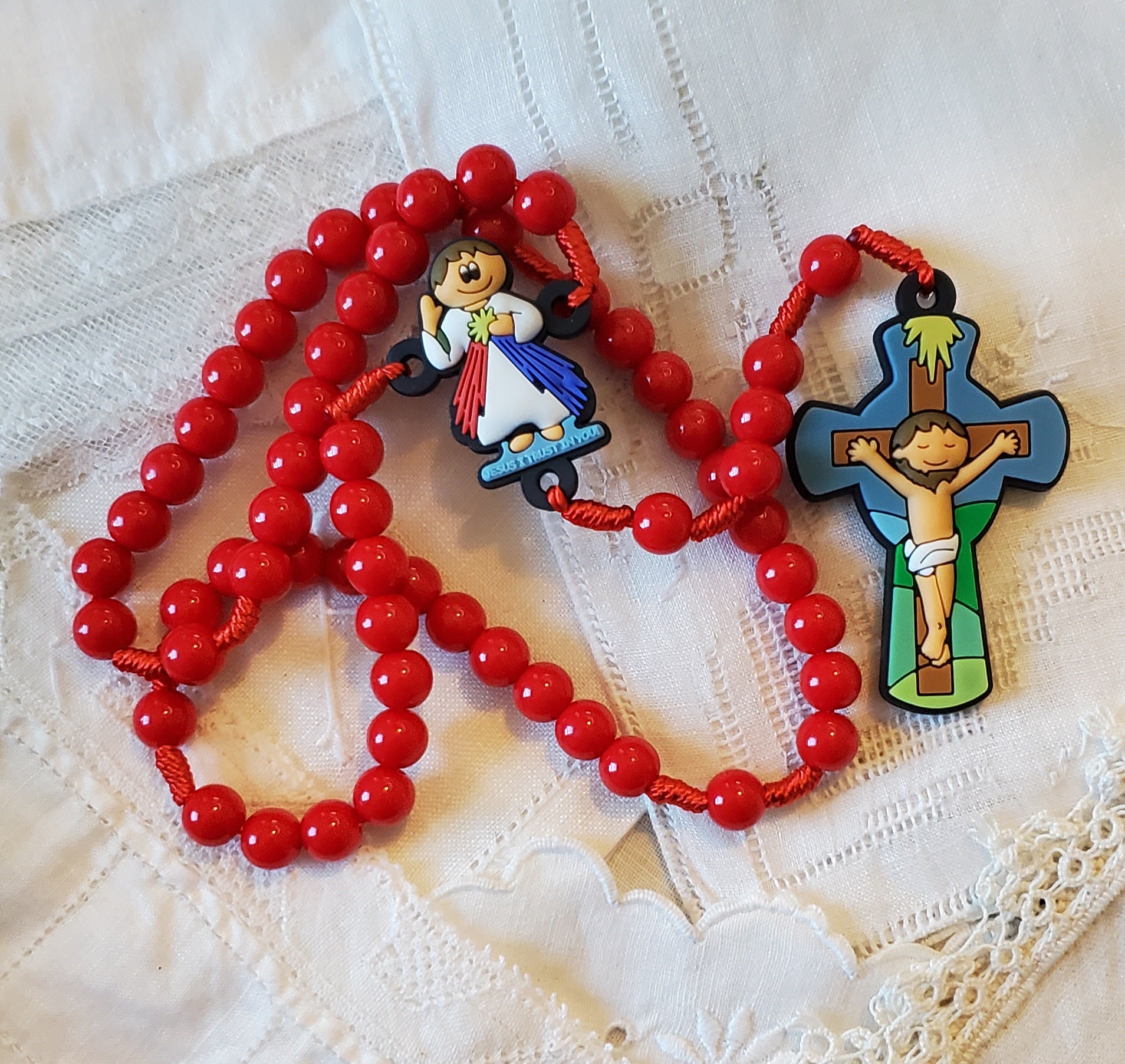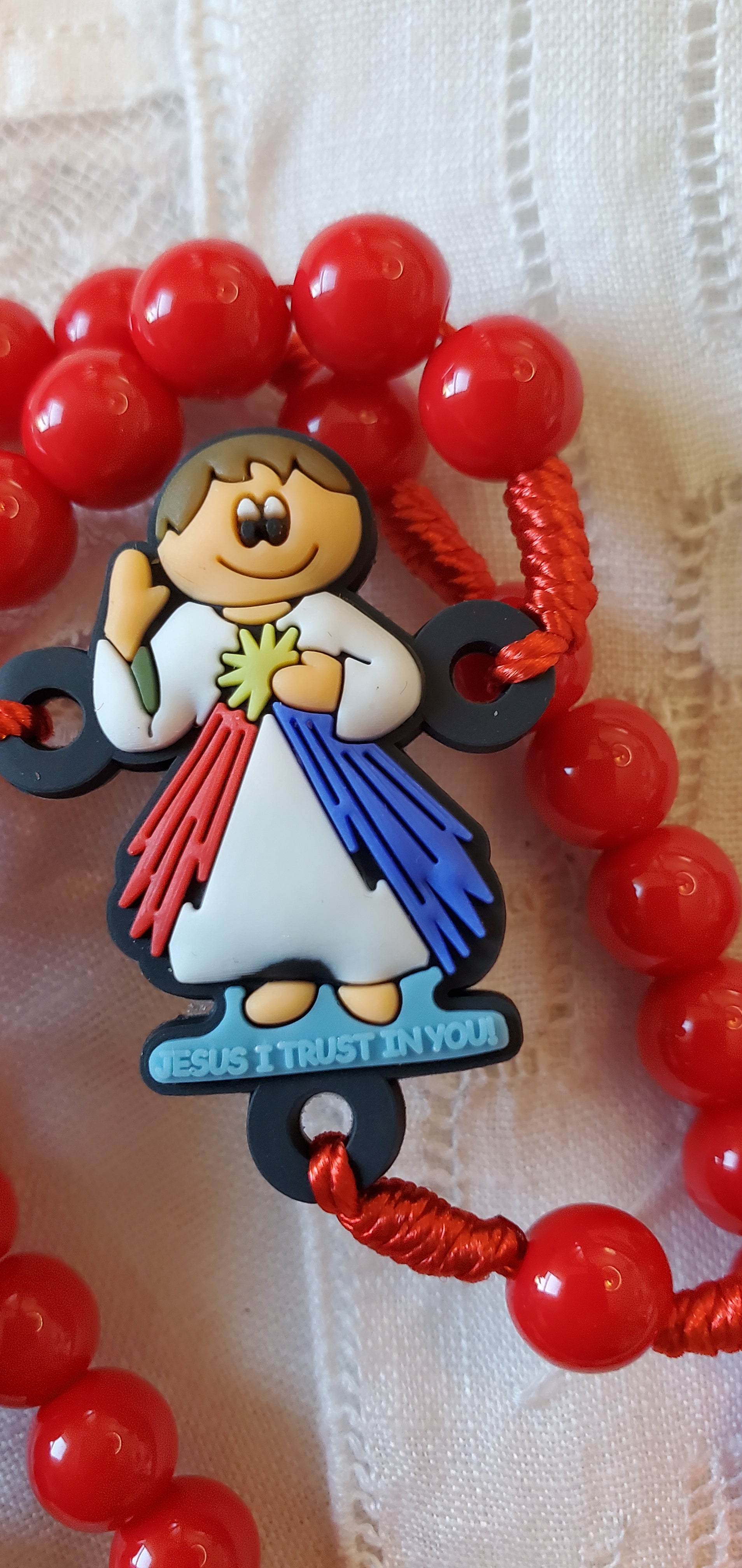 Ce petit chapelet de dévotions adorable est fabriqué avec un cordon de chapelet en nylon noué avec des perles en plastique. Ce sont des perles, un crucifix et une pièce maîtresse de belle qualité. Le crucifix est une perle focale douce et colorée d'environ 2" de long x 1 3/8". La pièce maîtresse est une réplique mignonne et douce de la Divine Miséricorde de 1 1/4" x 1". Les perles sont des perles solides et lisses sans lignes de moulage. La longueur totale est de 15". La circonférence du chapelet est d'environ 18".