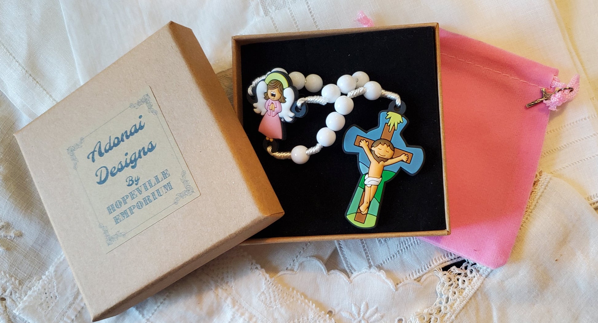 Coffret cadeau chapelet ange gardien blanc et rose Tiny Devotions.
