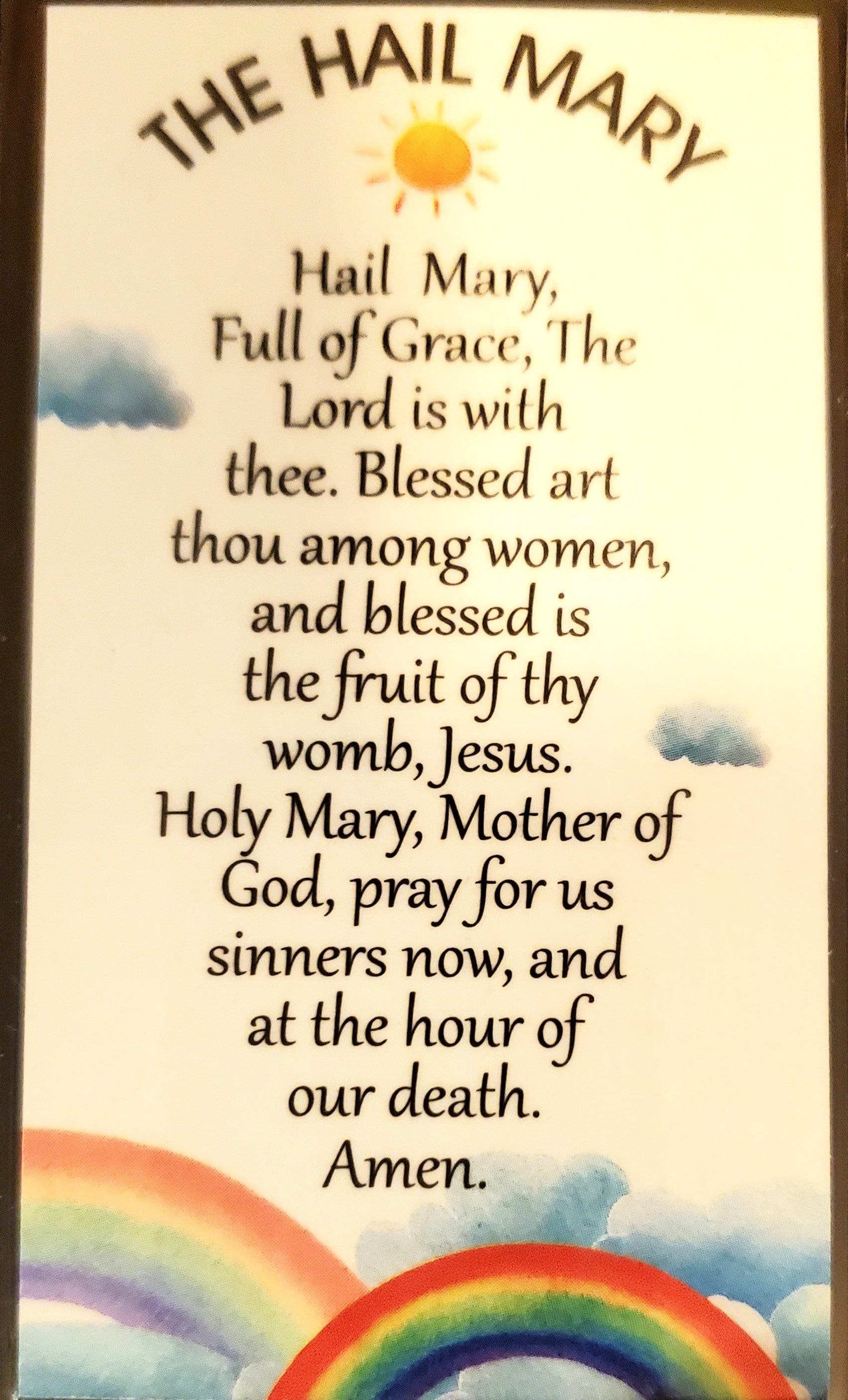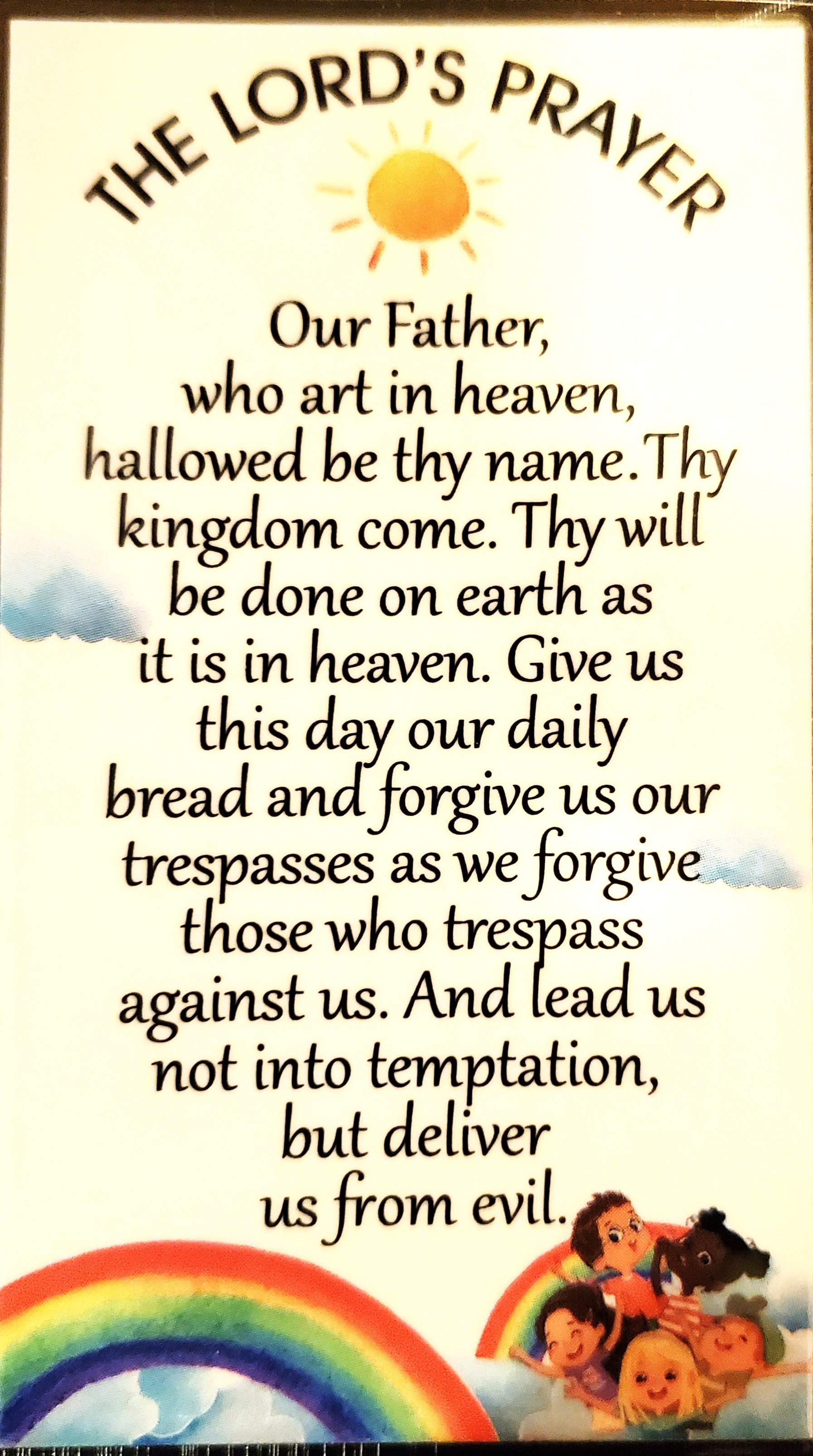 L'ensemble comprend une carte de prière pour enfant avec le Notre Père d'un côté et le Je vous salue Marie de l'autre, 3 1/2" x 2" et est plastifiée. Sera également livré avec un livret coloré avec les instructions sur la façon de prier le rosaire 4" x 3".