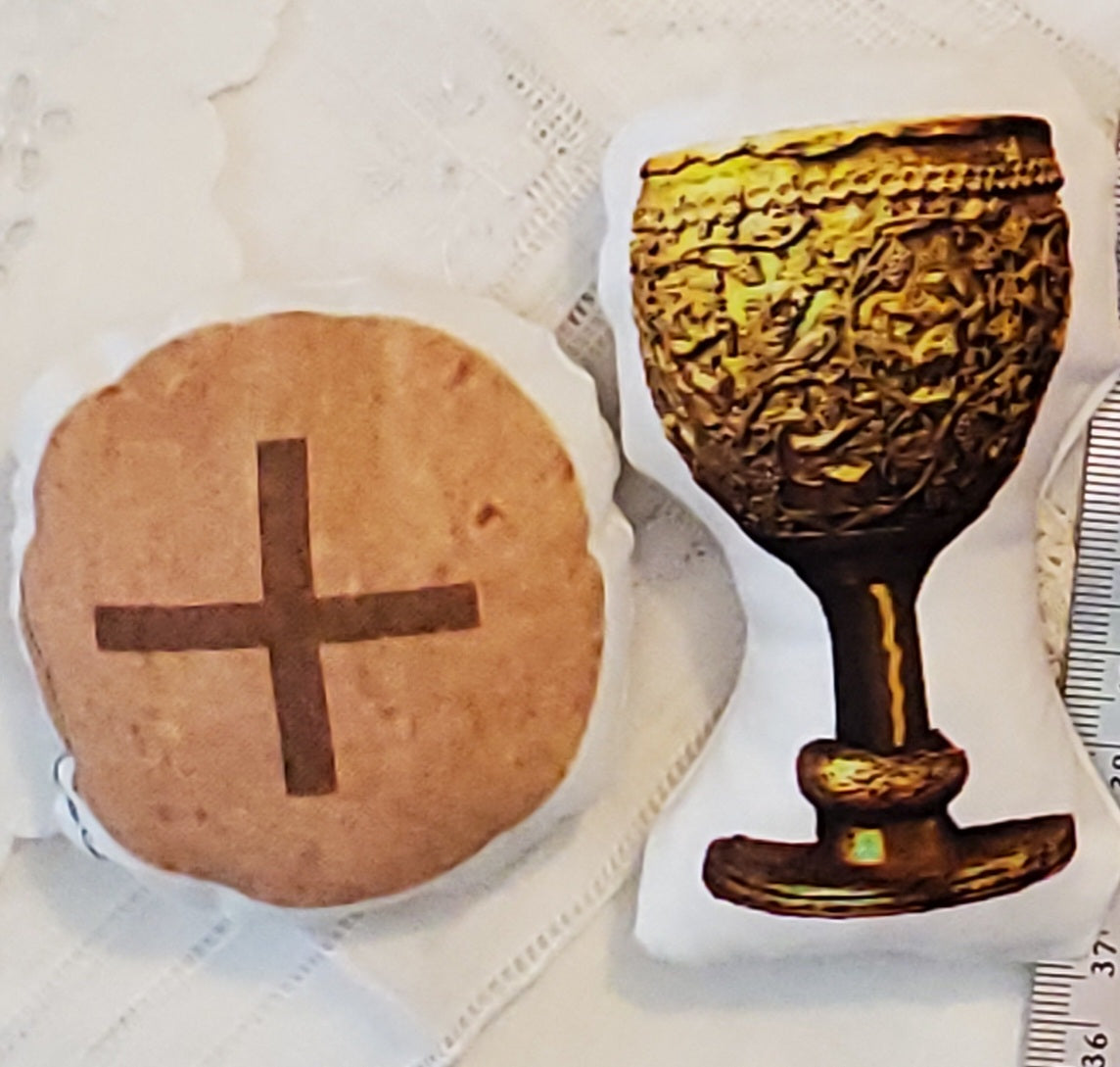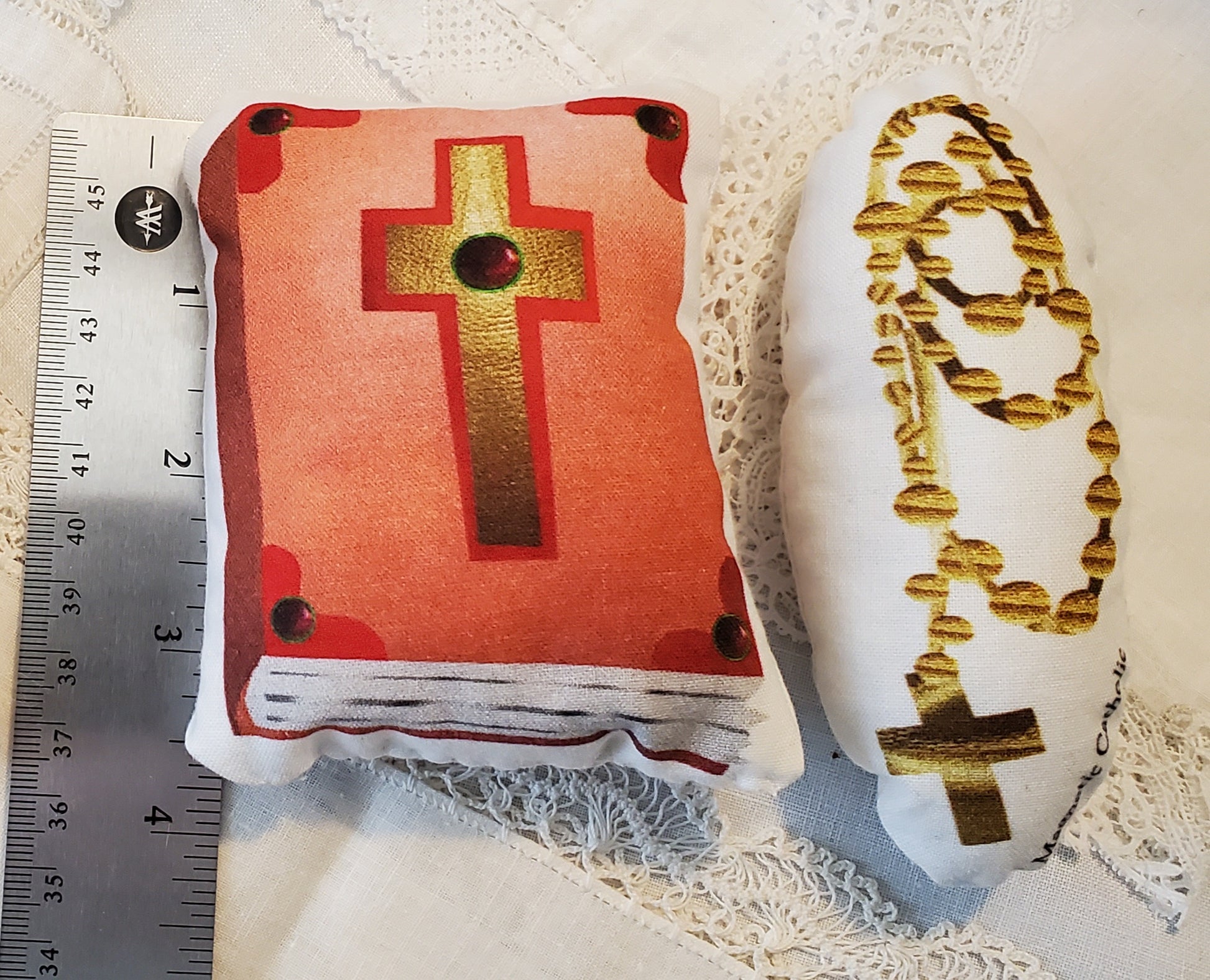 Jouets en peluche mignons coupés et cousus pour la messe. Tout enfant ou tout-petit adorerait cet ensemble de jouets avec lesquels jouer tout en assistant à la messe hebdomadaire. Mesurant environ 3 à 4 pouces chacun, ces jouets en peluche sont des répliques d'un livre sacré, d'un chapelet et du calice et de l'hostie de l'Eucharistie. Les enfants joueront tout en recevant des instructions douces sur la liturgie.