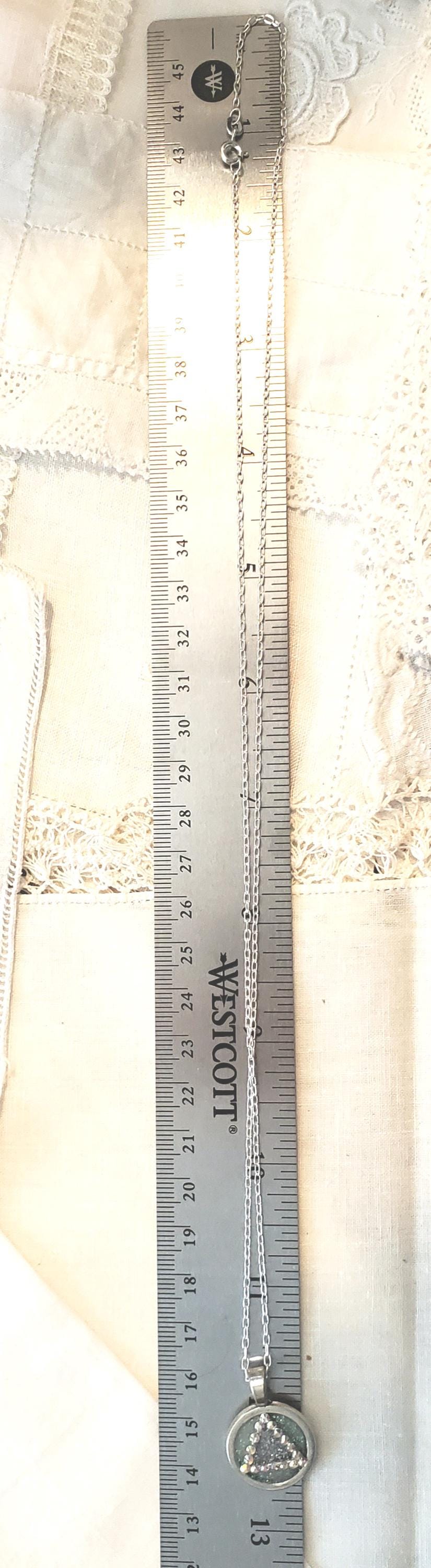 This Is a lovely adaptation of a plain zinc alloy AA recovery symbol charm. The charm is 3/4". It has been adapted by first filling with white and silver UV resins. Then 2mm AB rhinestones were affixed to both sides of the charm highlighting the "Unity, Service, Recovery" triangle. Then the triangle was filled with UV resin to secure the rhinestones in place. It is suspended on a 23" silver filled chain.