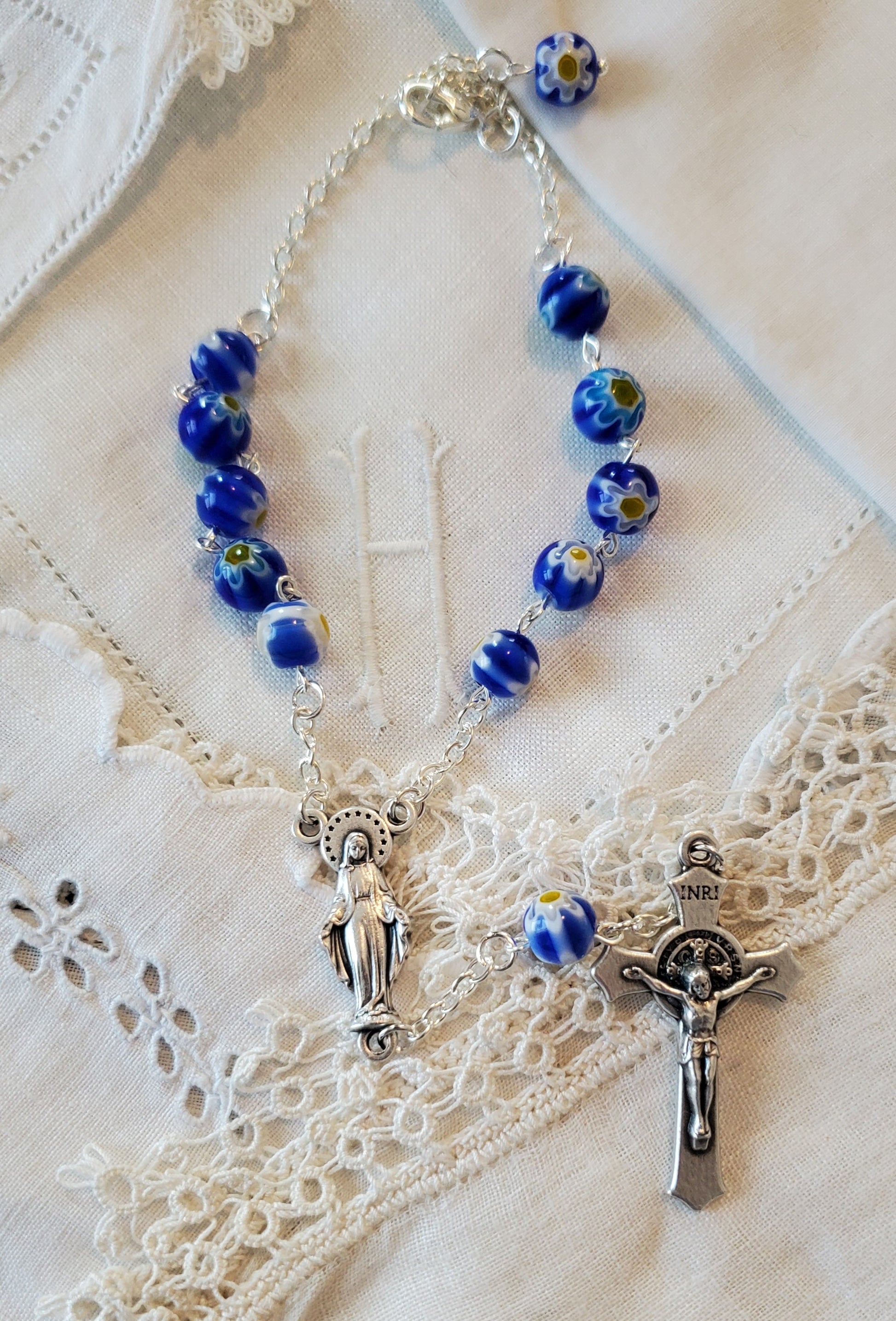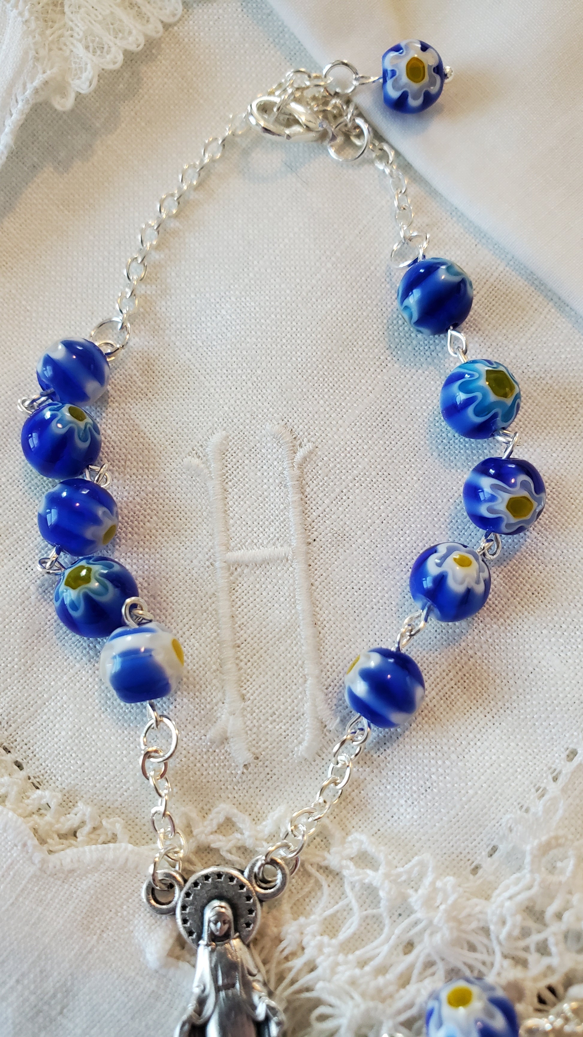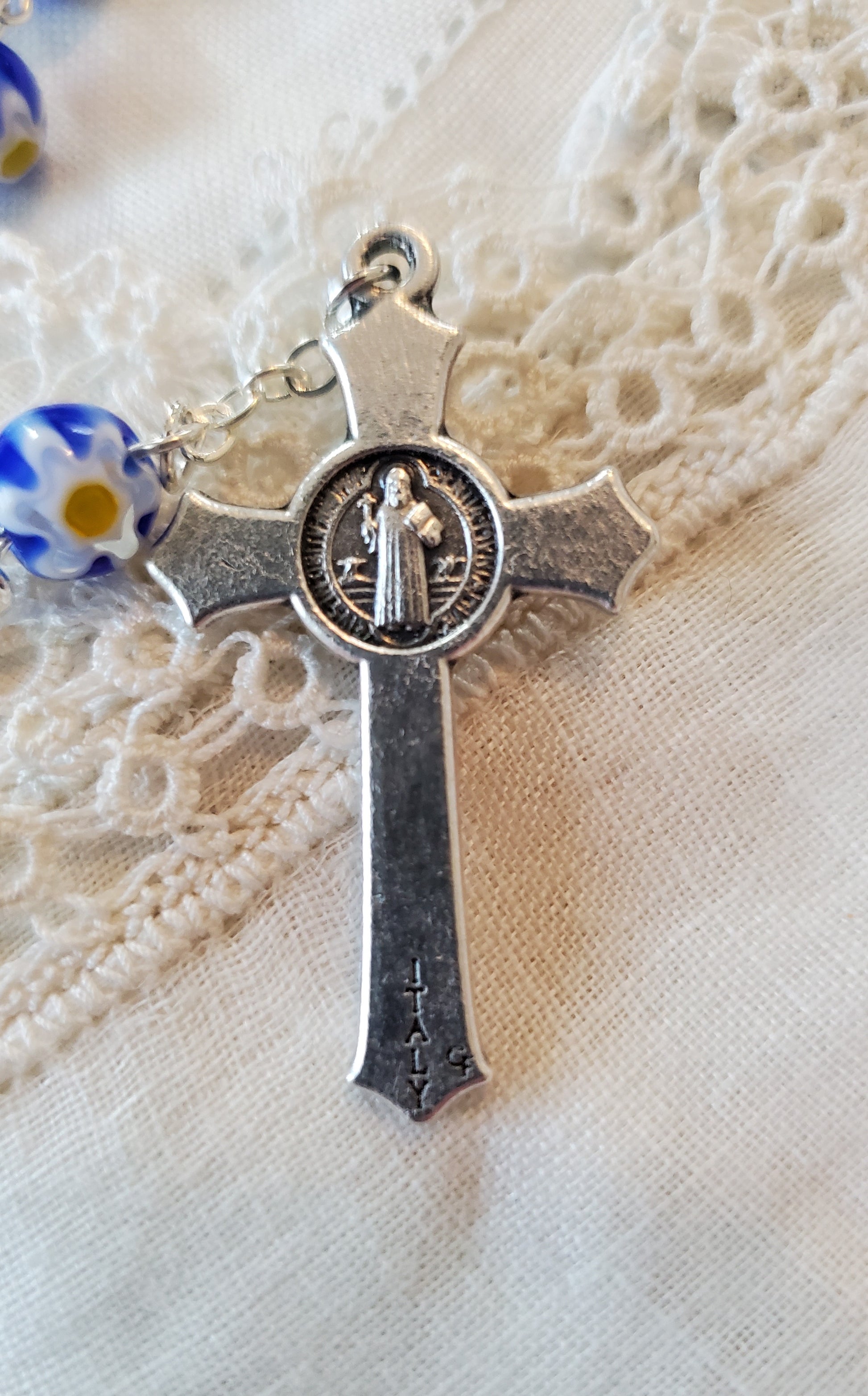 Handmade stunning blue, white and yellow floral millefiori linked car rosary. Ten beautiful blue Murano style millefiori beads with a silver plated lobster clasp. Millefiori is a specialized process in which layers of molten glass are formed into shapes that run the entire length of the bead. They are a more expensive bead but a quite lovely and delightful to look at.