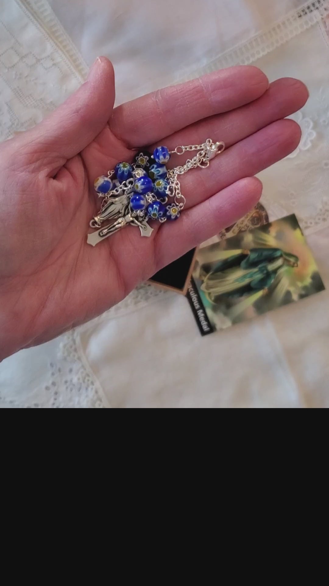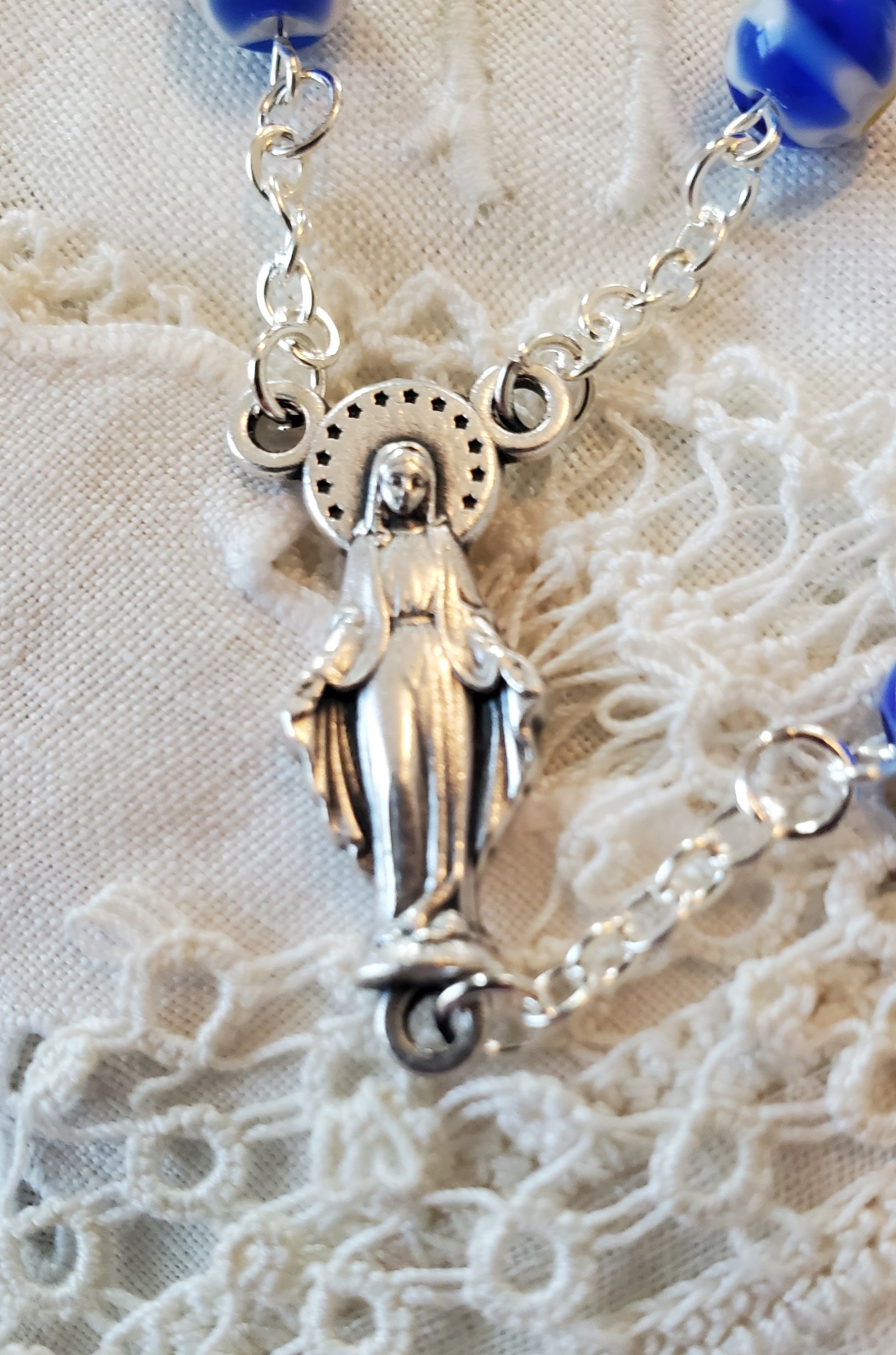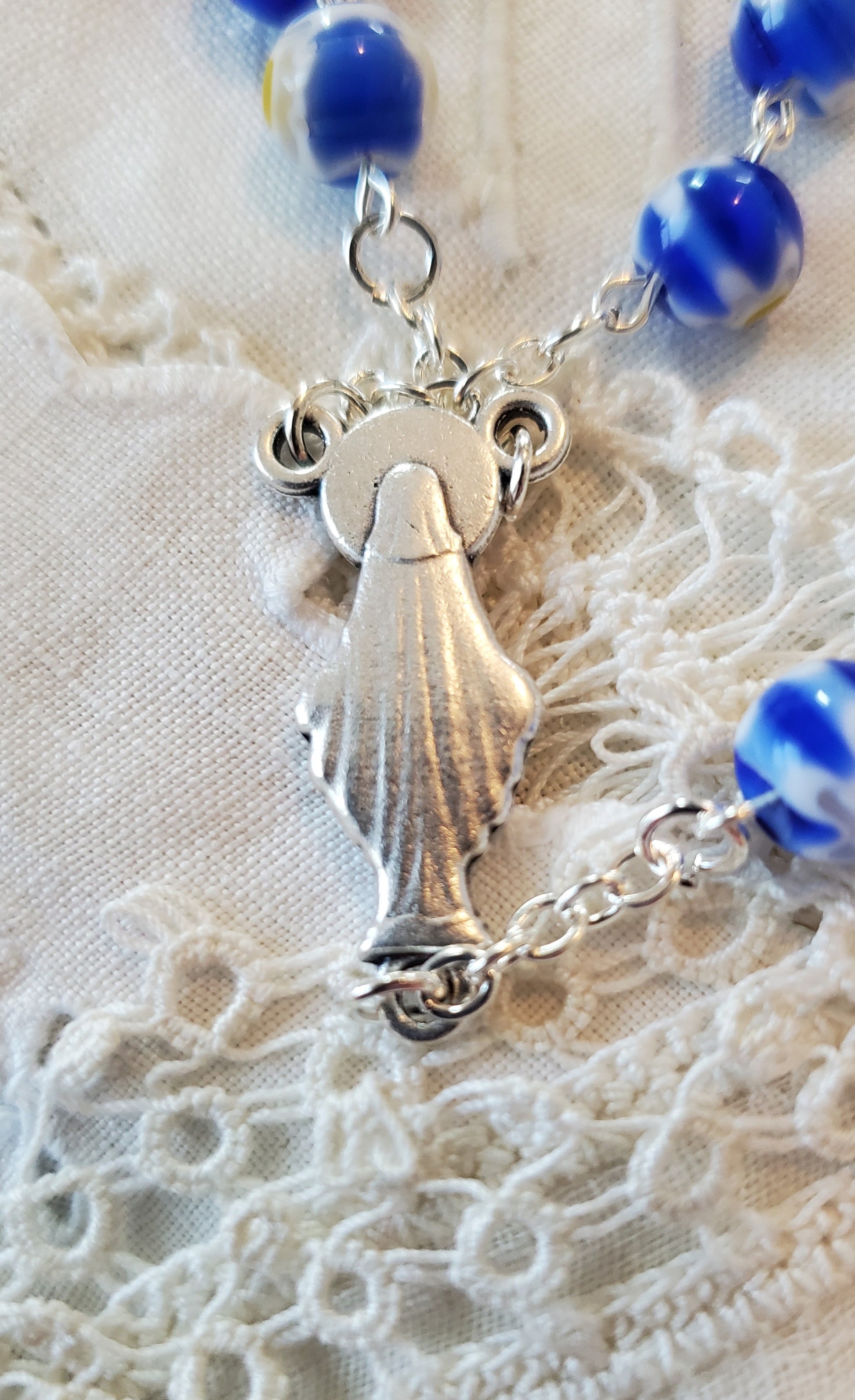 Handmade stunning blue, white and yellow floral millefiori linked car rosary. Ten beautiful blue Murano style millefiori beads with a silver plated lobster clasp. Millefiori is a specialized process in which layers of molten glass are formed into shapes that run the entire length of the bead. They are a more expensive bead but a quite lovely and delightful to look at.