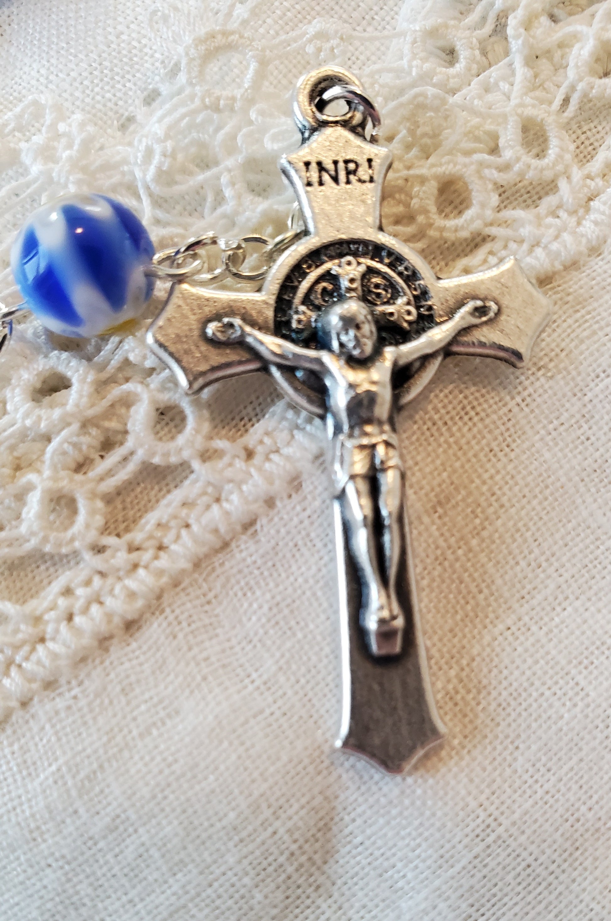 Centerpiece is our Lady of Grace. This two-sided rosary centerpiece feature Mary, the mother of Jesus with 12 stars around her head as described in the book of Revelations 12th chapter. the twelve represent the people of God in the twelve tribes of Israel and the Twelve Apostles. Mary's symbol here is representation of her role in leading people to Jesus, as the dispenser of grace and source of intersession and comfort for all who call upon her. The chain that is used is Rosary chain. Very sturdy. The rosary ends at a flared St. Benedict Crucifix which is a crucifix that has the medal of Saint Benedict in the center, front and back. The medal of Saint Benedict, founder of the Benedictine order. The symbol was approved of for use by the faithful by Pope Benedict XIV in1742. The symbol of Saint Benedict is known for its powerful exorcistic powers to ward off evil. for the believer.