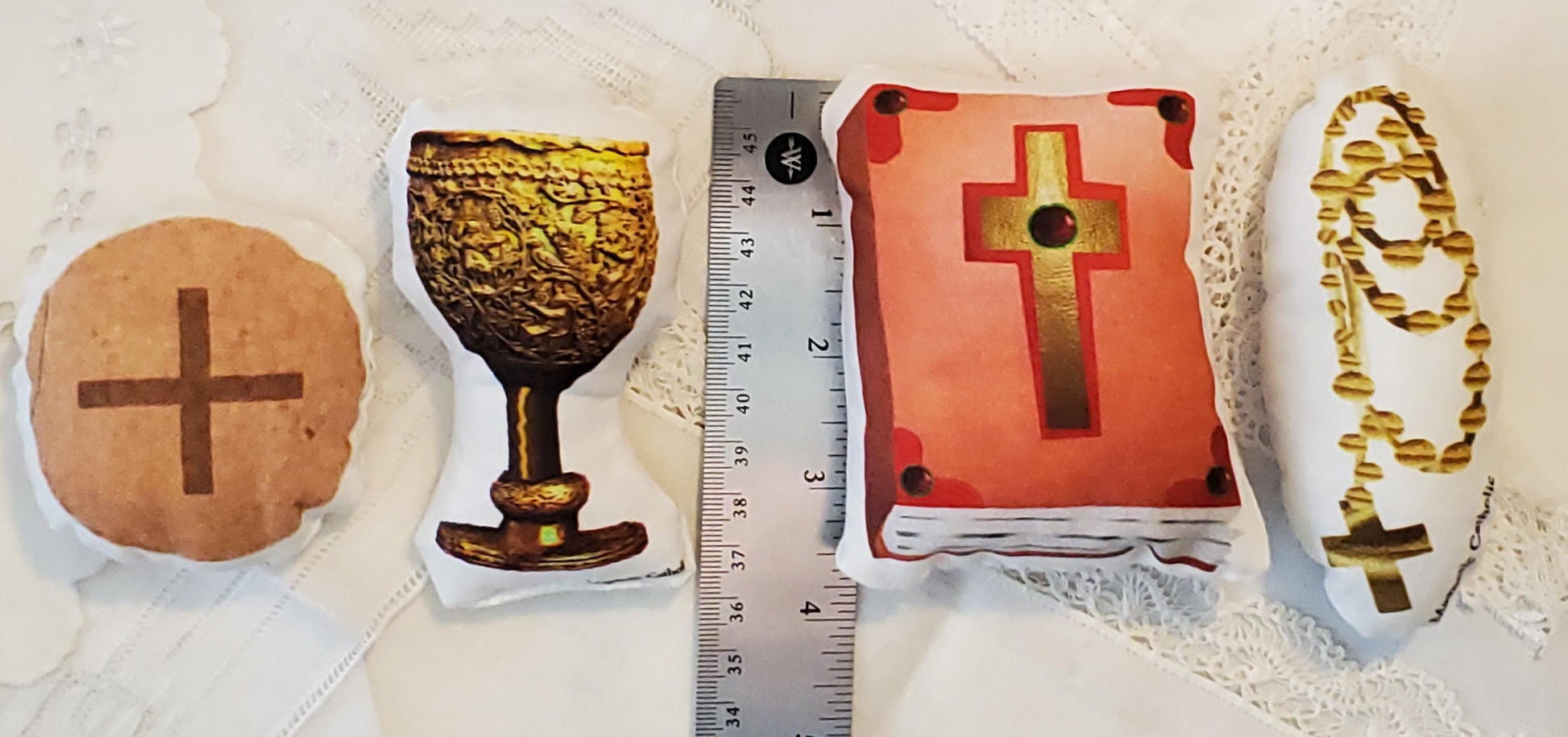 Cute finished Cut and sew soft toys for Mass. Any child or toddler would love this set of toys to play with while attending weekly Mass. Approximately 3" - 4" each these soft toys are replicas of a holy book , a Rosary and the Chalice and Host from the Eucharist. Children will play while receiving gentle instruction on the liturgy.