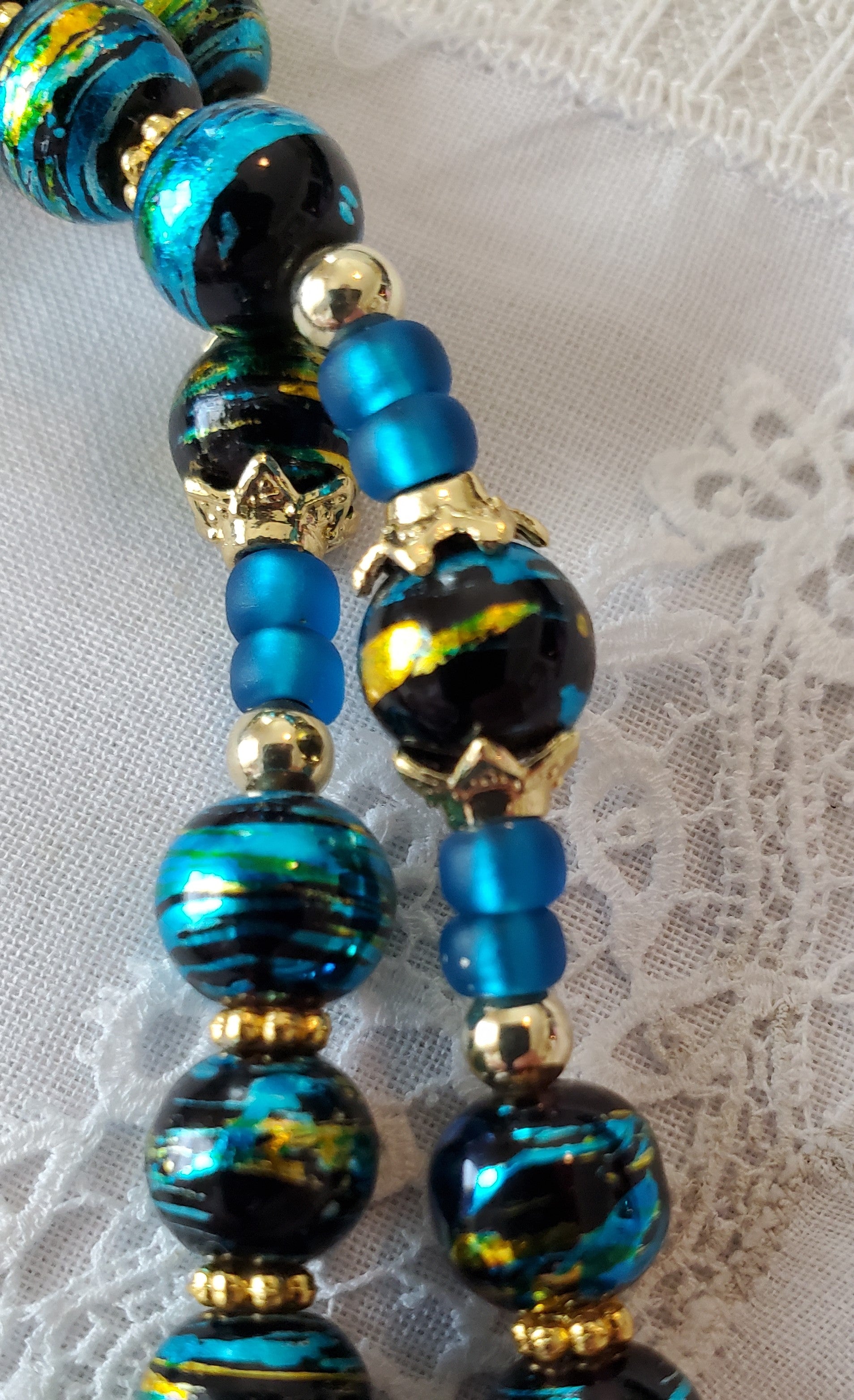 Drawbench Beads: The primary beads are crafted using the drawbench technique, a process in which molten glass is streaked with fine metallic paint (in this case, black, blue, and gold) while still hot, creating a unique, marbled design. These beads have a textured, artistic finish, giving them an eye-catching look with rich, layered colors.