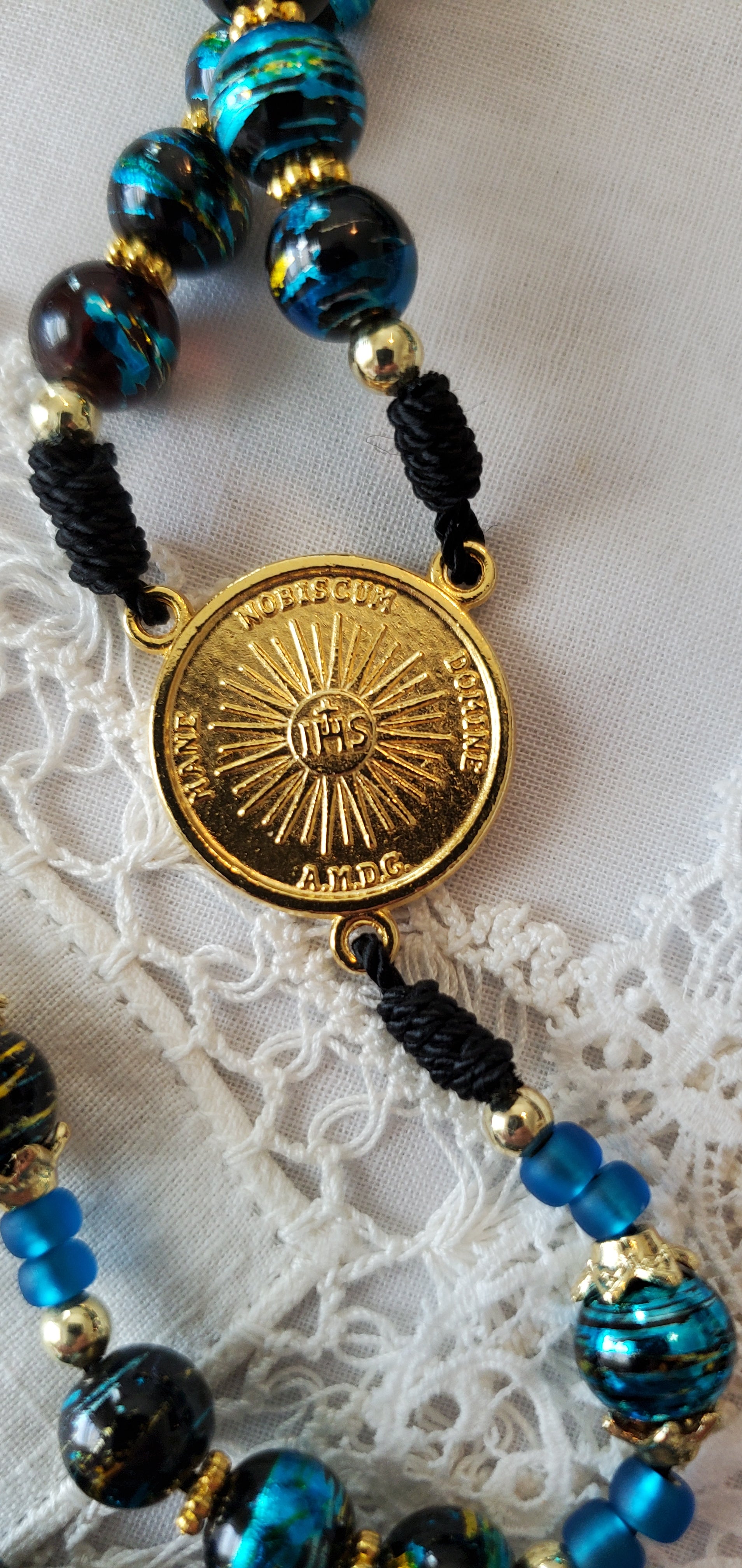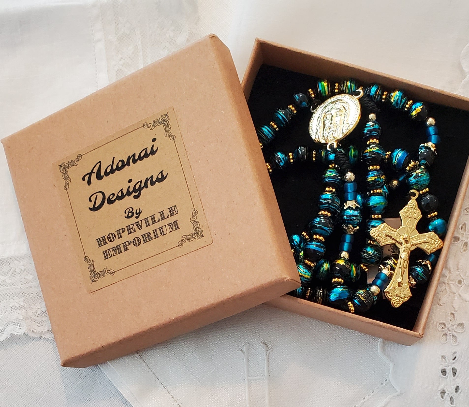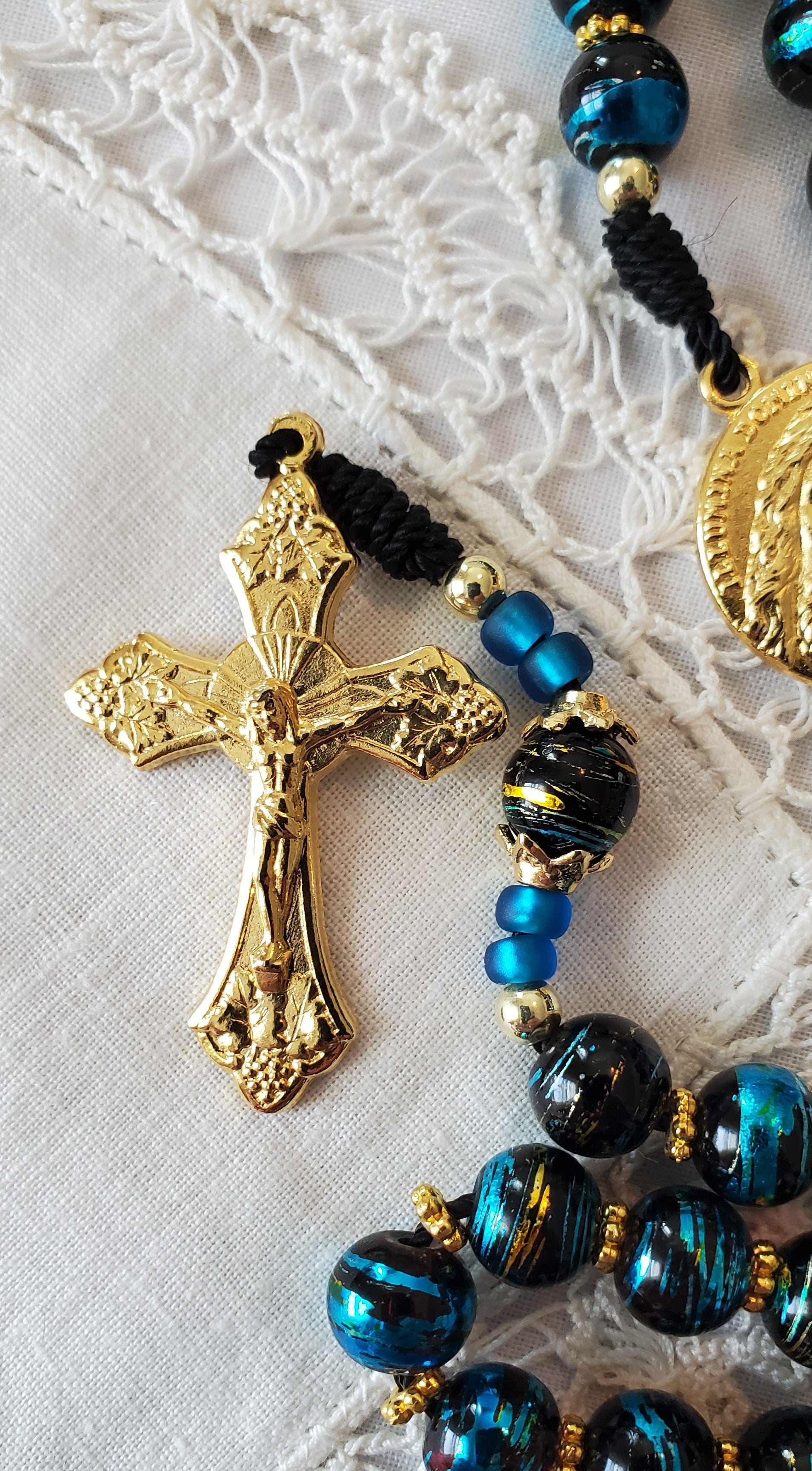 Tags for SEO: Catholic Rosary, Shroud of Turin Rosary, Blue and Gold Rosary, Hand-Knotted Rosary, Silver-Lined Turquoise Toho Spacer Beads from Japan, Drawbench Beads, Black Blue and Gold Drawbench Rosary, Gold Crucifix Rosary, Religious Gift, Catholic Prayer Beads, Handmade Rosary, Elegant Rosary, Italian Beads Rosary, Spiritual Gift, Prayer Beads, Christian Gift, Confirmation Rosary, First Communion Rosary