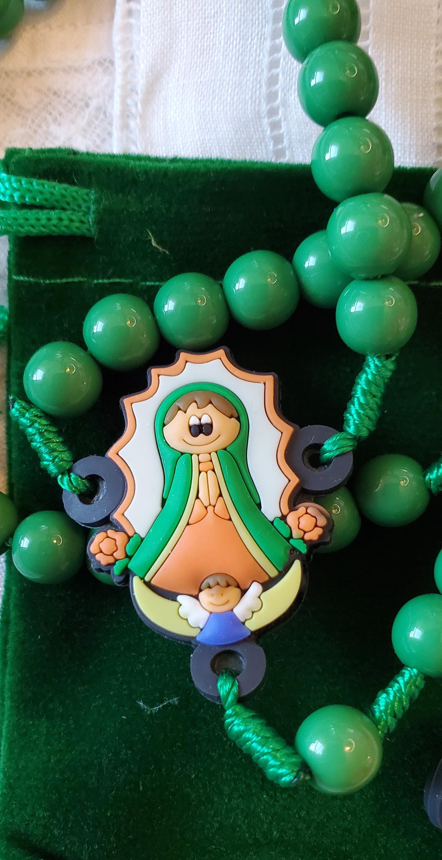 This adorable Tiny Devotions Rosary is made with nylon rosary cord knotted with plastic beads. These are nice quality beads, crucifix, and centerpiece. The Crucifix is a colorful soft focal bead approximately 2" long x 1 3/8". The centerpiece is a cute, soft Our Lady of Guadalupe 1 1/4" x 1". The beads are solid, smooth beads with no mold lines. total length is 15". Rosary overall length is about 18".