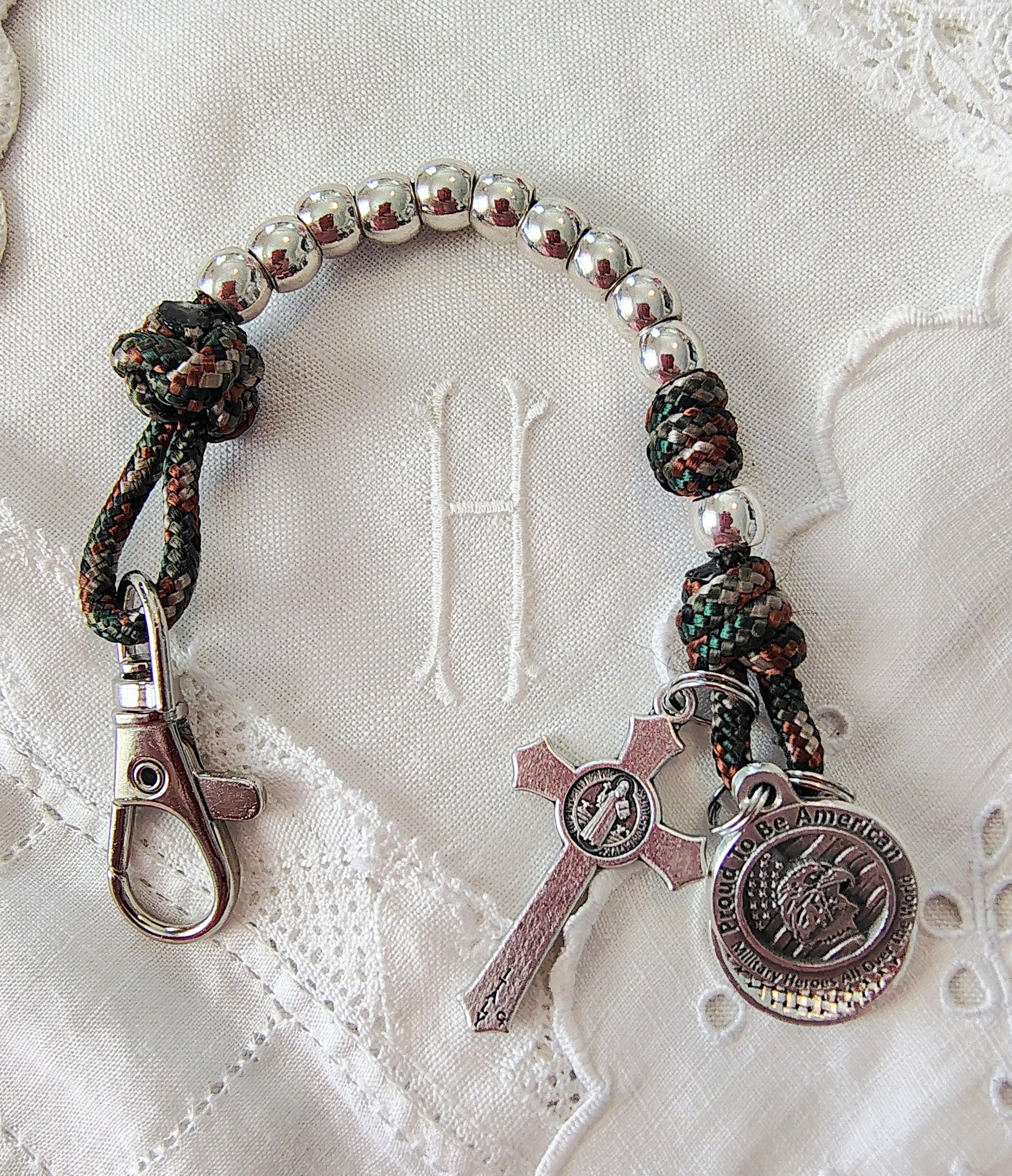 Customizable by branch Military Hand Knotted Paracord Tenner Rosary gift Set Saint Michael, St. Benedict, Warrior Medal, Prayer Cards