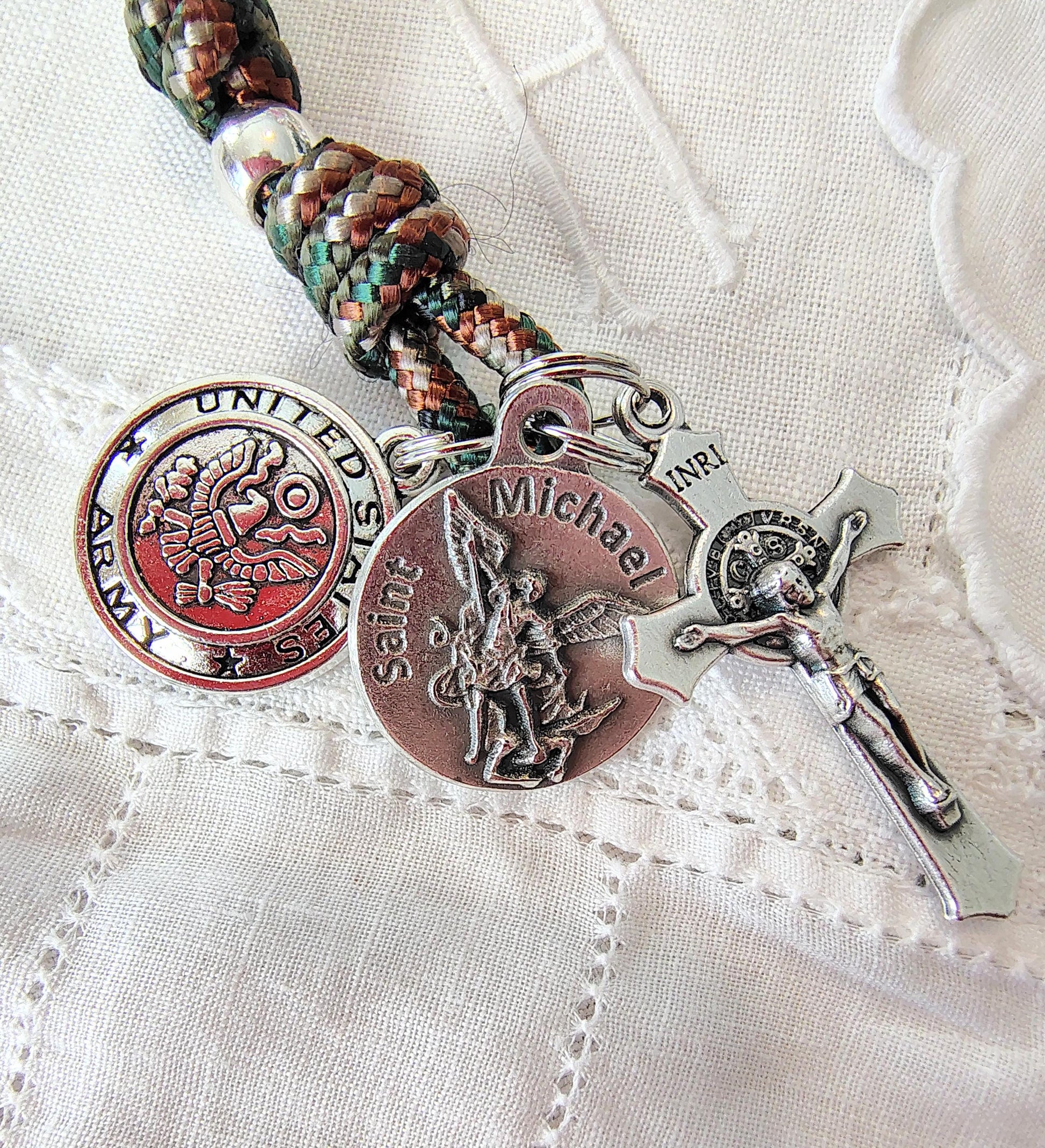 Beautiful and durable hand knotted St. Michael and Tenners Benedict cross Army medal Tenner Rosary.
