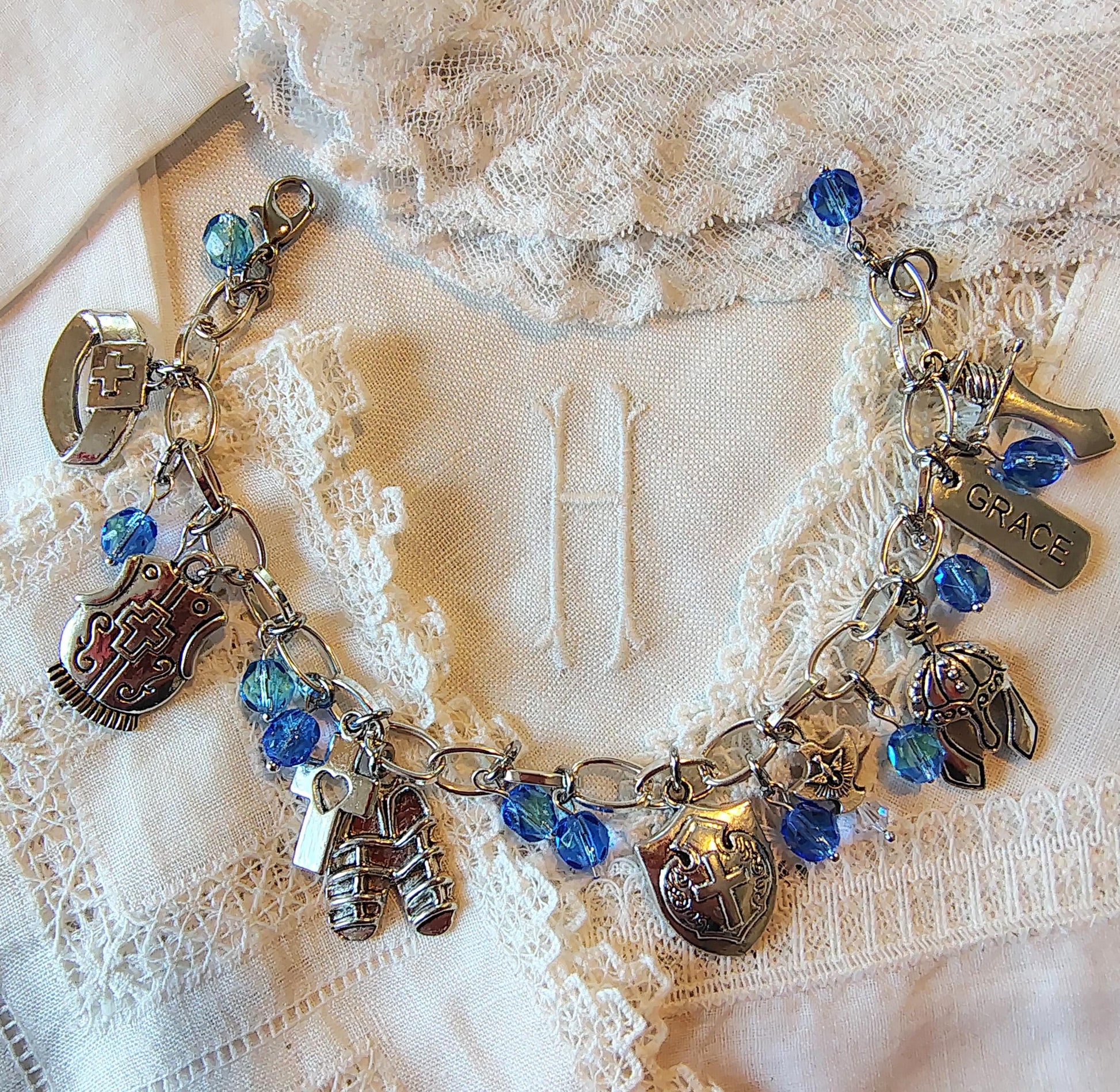 This beautiful bracelet includes a alloy silver tone cross with heart cut out, a word grace dangle and a Holy Spirit charm. All bracelet sizes (see photos), Include charms of the Armor of God as described in Ephesians 6:10-18, The belt of truth, breastplate of righteousness, sandals in readiness of the Gospel, shield of faith, helmet of salvation and sword of the spirit of God. Adorned with high quality fire polished Czech crystal beads in your choice of colors, each individually pinned to the charm bracelet in between the charms. Zinc alloy charm bracelet and charms. Lobster clasp for closure. Can be made to custom sizes. Please see bracelet size chart in ad.