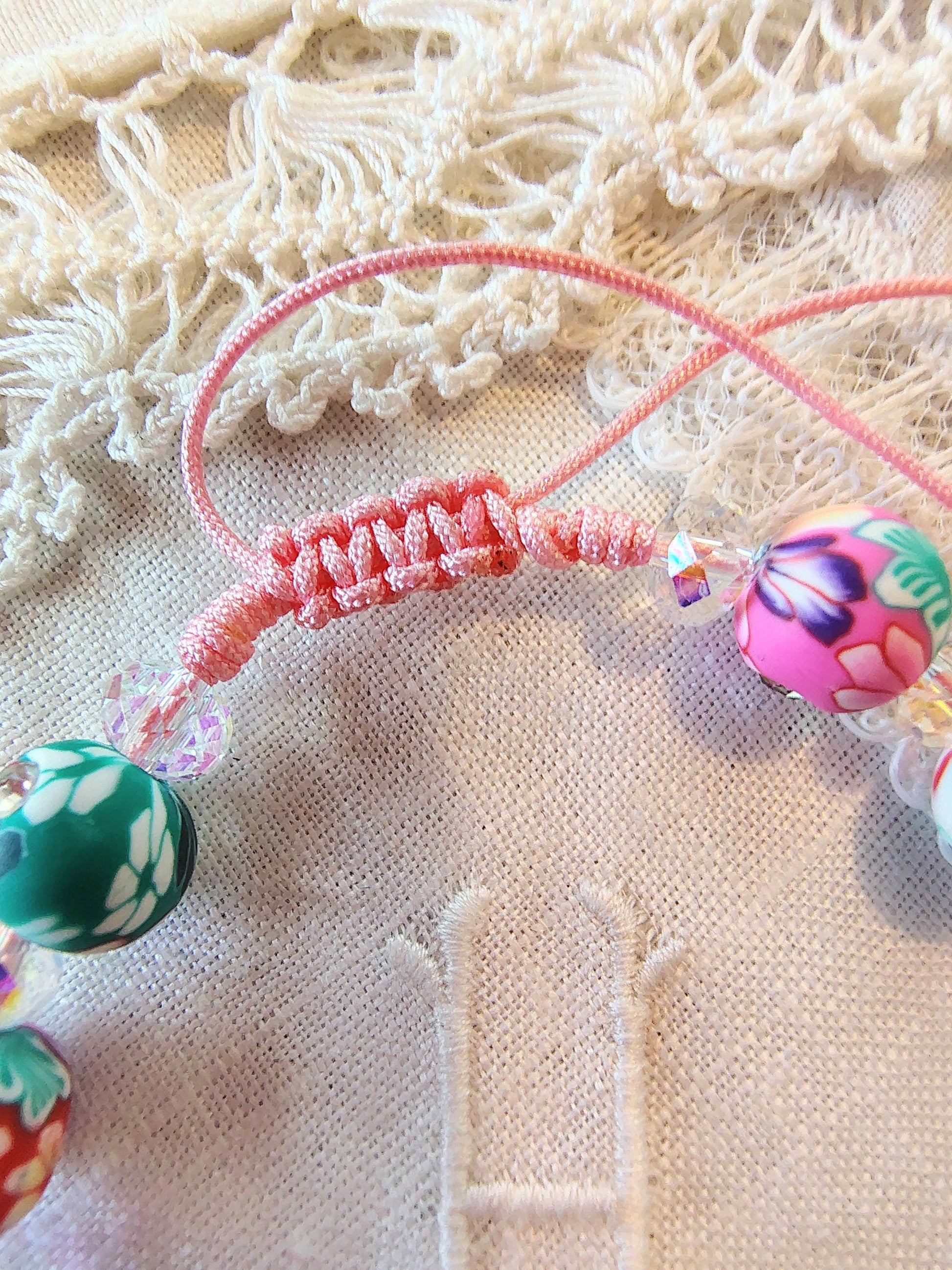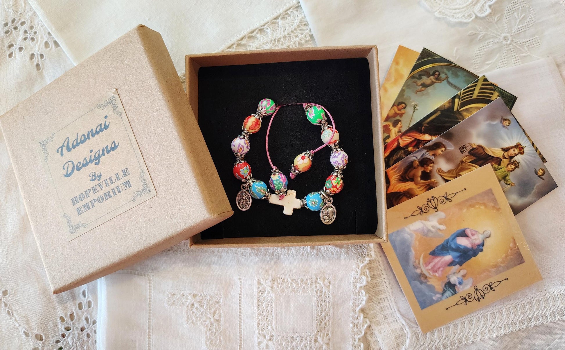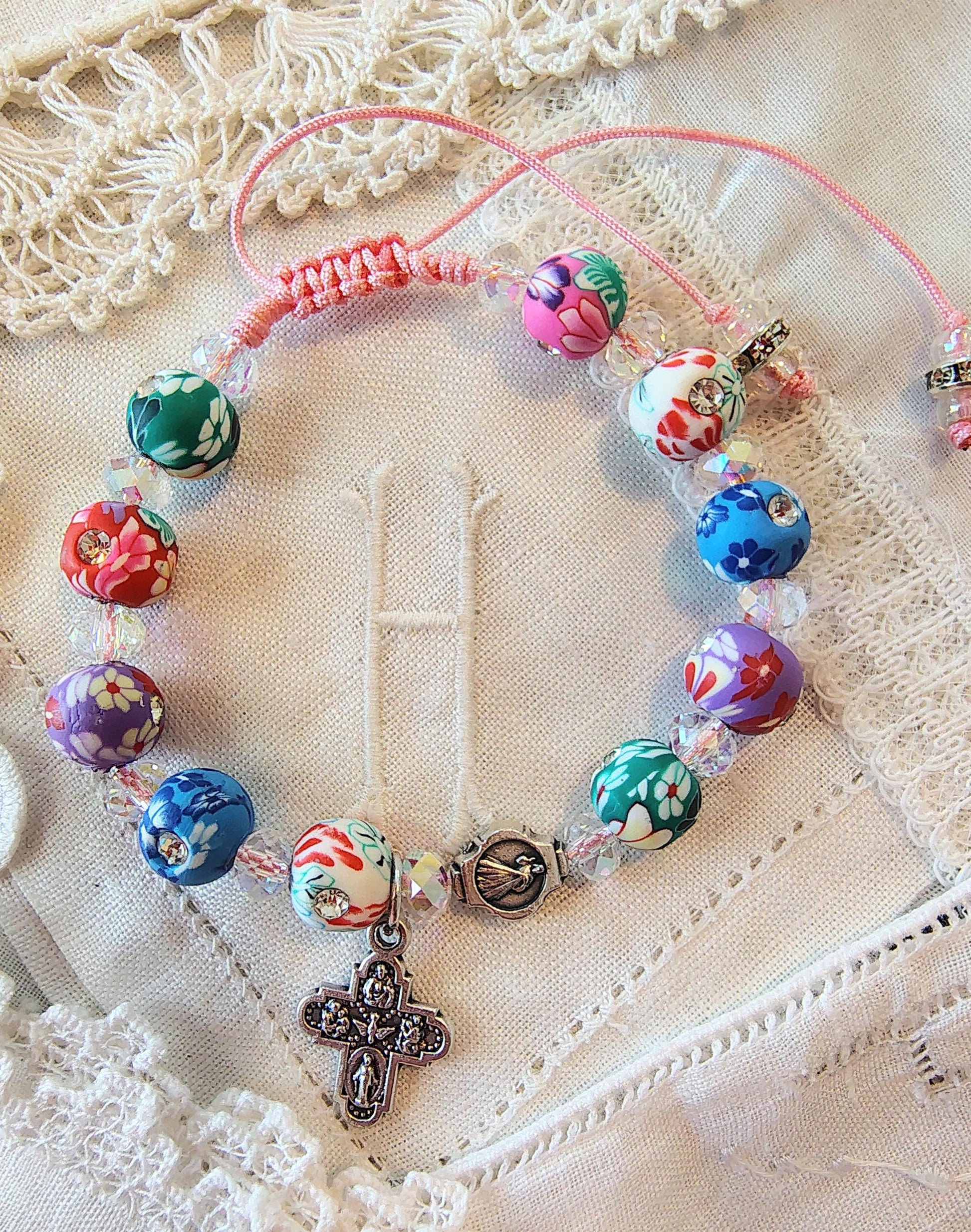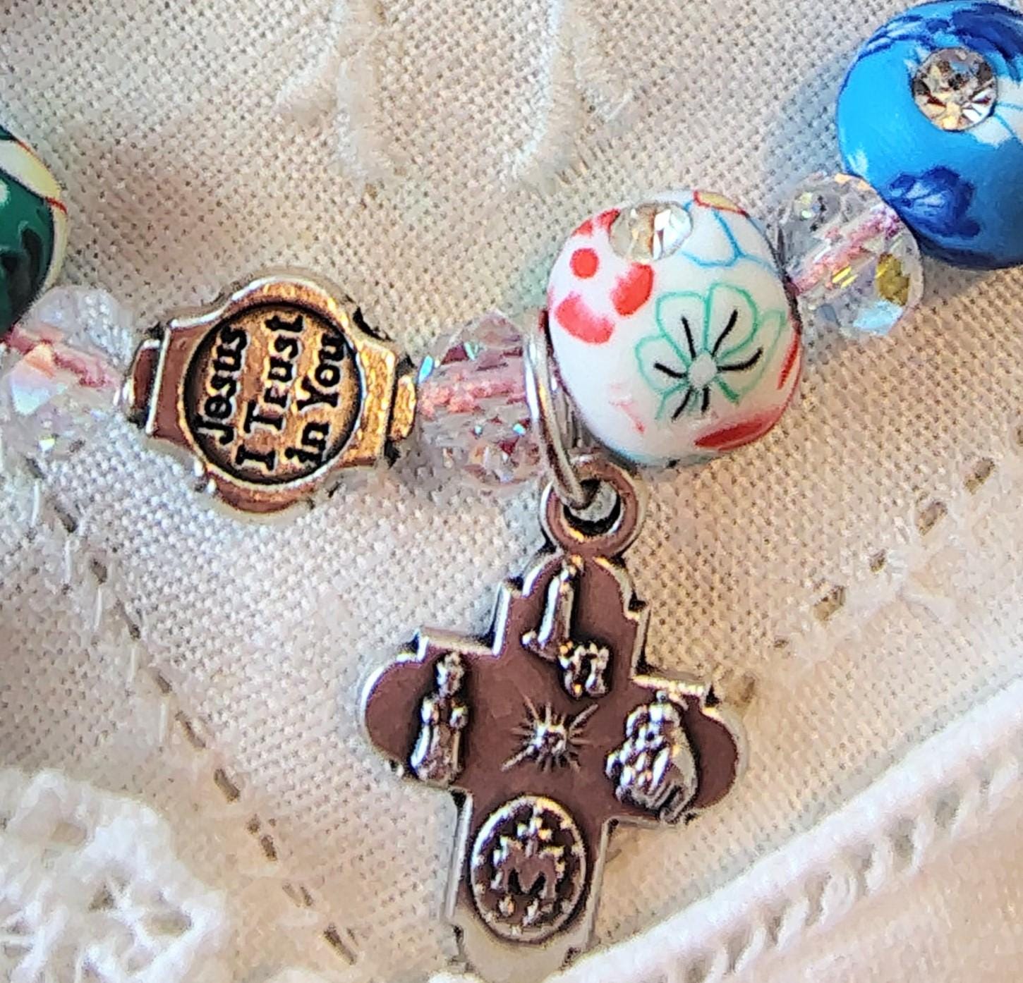 This cute and instructive Rosary bracelet includes 8mm rhinestone studded Polymer clay beads surrounded with 5mm crystal beads AB rondelle beads. The bracelet has a total of ten polymer clay floral beads and a Divine Mercy bead acting as the Our Father bead. It features a five-way scapular medal with the Miraculous Medal, Sacred Heart Medal, St. Christopher medal, the St. Joseph medal with a Holy Spirit Dove in the center. This Cross is 5/8" long by 1/2" wide. It accompanies a 1/4" x 3/8" Divine Mercy bead with the image of Jesus of Divine Mercy on one side and the words from the Divine Mercy image "Jesus I trust in you" on the reverse. This is all finished off by a square slider knot with the dangles finished by two AAA crystal silver plate rondelles wrapped by two Miyuki silver lined glass beads. adjustable from 6" to 9.5" with a secure, beautiful pink slider! If all of that were not enough, this bracelet comes with four prayer cards and that coordinate with the imagery on the bracelet and one handmade card that gives instructions on how to pray a single decade rosary.