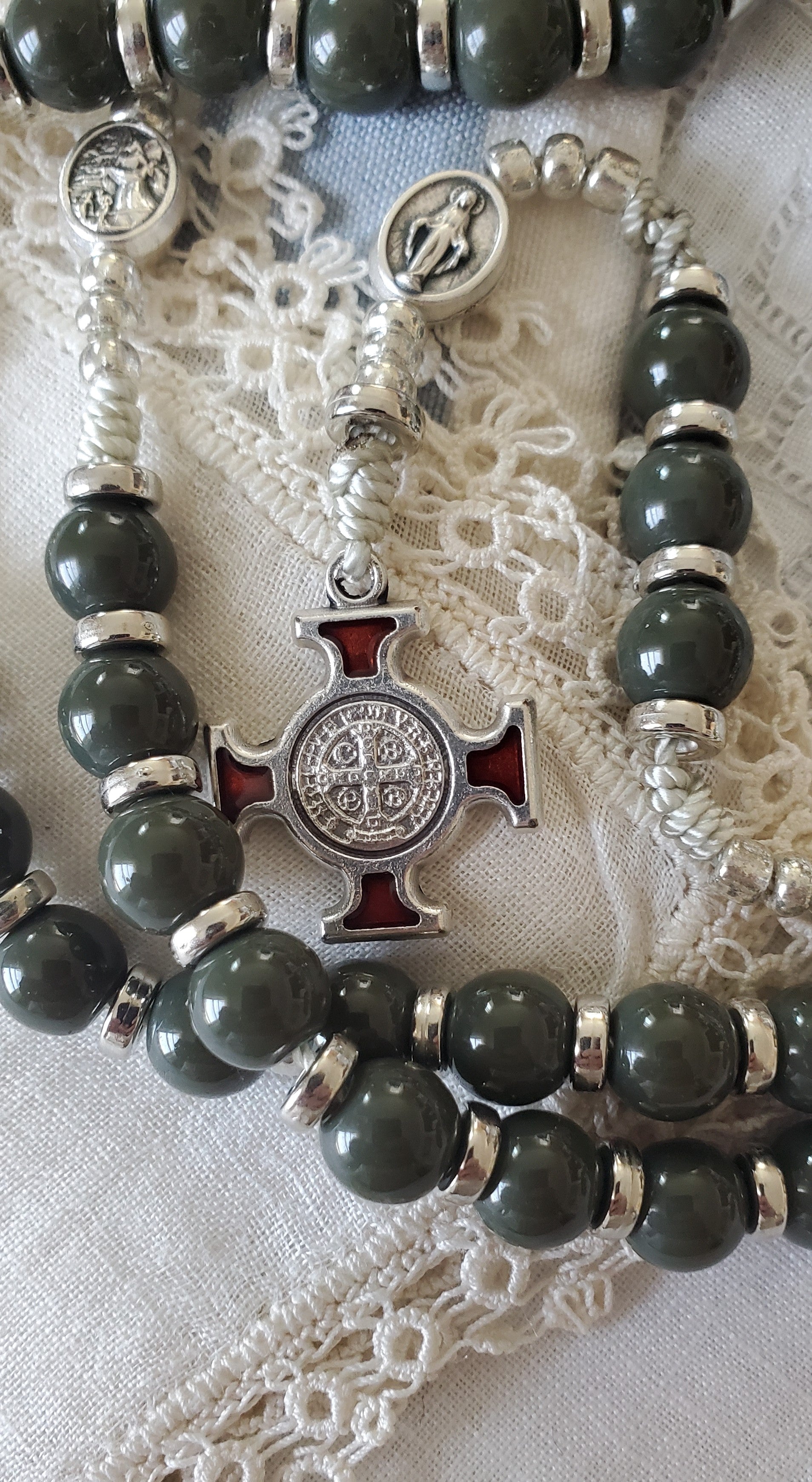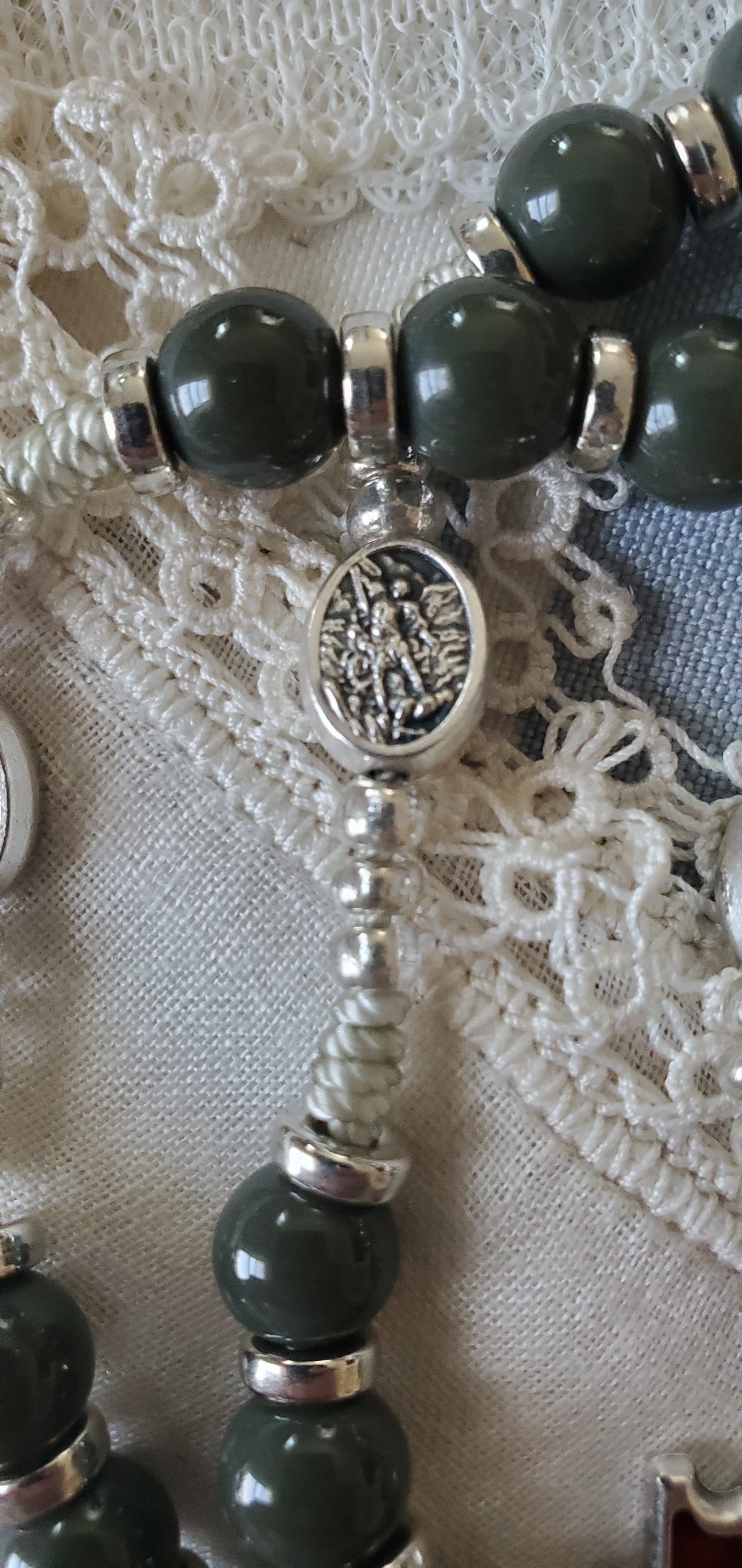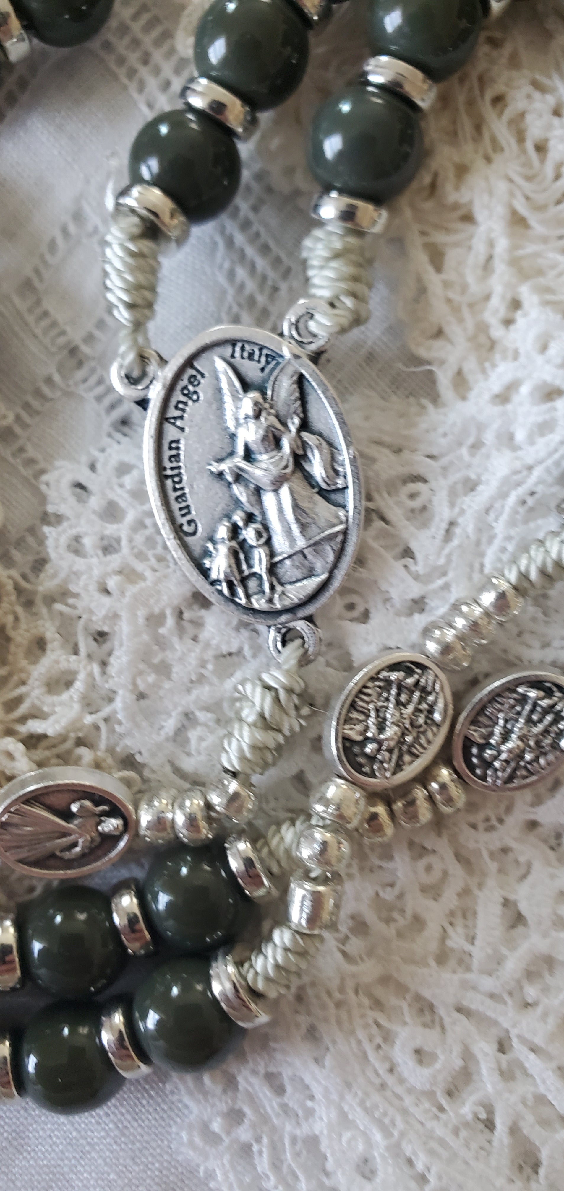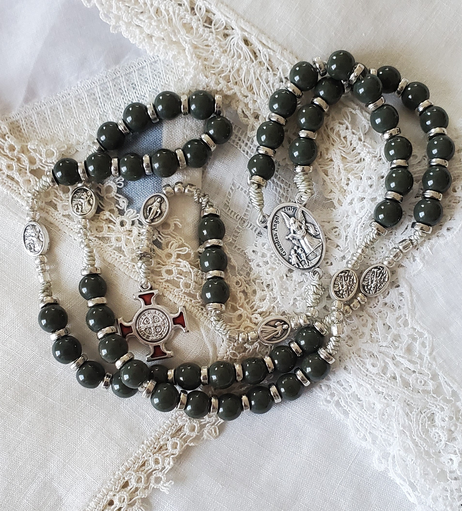 Hand Knotted - "All of The Protections" Rosary. This beautiful rosary has hand knotted Franciscan knots that hold highly polished dark green glass 8mm beads. The rosary begins with a red enameled Saint Benedict Cross. The first and second Our father beads are Miraculous Medal and Divine Mercy beads. Each bead is separated by plastic metallic spacers (to reduce weight as the beads and other medals are heavy). The five decades each have metal Our Father beads with reversable St Michael/Guardian Angel on them. The centerpiece also carried the emblem of Saint Michael the Archangel. The rosary cord is #9 Khaki colored. Each side of the Our Father bead is surrounded by three silver lined clear glass seed beads. This rosary is beautiful, masculine and has a wonderful smooth hand feel and weight. It will come with all of the related Prayer cards. Two are pictured but this rosary will come with 1 each of; Saint Michael the Arch Angel, Guardian Angel, Miraculous Medal, Divine Mercy and St Benedict cards. It will be packed in our signature black velvet lined box to finish off the presentation of this exceptional and deeply meaningful rosary.