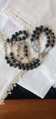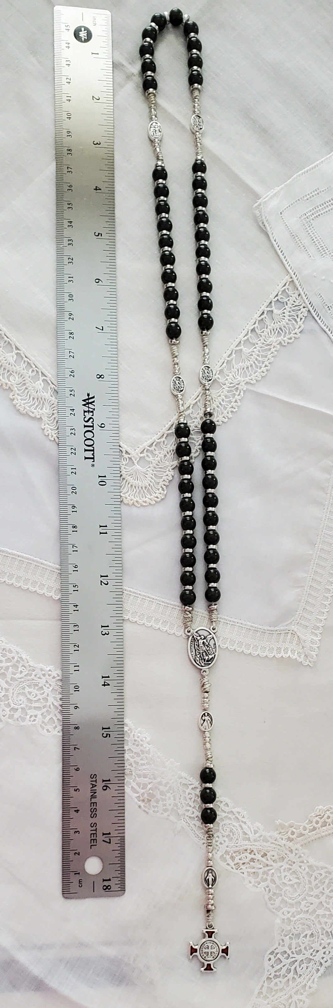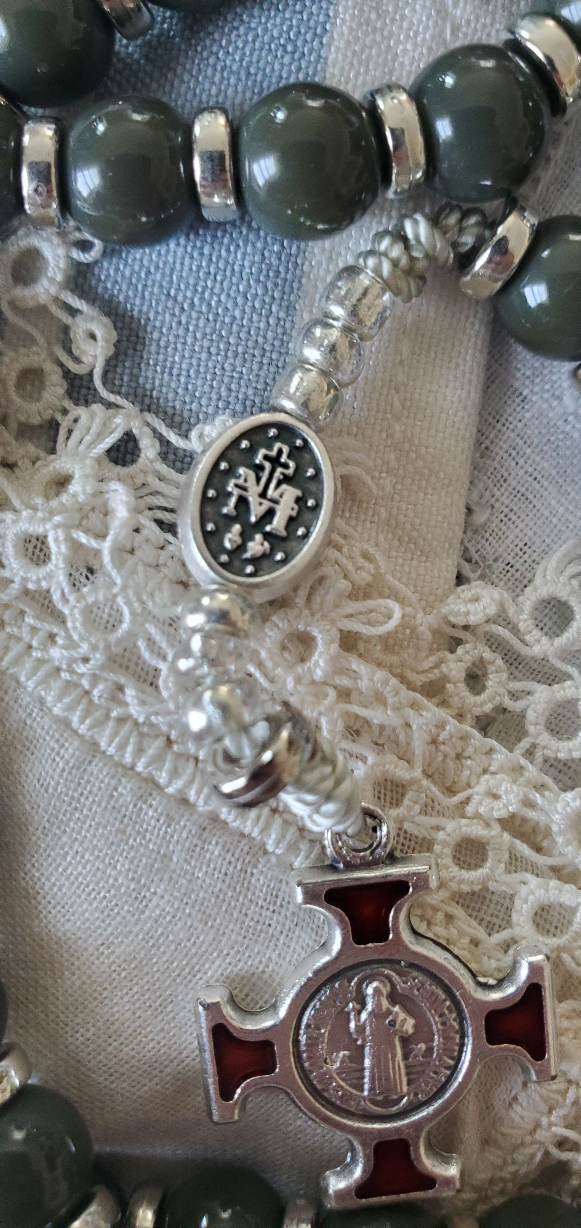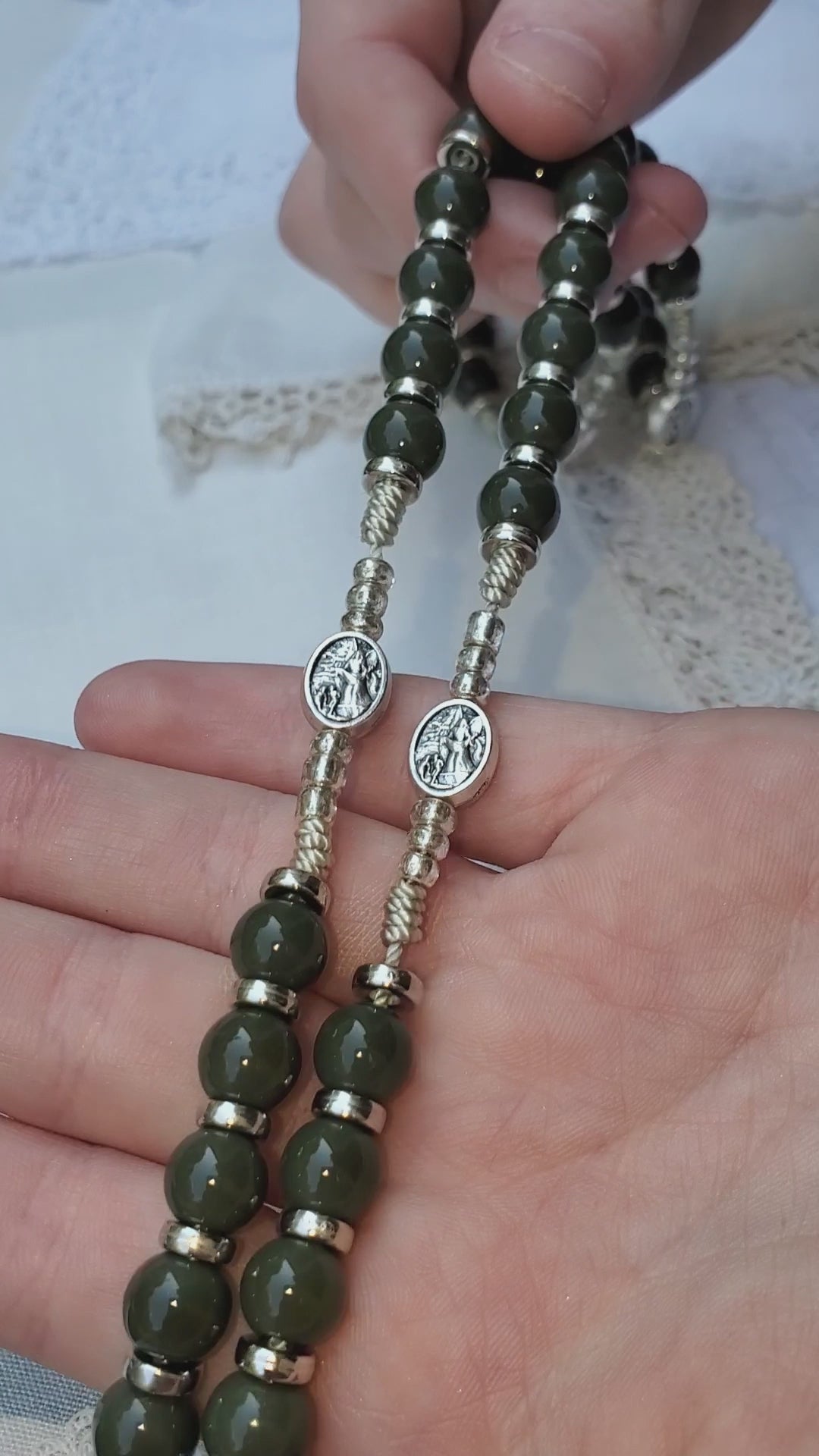 Hand Knotted - "All of The Protections" Rosary. This beautiful rosary has hand knotted Franciscan knots that hold highly polished dark green glass 8mm beads. The rosary begins with a red enameled Saint Benedict Cross. The first and second Our father beads are Miraculous Medal and Divine Mercy beads. Each bead is separated by plastic metallic spacers (to reduce weight as the beads and other medals are heavy). The five decades each have metal Our Father beads with reversable St Michael/Guardian Angel on them. The centerpiece also carried the emblem of Saint Michael the Archangel. The rosary cord is #9 Khaki colored. Each side of the Our Father bead is surrounded by three silver lined clear glass seed beads. This rosary is beautiful, masculine and has a wonderful smooth hand feel and weight. It will come with all of the related Prayer cards. Two are pictured but this rosary will come with 1 each of; Saint Michael the Arch Angel, Guardian Angel, Miraculous Medal, Divine Mercy and St Benedict cards. It will be packed in our signature black velvet lined box to finish off the presentation of this exceptional and deeply meaningful rosary.