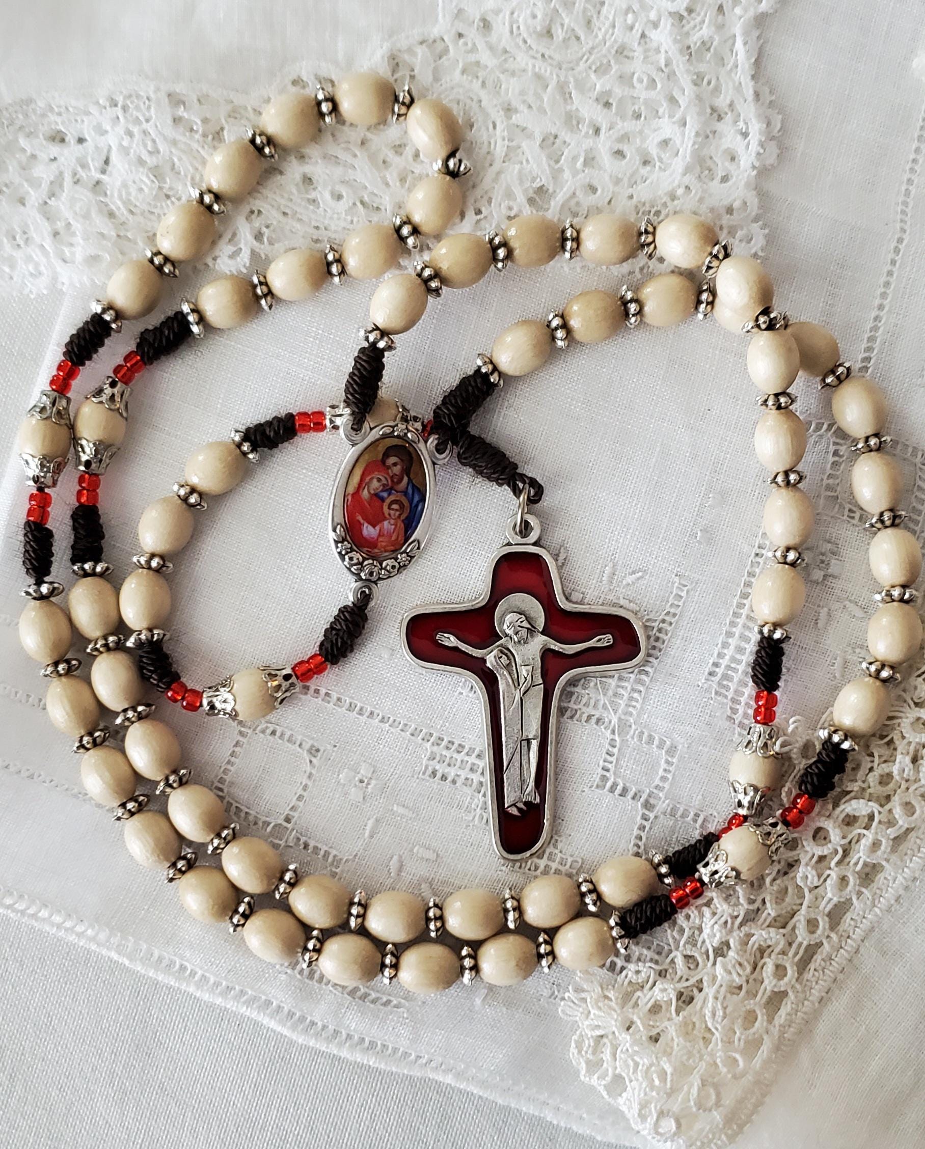 Hand-Knotted Catholic Rosary: Imported Italian Wood Beads, Holy Family Centerpiece and Enamel Mary at the Cross Crucifix prayer card