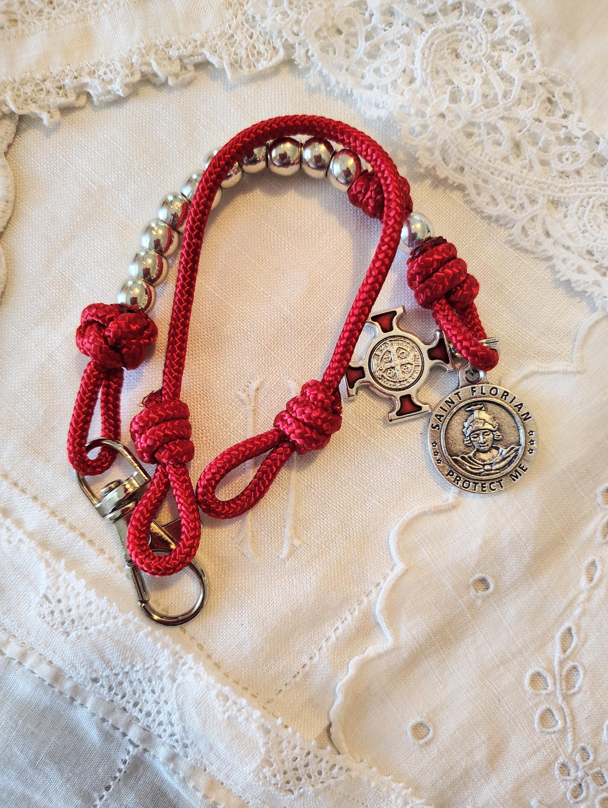 Hand Knotted Paracord St. Florian Tenner Rosary Firefighter Gift imported Italian Medal and Saint Benedict Enamel Cross prayer card gift box