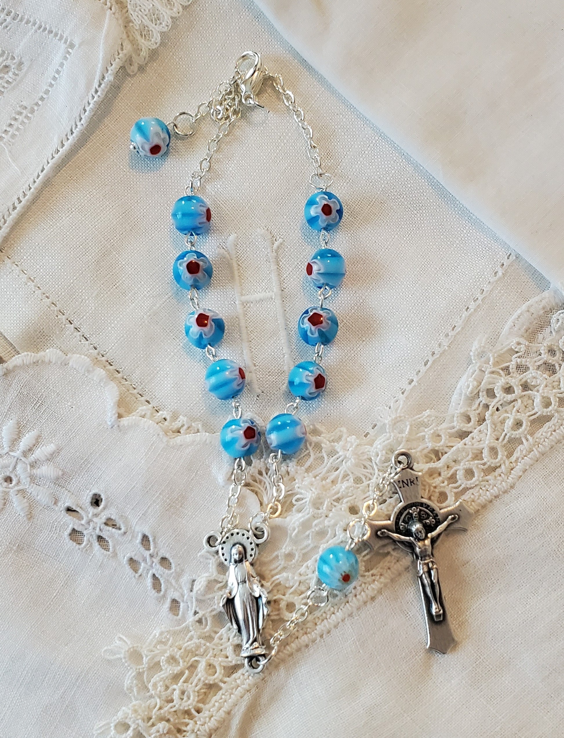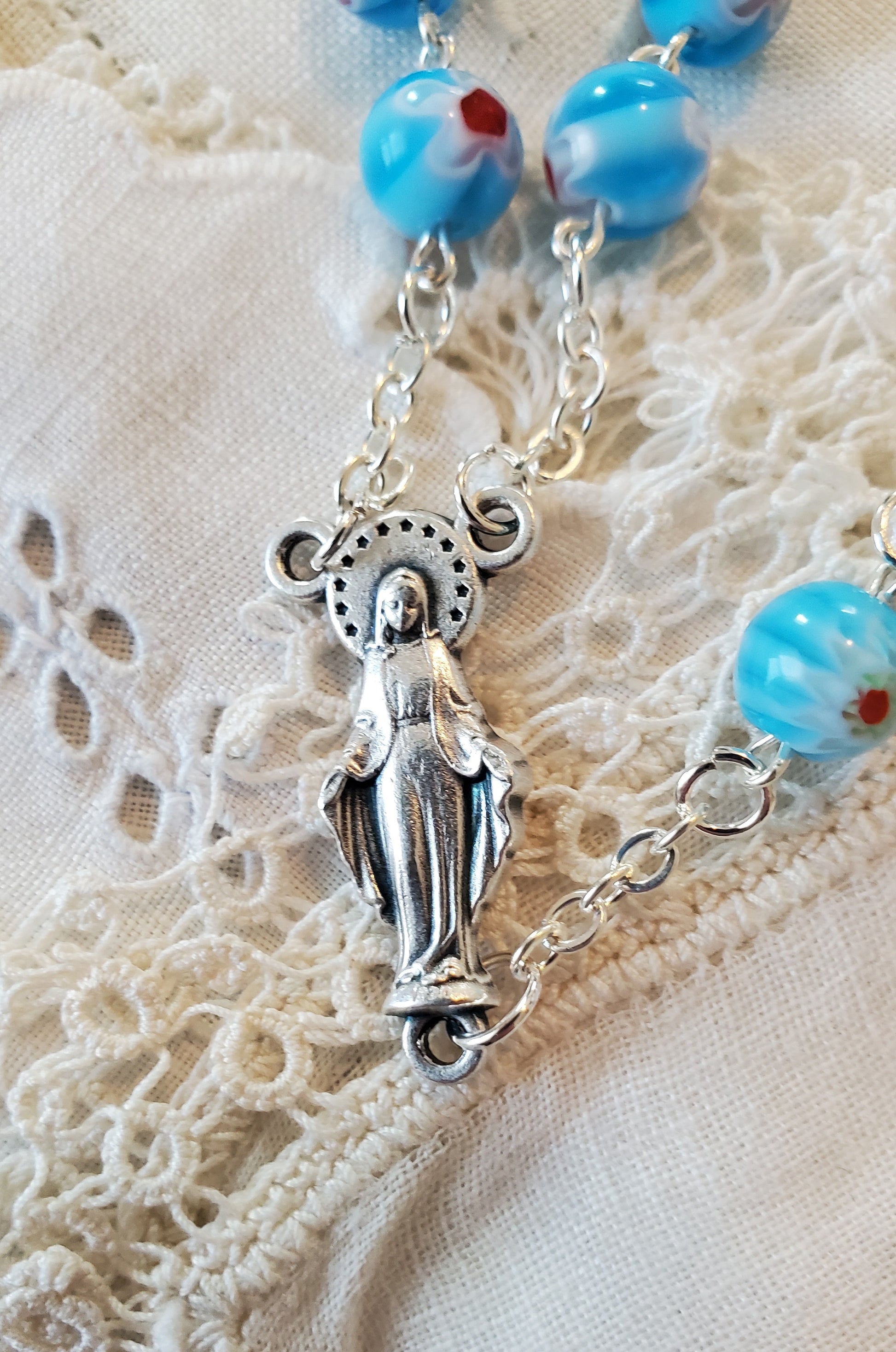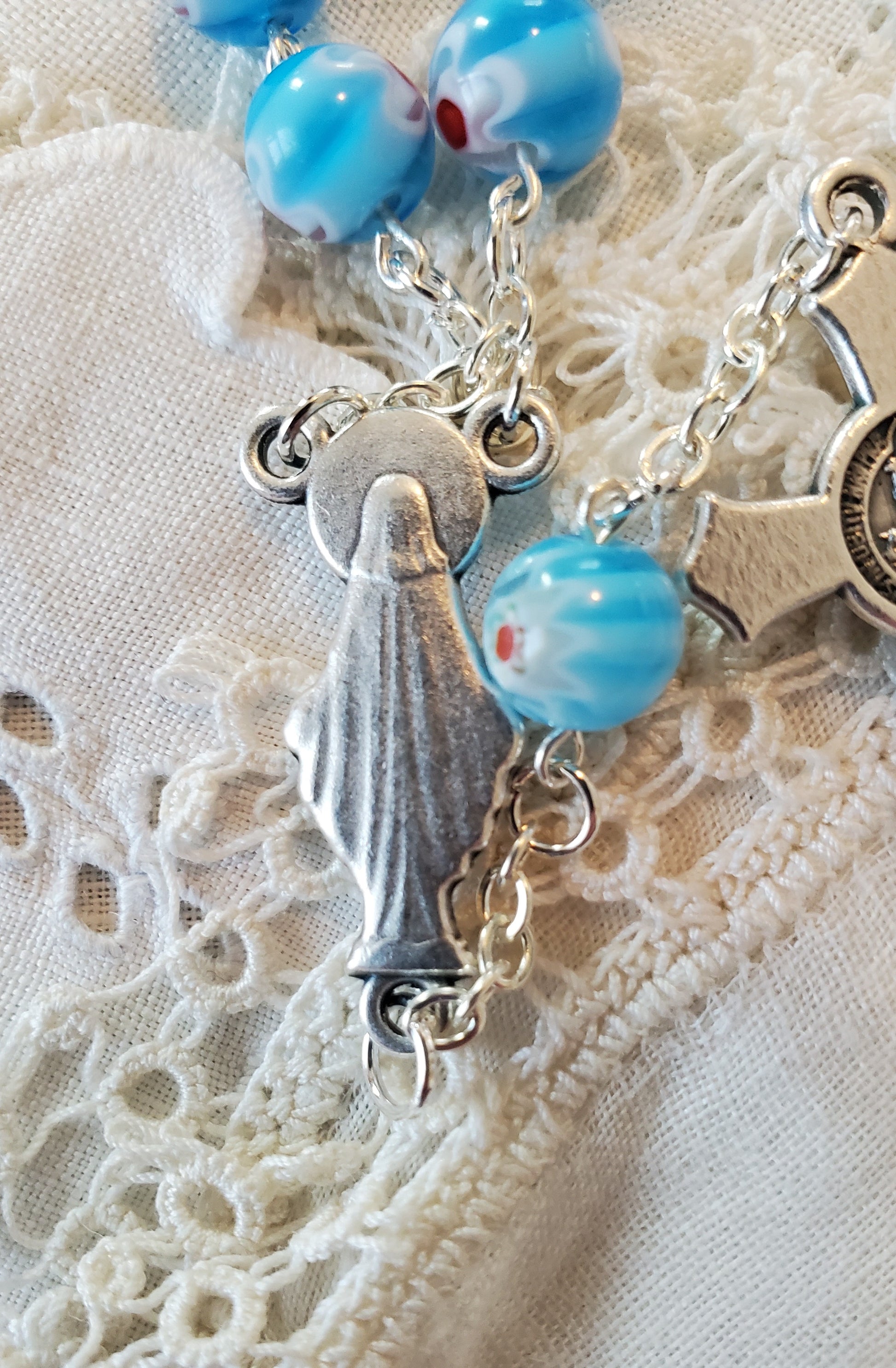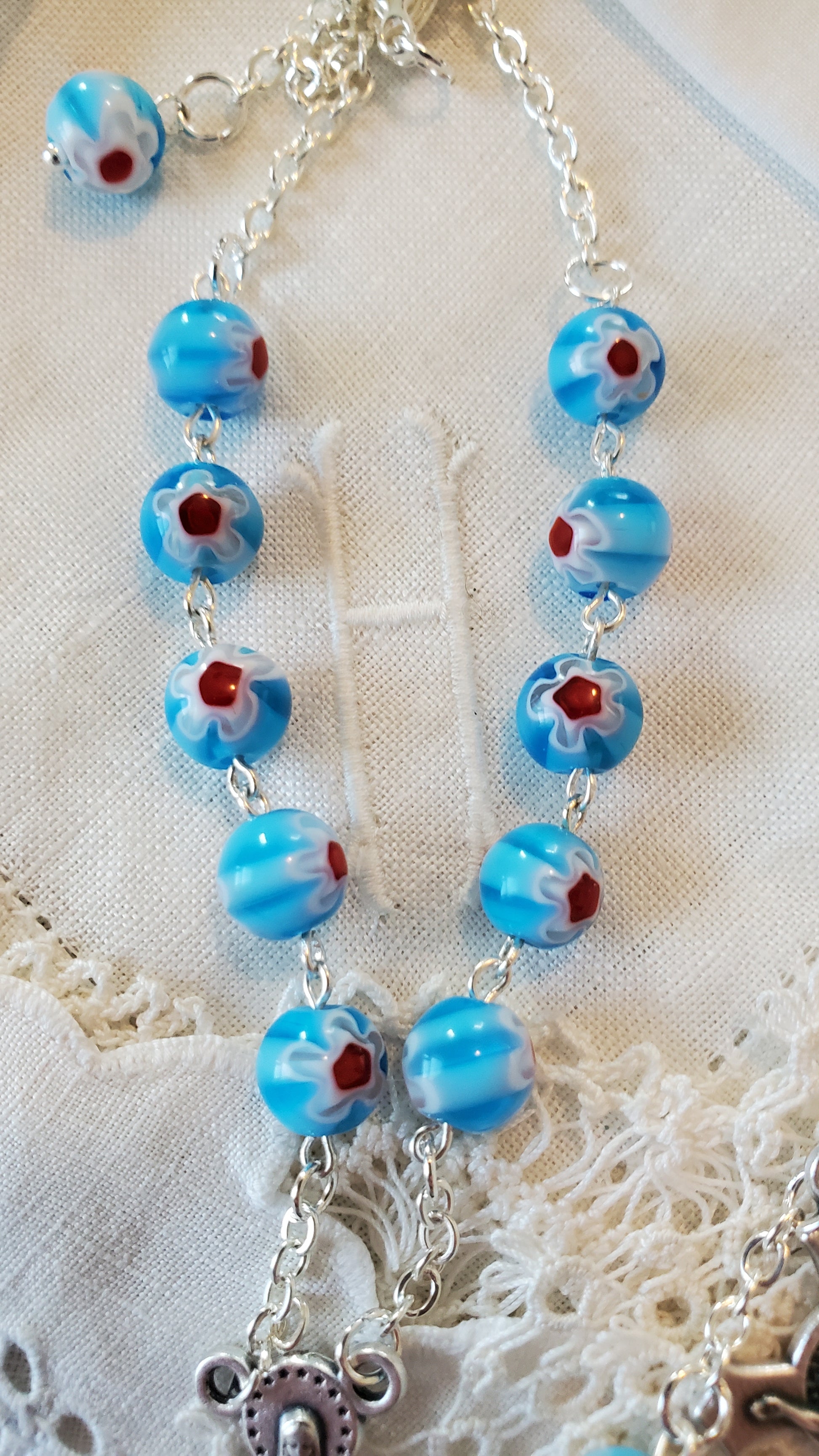Handmade stunning blue, white and yellow floral millefiori linked car rosary. Ten beautiful blue Murano style millefiori beads with a silver plated lobster clasp. Millefiori is a specialized process in which layers of molten glass are formed into shapes that run the entire length of the bead. They are a more expensive bead but a quite lovely and delightful to look at.