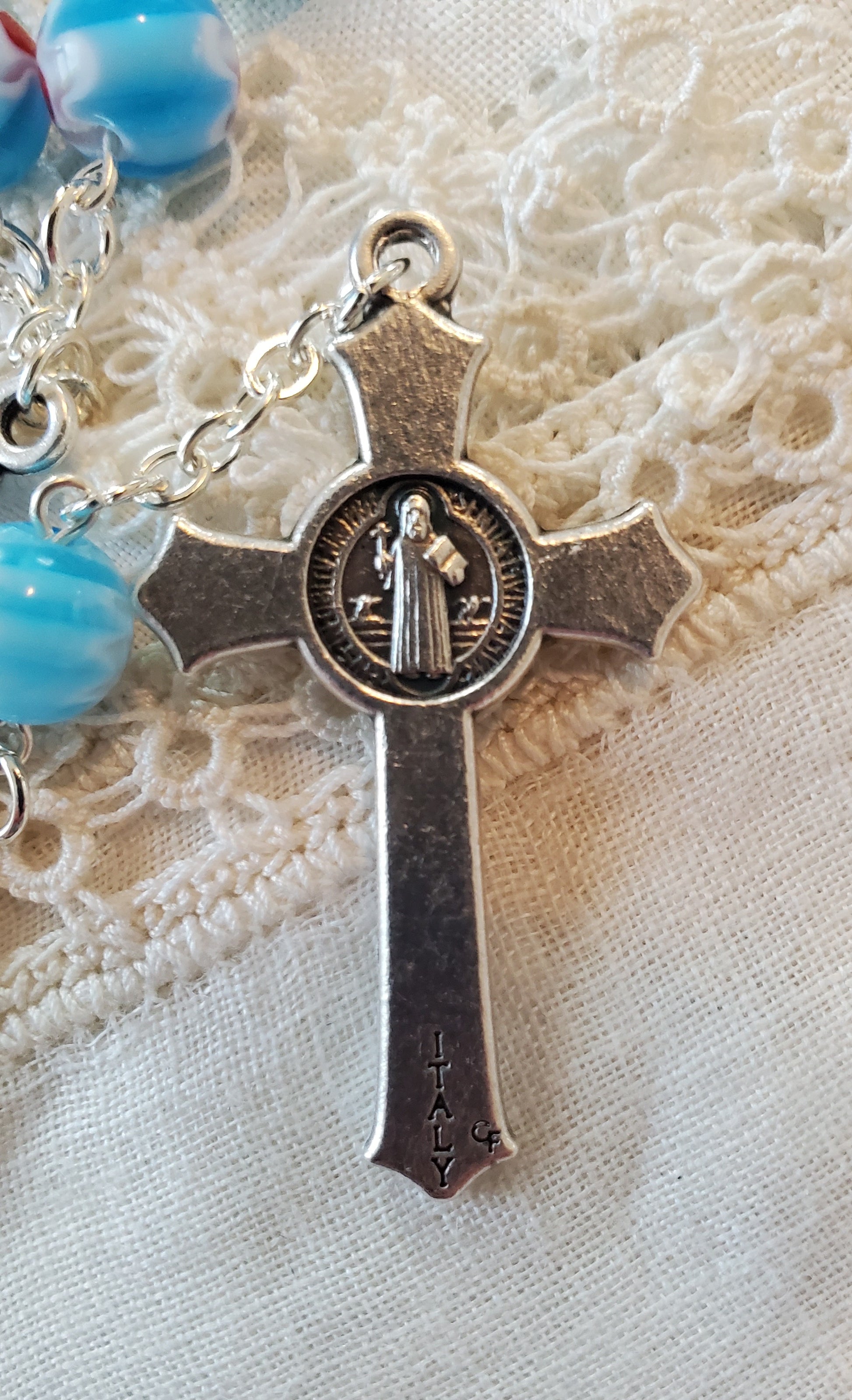 Centerpiece is our Lady of Grace. This two-sided rosary centerpiece feature Mary, the mother of Jesus with 12 stars around her head as described in the book of Revelations 12th chapter. the twelve represent the people of God in the twelve tribes of Israel and the Twelve Apostles. Mary's symbol here is representation of her role in leading people to Jesus, as the dispenser of grace and source of intersession and comfort for all who call upon her. The chain that is used is Rosary chain. Very sturdy. The rosary ends at a flared St. Benedict Crucifix which is a crucifix that has the medal of Saint Benedict in the center, front and back. The medal of Saint Benedict, founder of the Benedictine order. The symbol was approved of for use by the faithful by Pope Benedict XIV in1742. The symbol of Saint Benedict is known for its powerful exorcistic powers to ward off evil. for the believer.