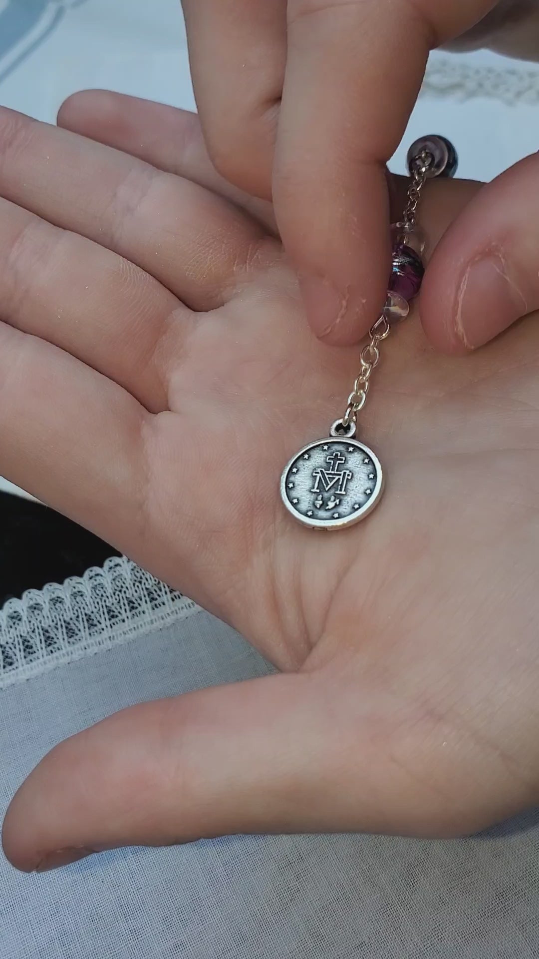 These purple, silver and blue drawbench meads are just mesmerizing! The hand linked Tenner ends in a round Zamac Alloy silver tone Miraculous Medal imported from Italy. Zamac is a zinc-based alloy that is nickel safe. Drawbench beads are stunning. They are manufactured by colors and metallic materials being deposited on the glass while it is still in its molten state. They are more expensive, but worth it! There are ten 8MM beads that are each highlighted by 6 mm glass rondels on each side of the beads. This flexible Rosary can be used loose as a pocket rosary, be used as a car Rosary by hanging on a shifter or other handles or linked together with the Lobster clasp that is attached to be worn as a bracelet. The Our Father bead and the 1/2" Miraculous Medal with inscription in Latin complete the Bracelet. The medal is imported from Italy. The overall length is 10 1/4". When clasped, the bracelet size is 8".