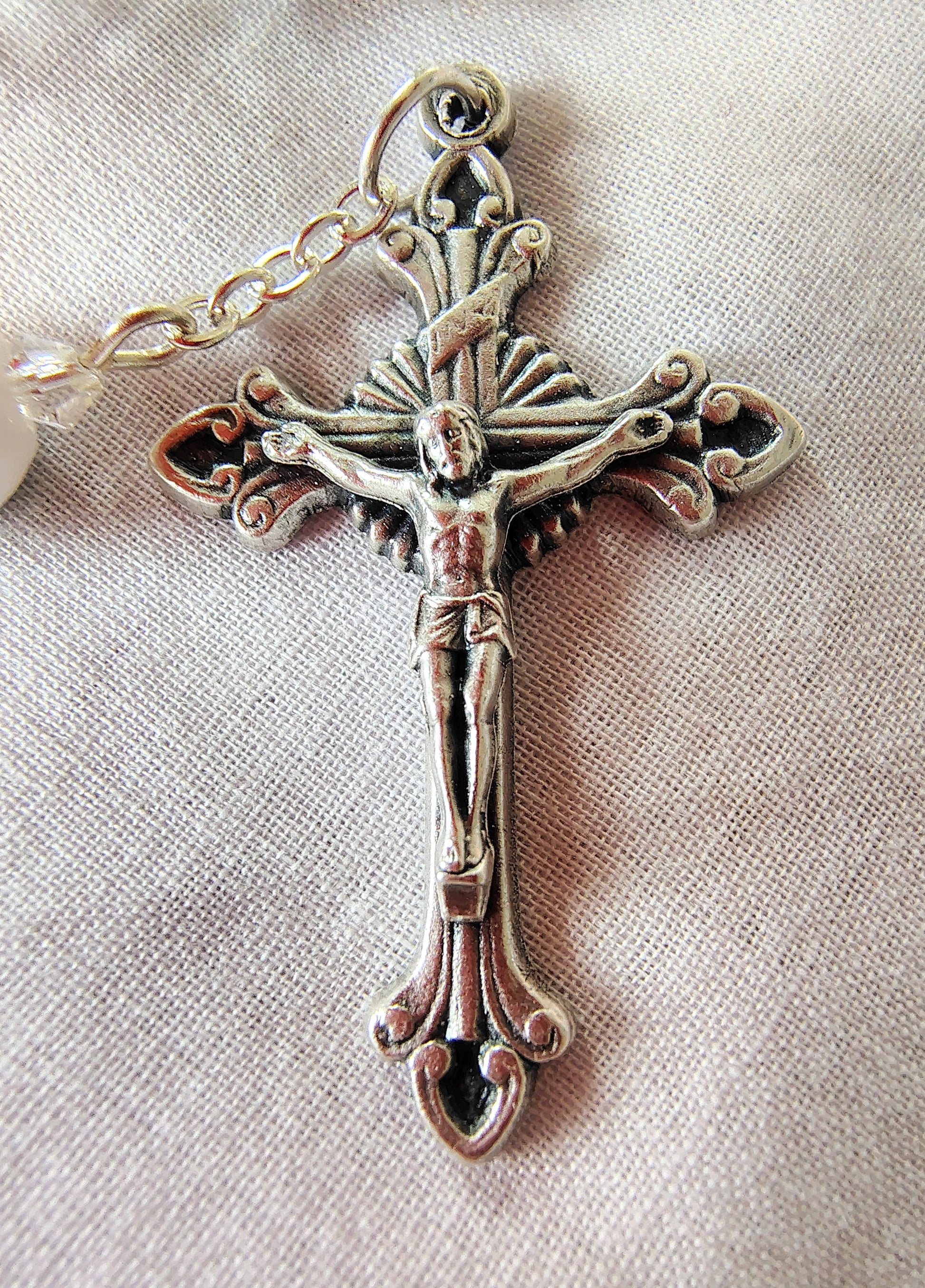 The Rosary is 9" overall and has a Flared Crucifix 1 3/4" x 2" which is beautifully detailed. The rosary centerpiece is a 1/2" Saint Benedict Medal and the end of the Our Father bead which hangs from the Rosary top is a small Fatima Medal. All of the medals and crucifix are imported from Italy. The set will come with a Saint Julie card and how to pray a one-decade rosary card, both handmade and another bonus card that explains what the symbols on the Saint Benedict medal mean.