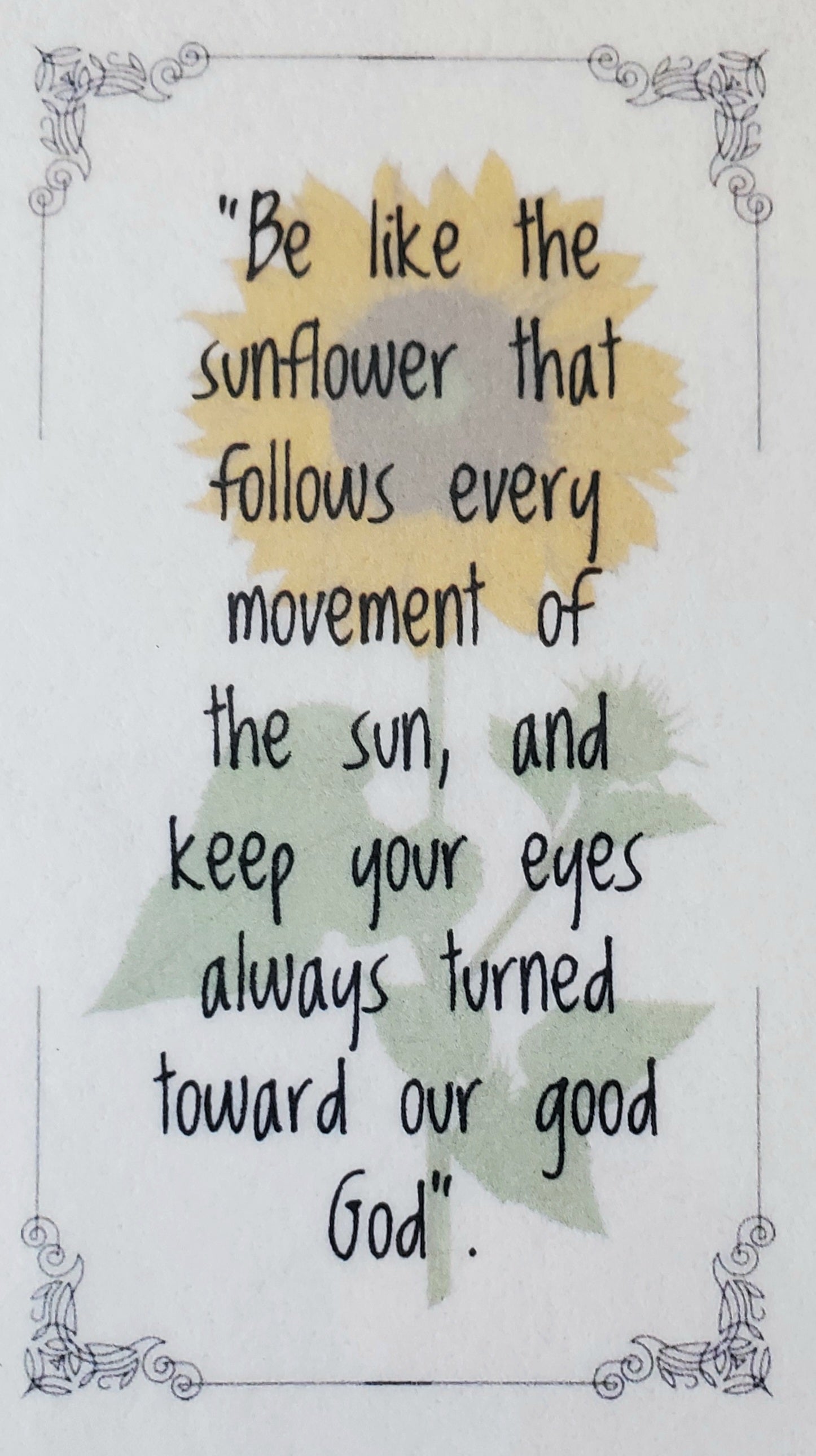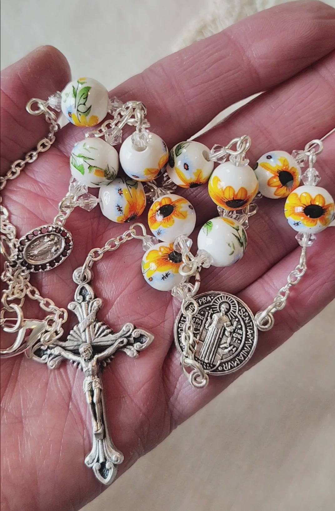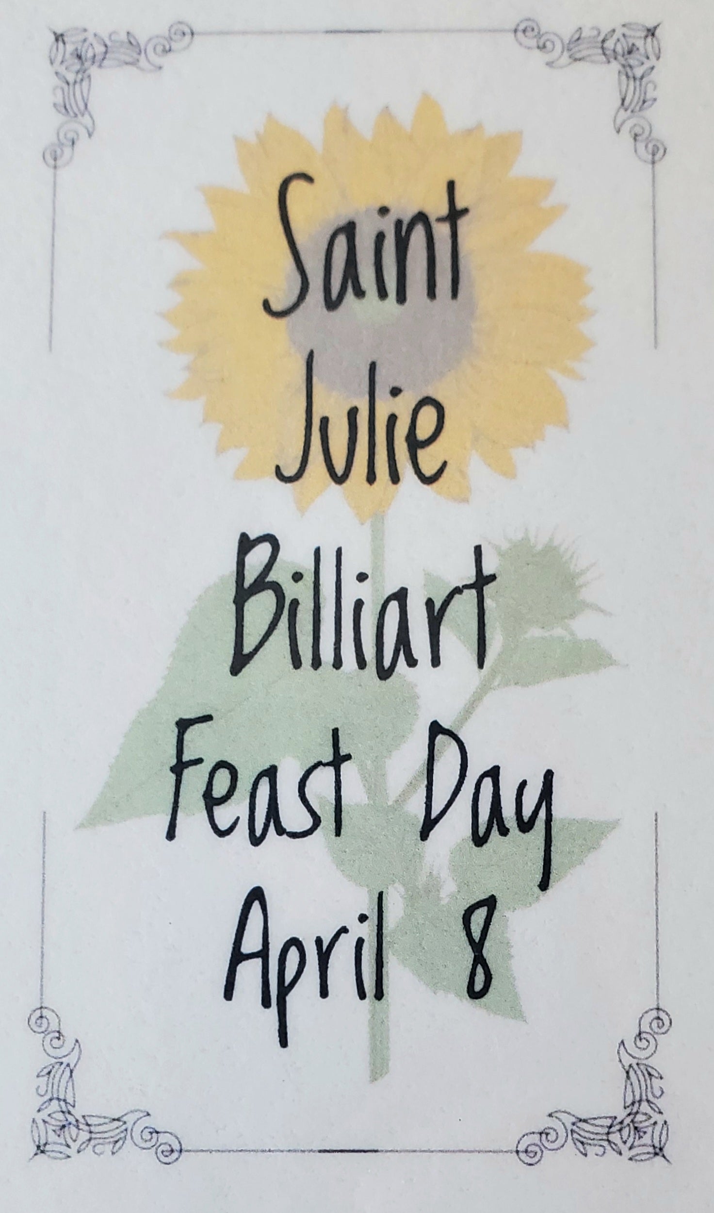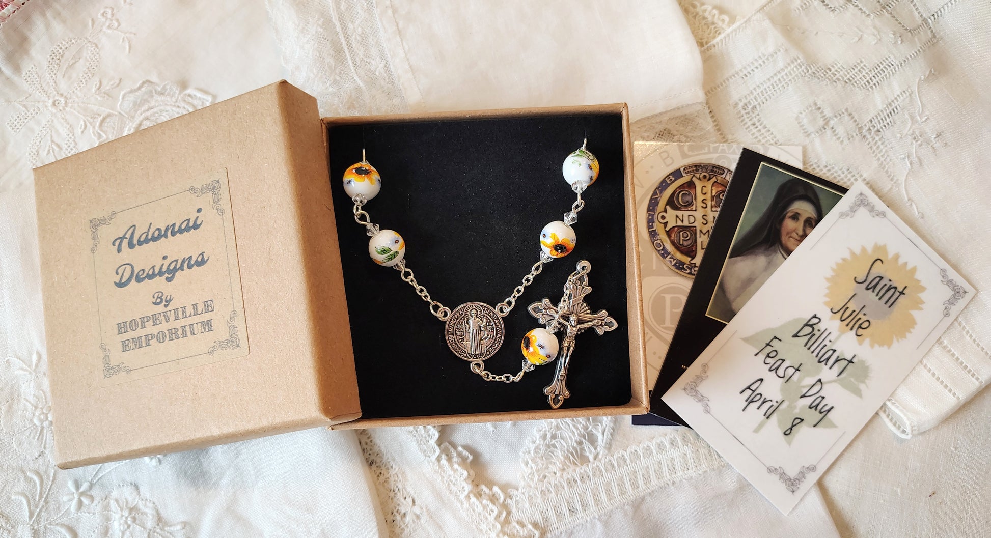 St. Julie was the founder of the sisters of Notre Dame de Namur. She was dedicated to the education of children and while paralyzed for decades she taught Catechism to children from her bed. She is credited with the saying that accompanies one of the two handmade and laminated cards that accompany the rosary, "Be like the sunflower that follows every movement of the sun and keep your eyes always turned toward our good God". Also included is a St. benedict card and a commercial St. Julie prayer card.