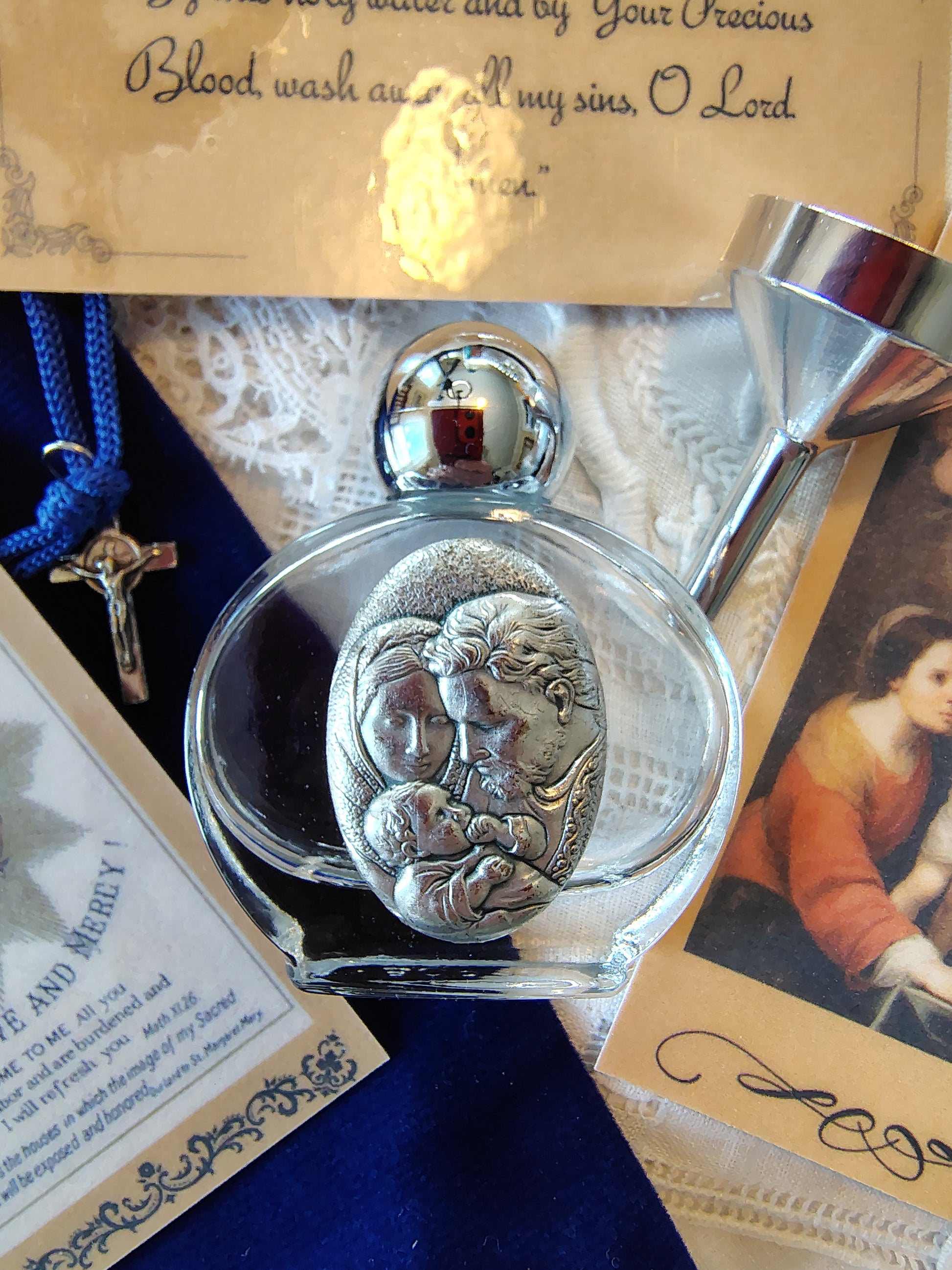 | Holy Family Holy Water Set | Glass Bottles with Handmade Prayer Cards | Includes Funnel & Velvet Bag Looking for a beautiful and practical way to store and use Holy Water? Our Holy Water Sets are perfect for you or for as a meaningful gift. Every set comes with a trio of handmade cards that explain: A coordinating handmade card that describes the uses of Holy Water on the reverse Two special prayers to use with your Holy Water on for you or others and one for your home Instructions for the proper disposal of Holy Water adorned with an image of the sacred heart to display in your home for additional promised graces. What's Included: Imported from Italy, One 2 oz glass Holy Water bottle with Alloy Medallion of Jesus of Divine Mercy 2 5/16" High x 1 3/4" wide X 3/4" thick Three handmade specially designed and laminated prayer and instruction cards That coordinate with the Holy Water bottle. A small metal funnel for easy filling 1" diameter x 1 1/4" long A luxurious 4" x 6" (approx.) blue velvet bag adorned with a 7/8" x 1/2" Saint Benedict cross Also available: 4-ounce spray bottles for Holy Water, which come with the same thoughtful details as the 2-ounce sets. Please see other ads. Ideal for gifting or for personal use at home, church, or as part of your daily prayer practice. Each set is carefully packaged to ensure it arrives safely and beautifully. |