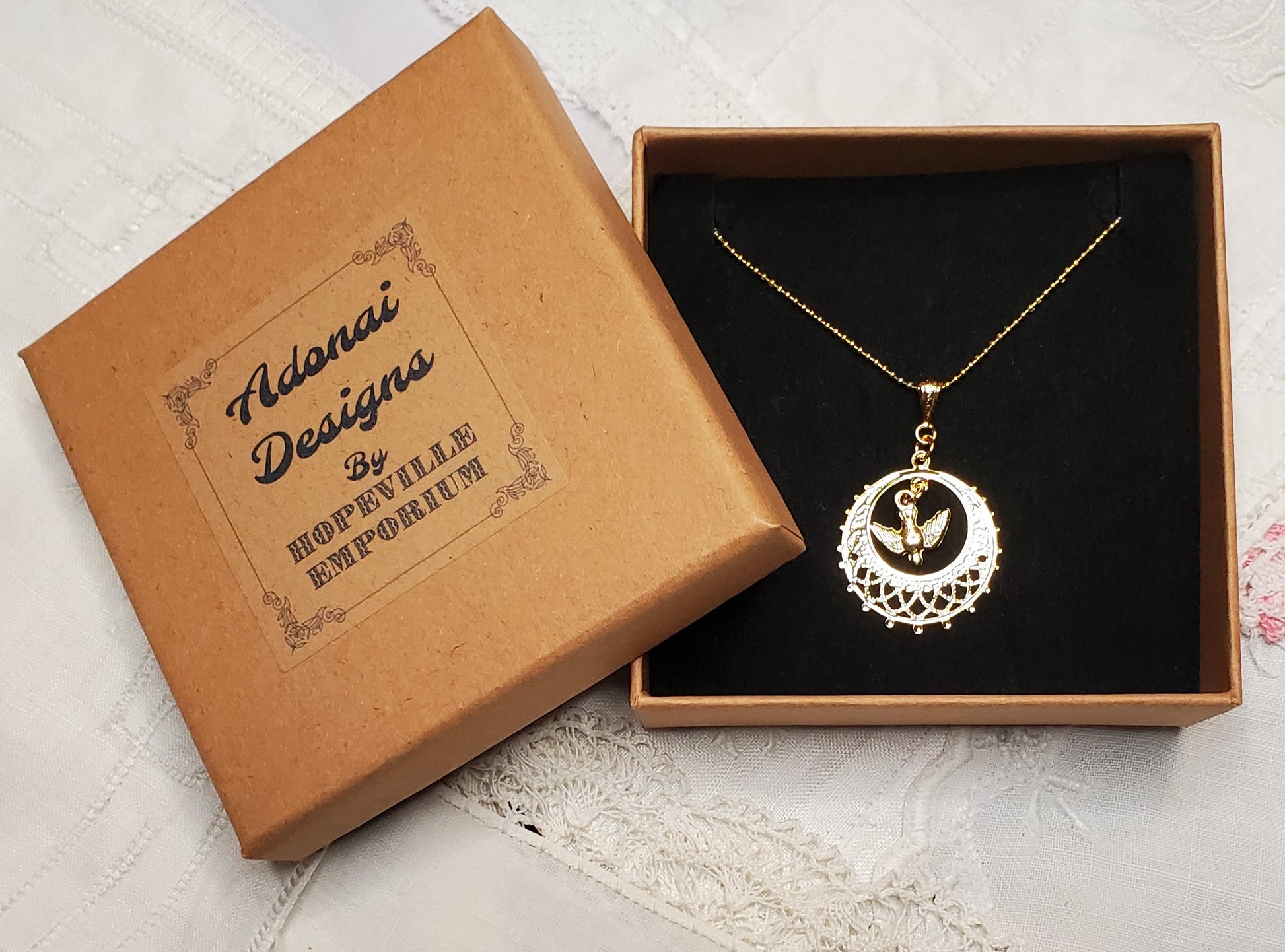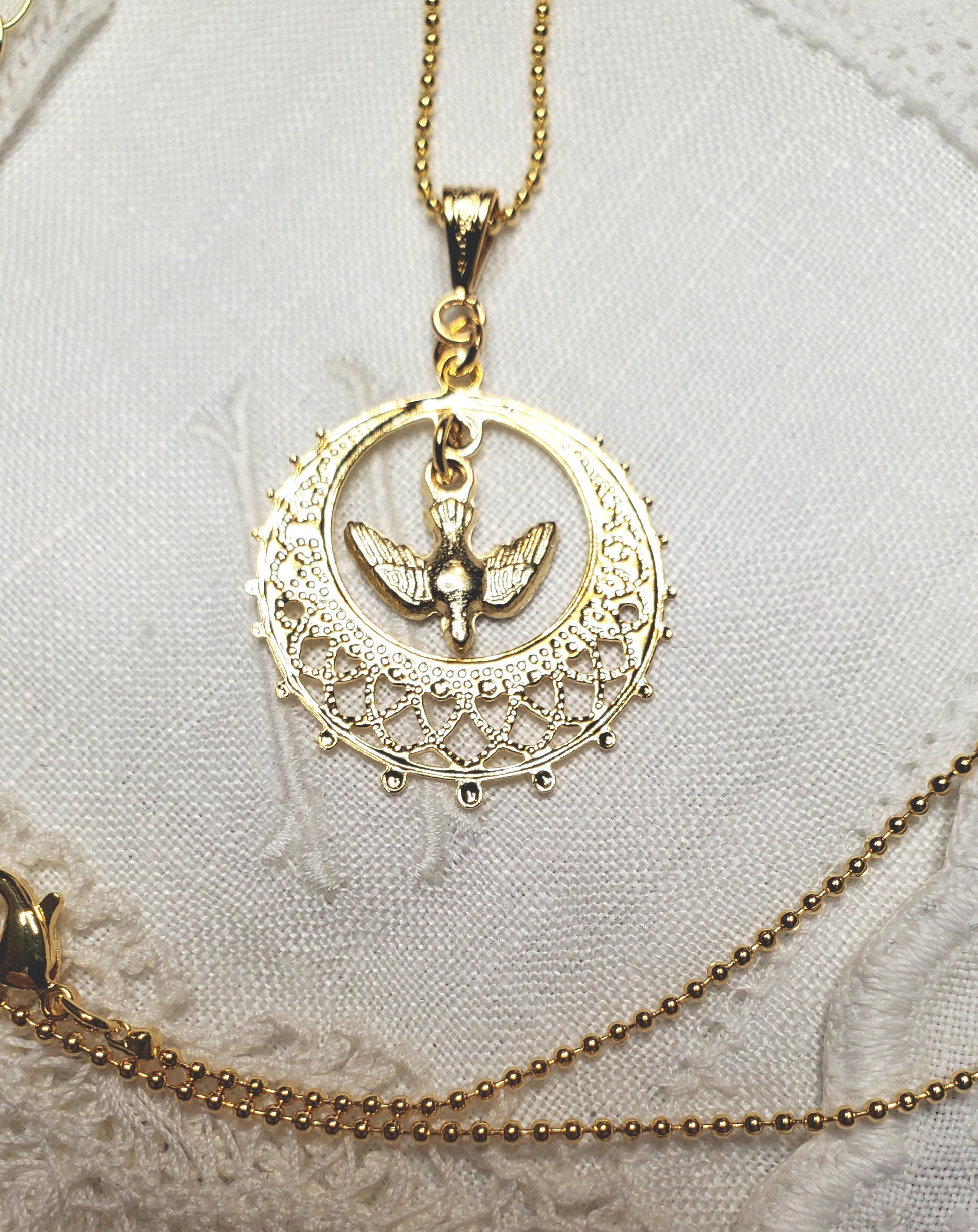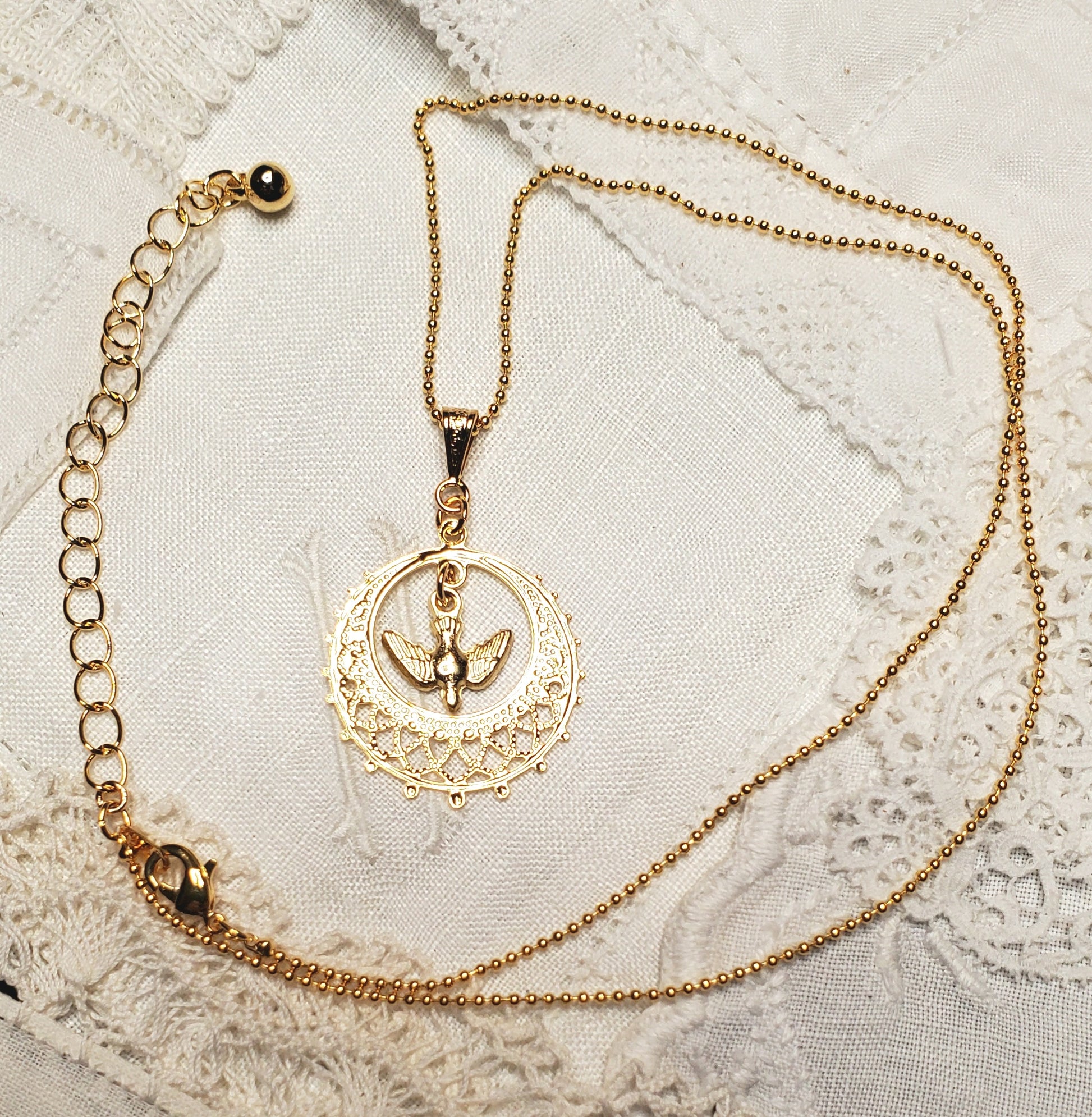 Beautiful Holy Spirit Filigree Charm Necklace features a gold-plated filigree pendant with a Holy Spirit charm made in Italy. The necklace is a fine ball necklace that is a gold plated 18" chain with a 3" Gold plated extender. The bail that the pendant is suspended from is also gold plated.
