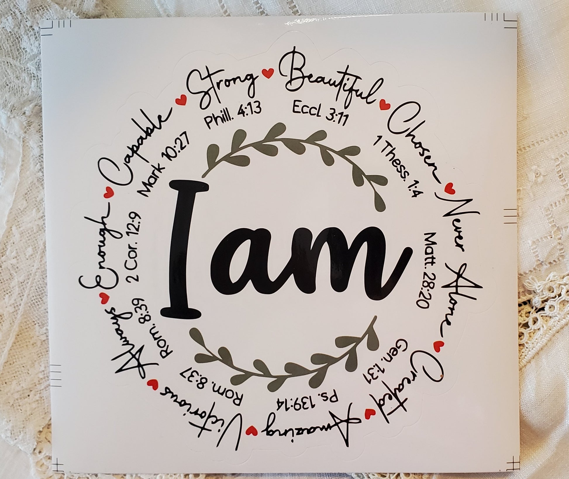 This lovely circular sticker lists attributes that God has blessed his people with. Each entry has a corresponding bible passage associated with it. Great reminders of how God sees each of us.