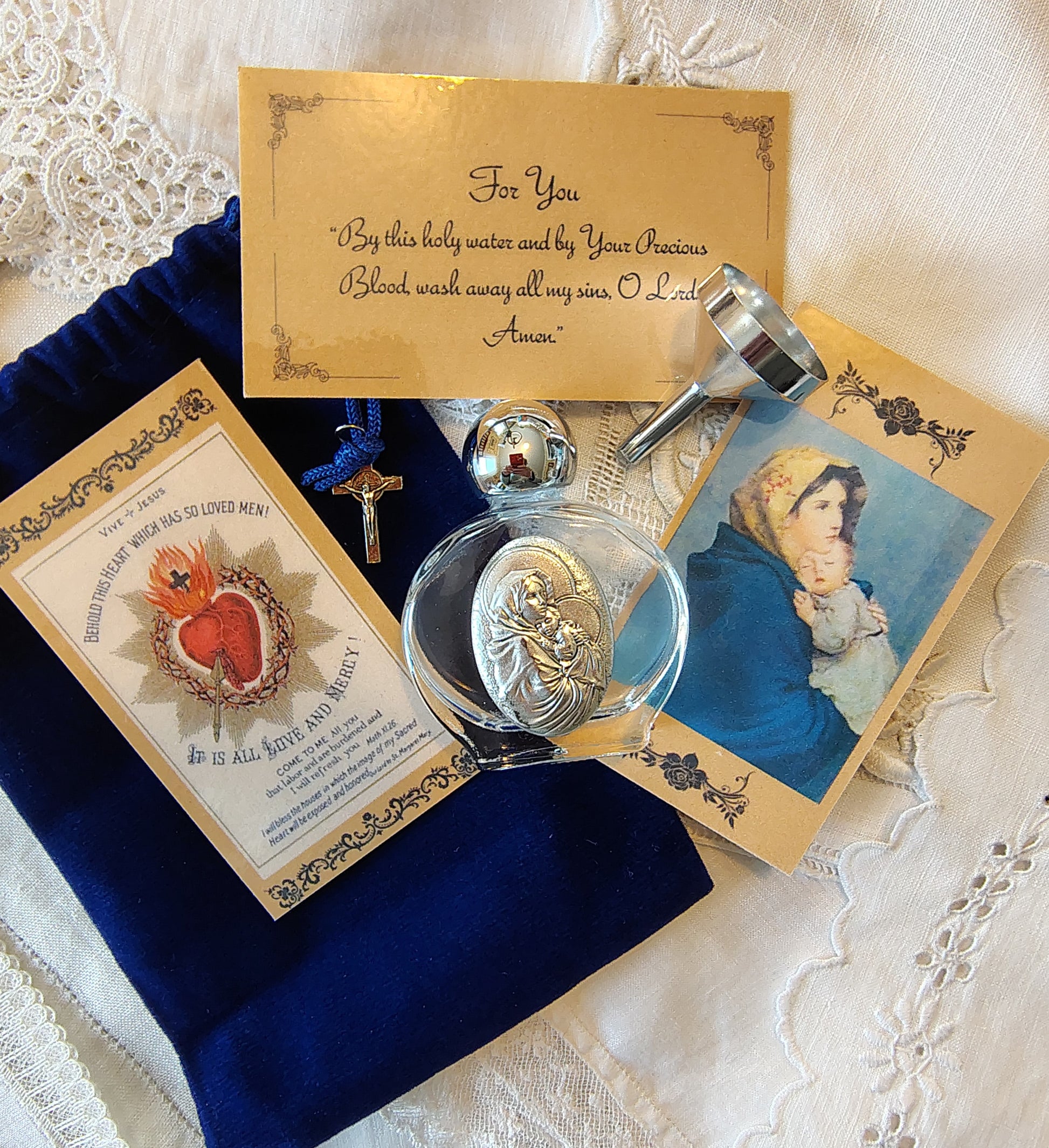Madonna of the Streets Holy Water Bottle Gift Set, Catholic present, Aqua Bendita, regalo de Battesimo, Baptism gift, 1st first communion, confirmation keepsake