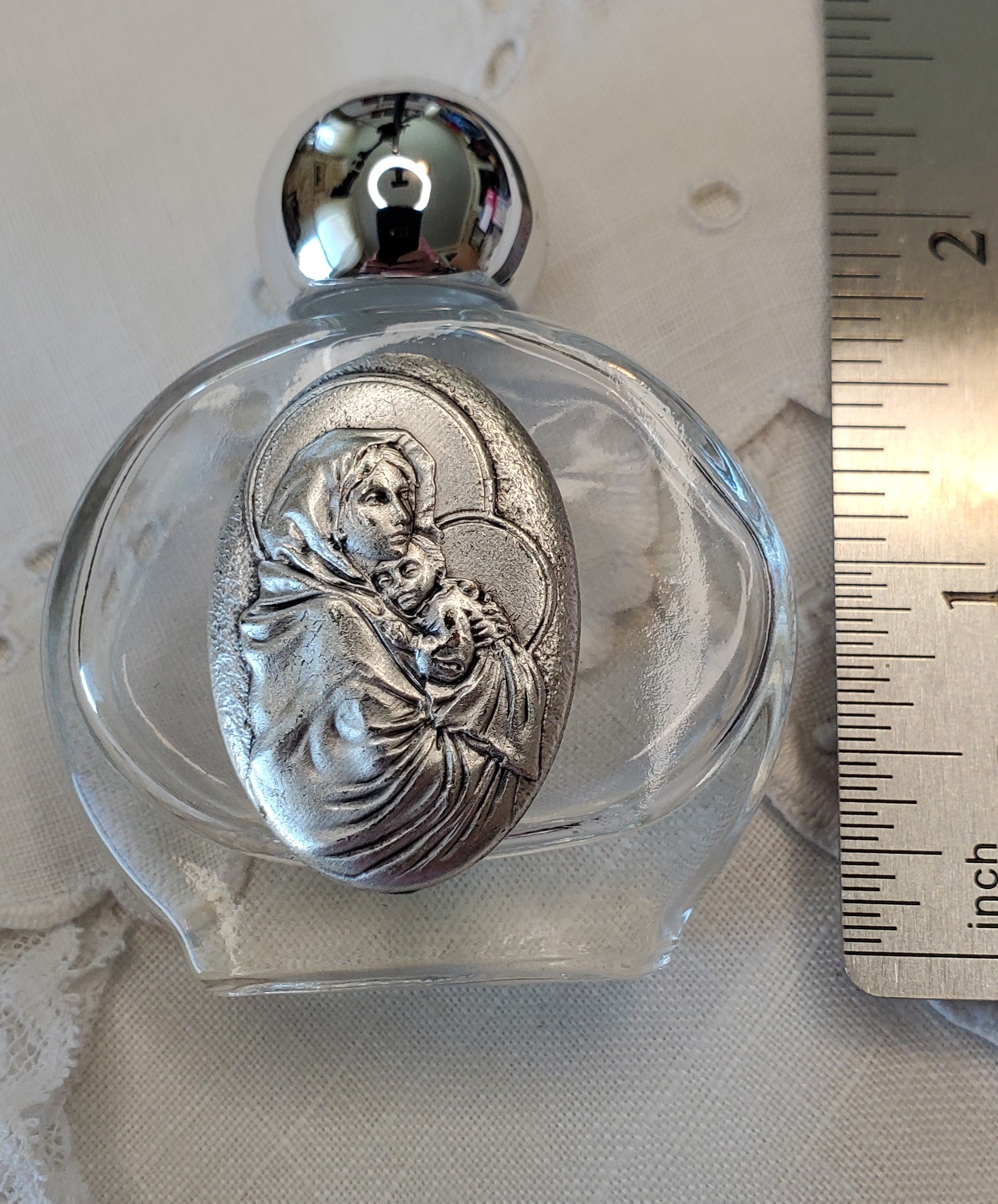 Imported from Italy, One 2 oz glass Holy Water bottle with Alloy Medallion of Jesus of Divine Mercy 2 5/16" High x 1 3/4" wide X 3/4" thick