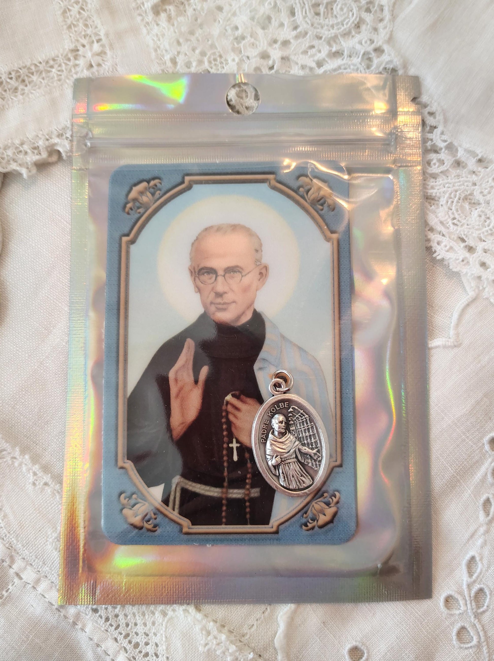 Maximilian Kolbe Medal & Prayer Card Gift Set patron Saint of Addiction Recovery Devotional imported Italian Medal