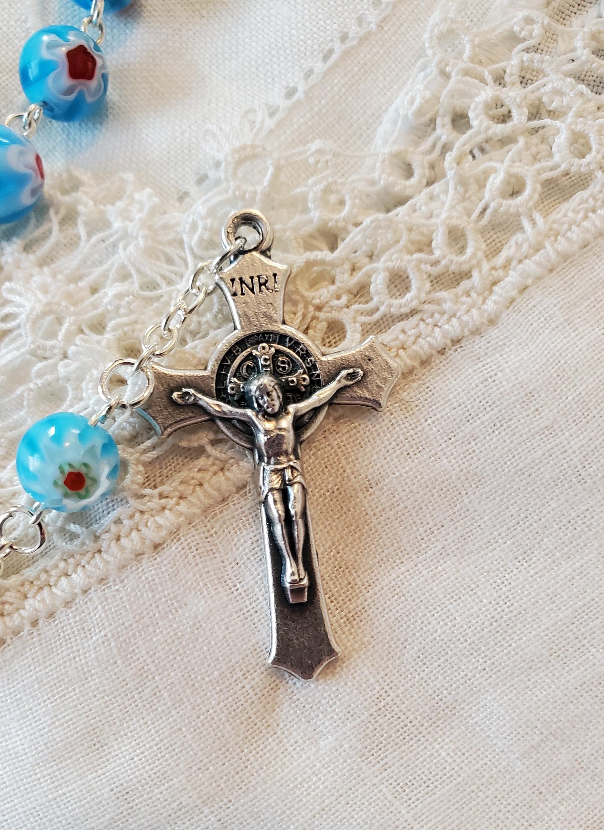 Millefiori light blue, white red handpinned Our Lady of Grace Car Rosary Saint Benedict Crucifix, Silver Plated, Lady of Grace centerpiece