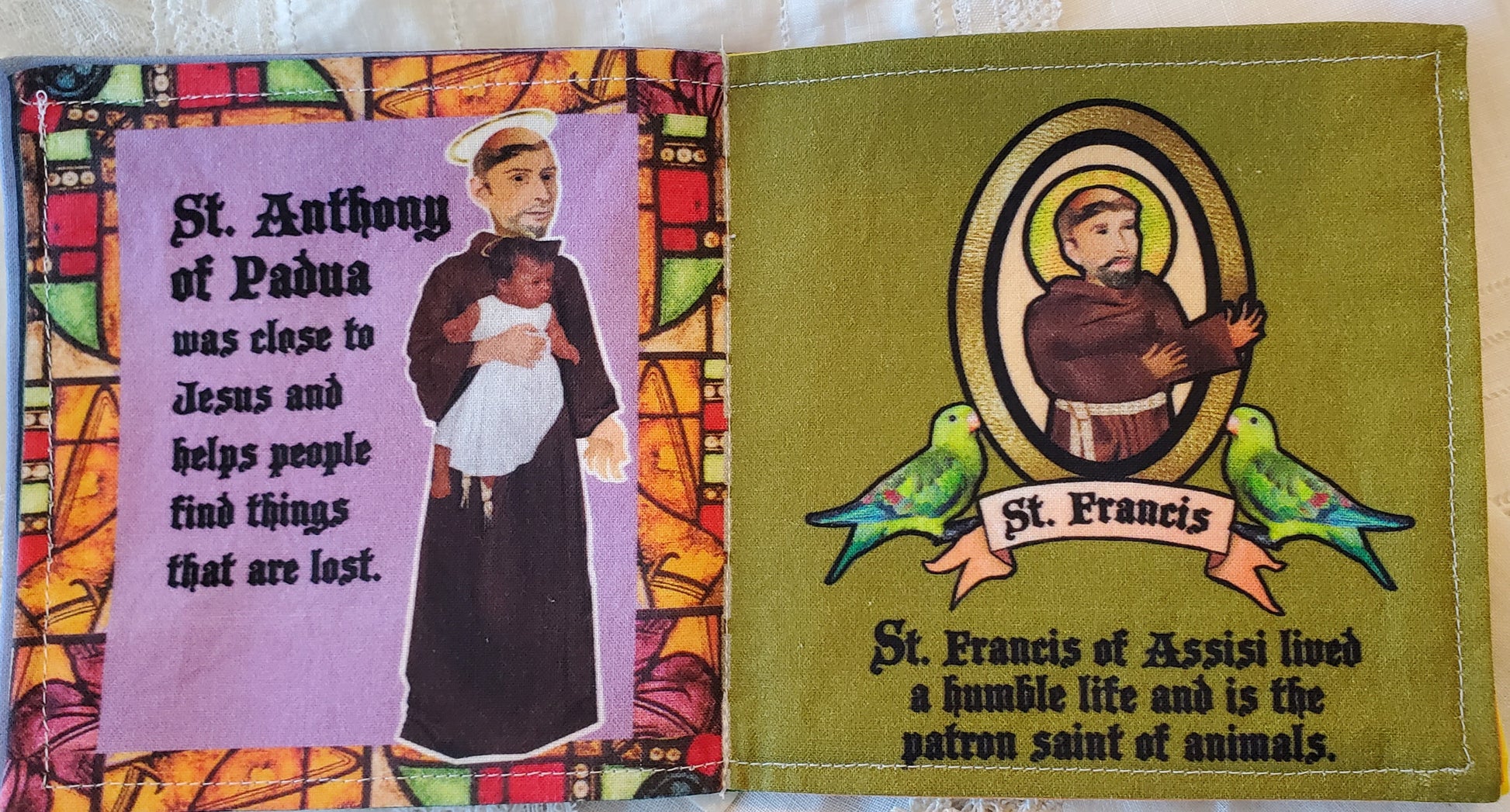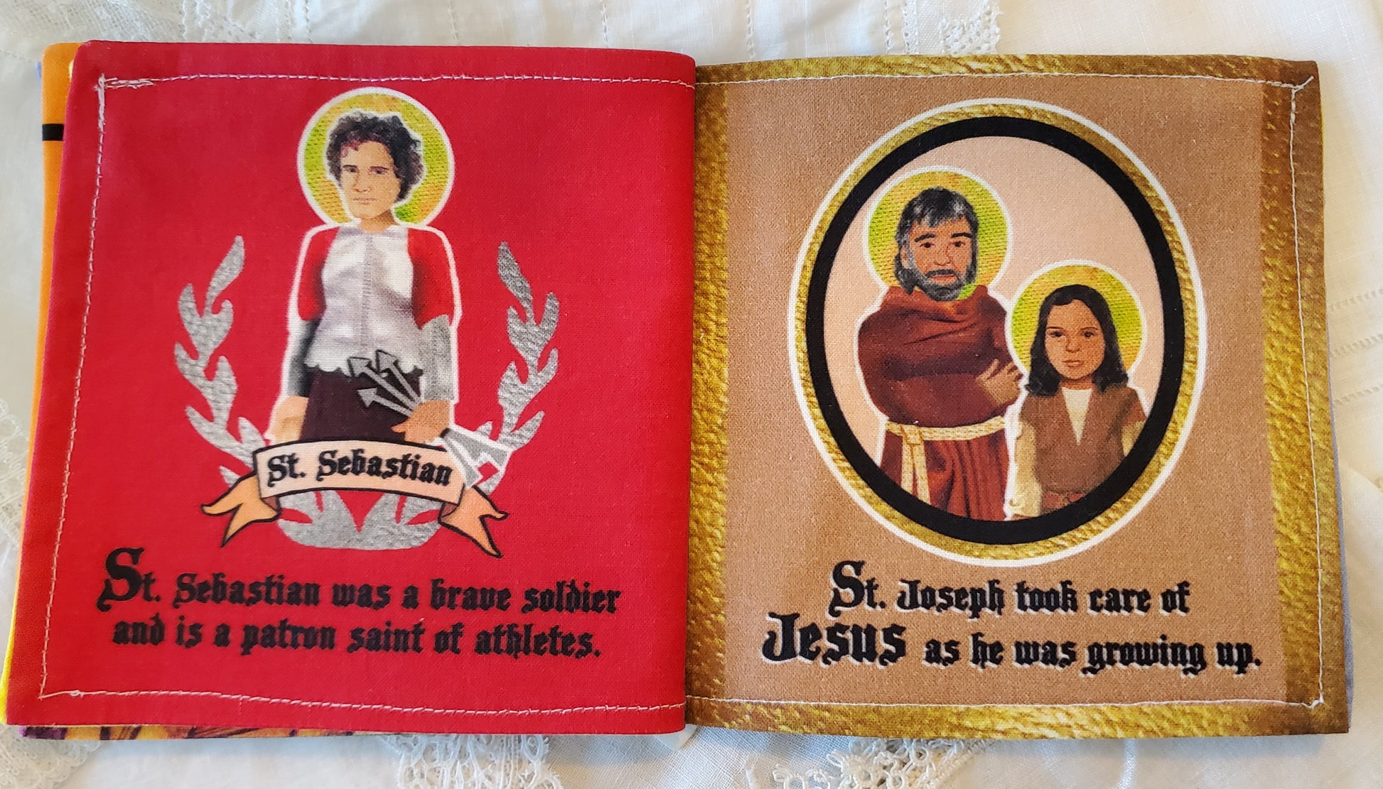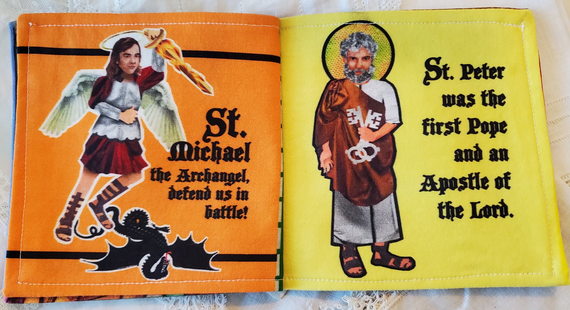 This beautifully illustrated completed Cut and Sew book has My First Book of Boy Saints; Male saints presented in a fun format for small children. This finished cut and sew book is reinforced with interfacing to make the pages more durable for continuous play. The following saints are highlighted with a short biography on each: Saint Peter, Blessed Saint Joseph, Saint Francis, Saint Sebastian, Saint Anthony of Padua, Saint Jude, Saint Maximilian Kolbe, Saint Patrick, Saint Thomas Aquinas and Saint Michael The Arch Angel. This book is a part of a set that may be purchased separately or as a complete set (please see other ads).