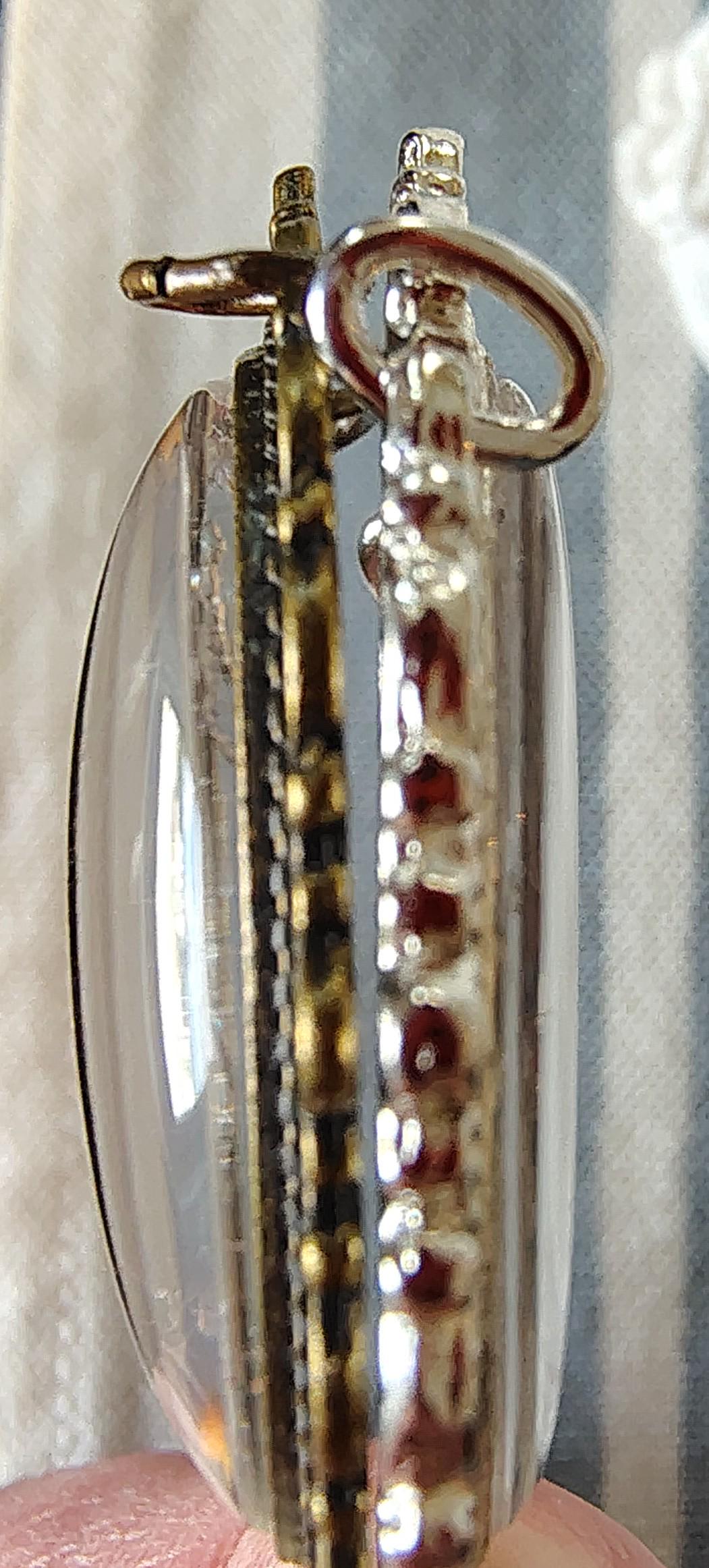 Cabochon: Preciosa Czech low-profile crystal cabochon, selected for its unrivaled clarity and low distortion; this is not an ordinary cabochon, but one ten times the cost of standard options— they’re chosen for the low distortion and preservation of the high resolution images. (see the side by side comparison images in the ad).