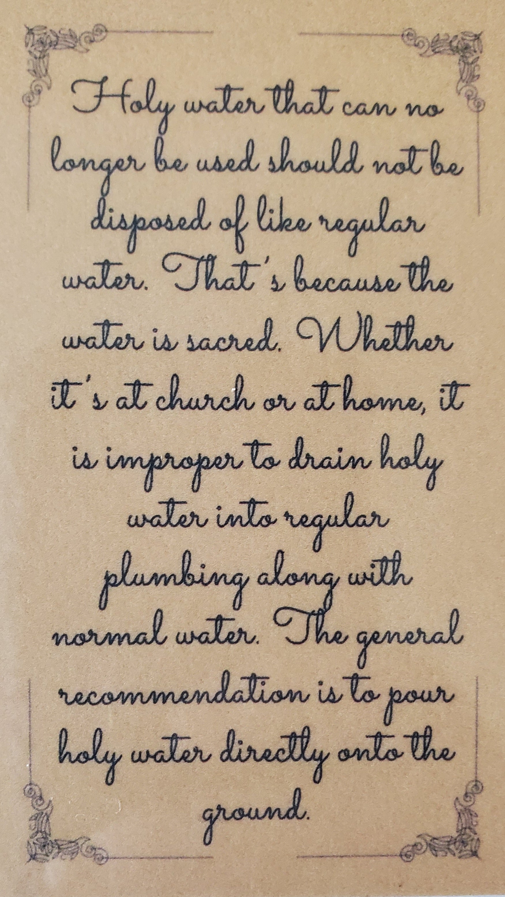 A coordinating handmade card that describes the uses of Holy Water on the reverse
