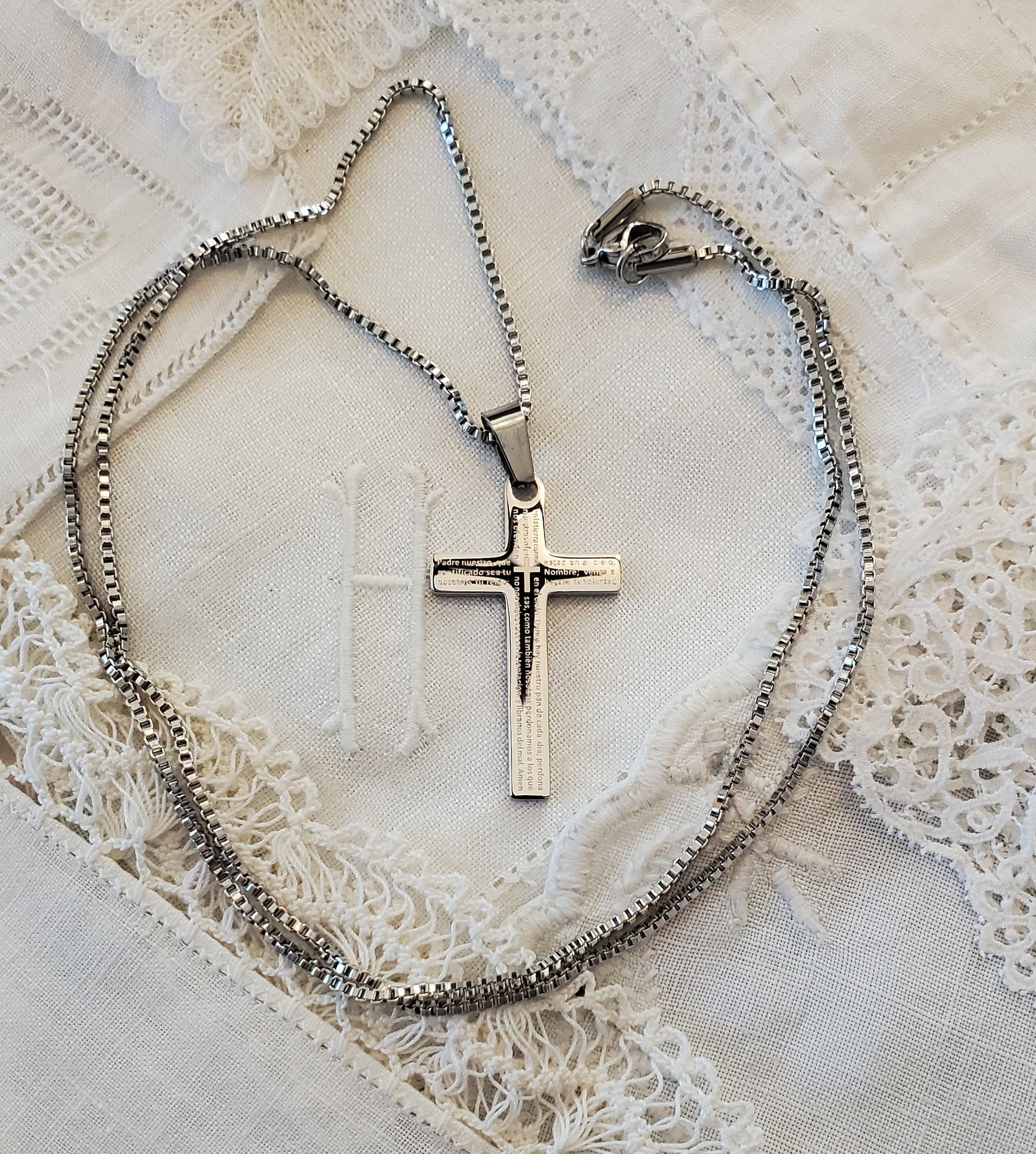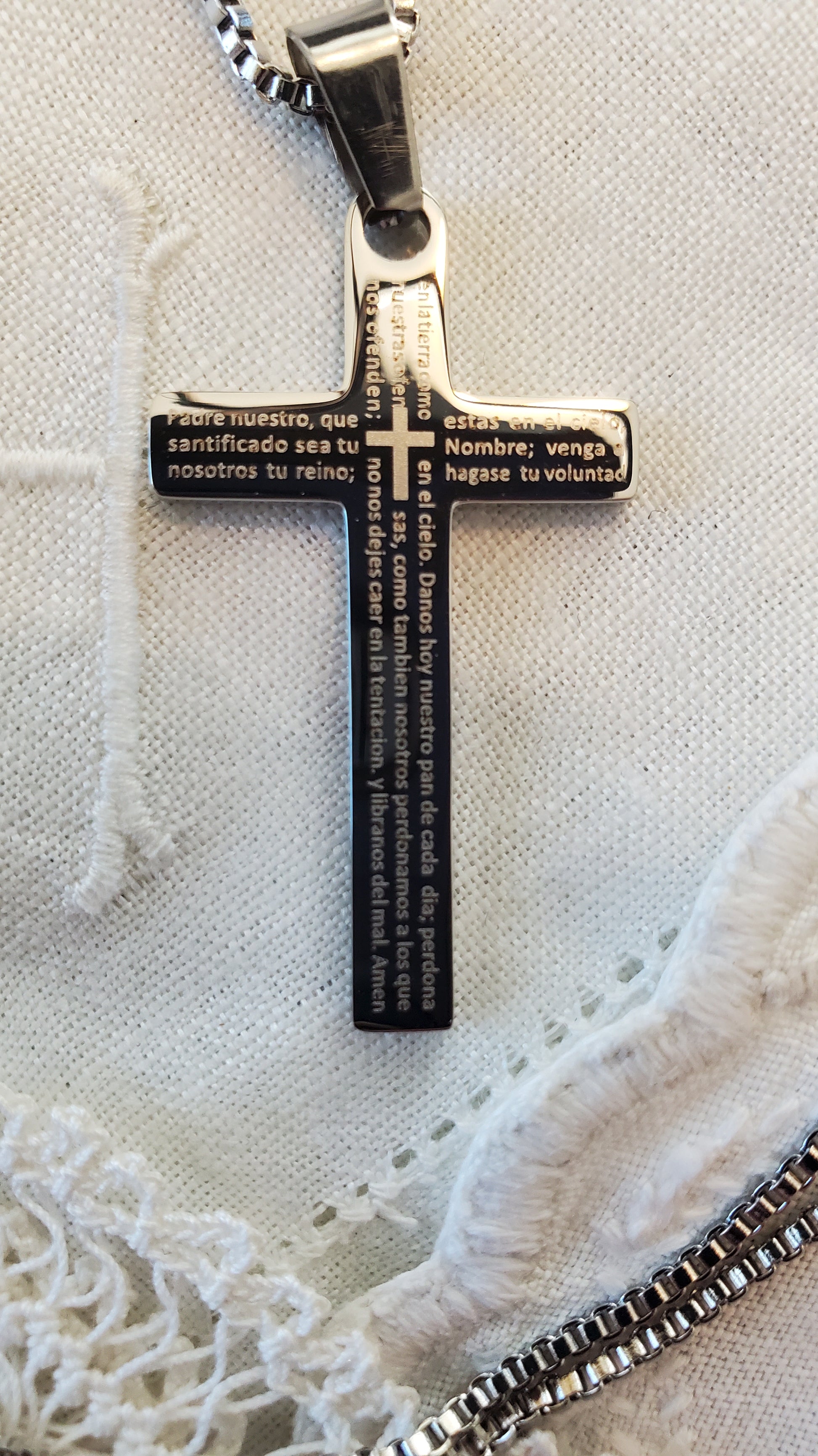 This is a lovely Serenity Prayer Cross. The Cross is engraved with the Serenity Prayer 1 1/2" x 7/8". The cross in stainless steel. Your choice of English or Spanish comes with a Fine 19" Stainless steel link chain or 1.5mm 23" Box chain of PVD Stainless for $1.00 more.