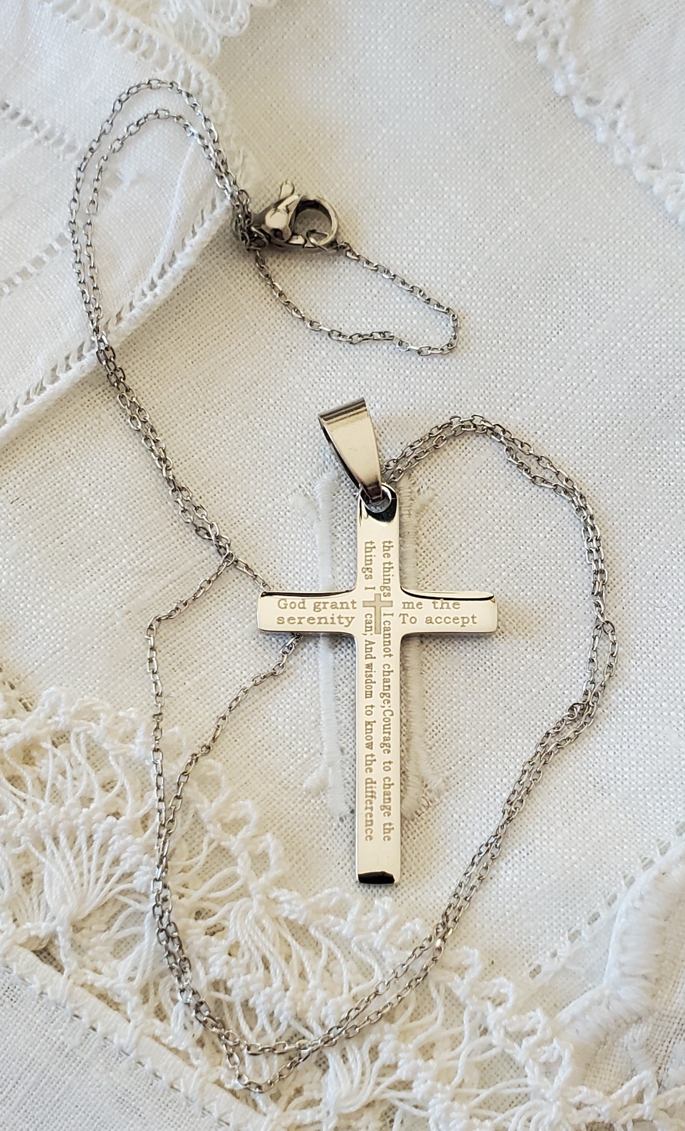 Serenity Cross Stainless Steel on Stainless Steel Chain English or Spanish choice of chain AA NA Recovery Anxiety Disorders Jewlery