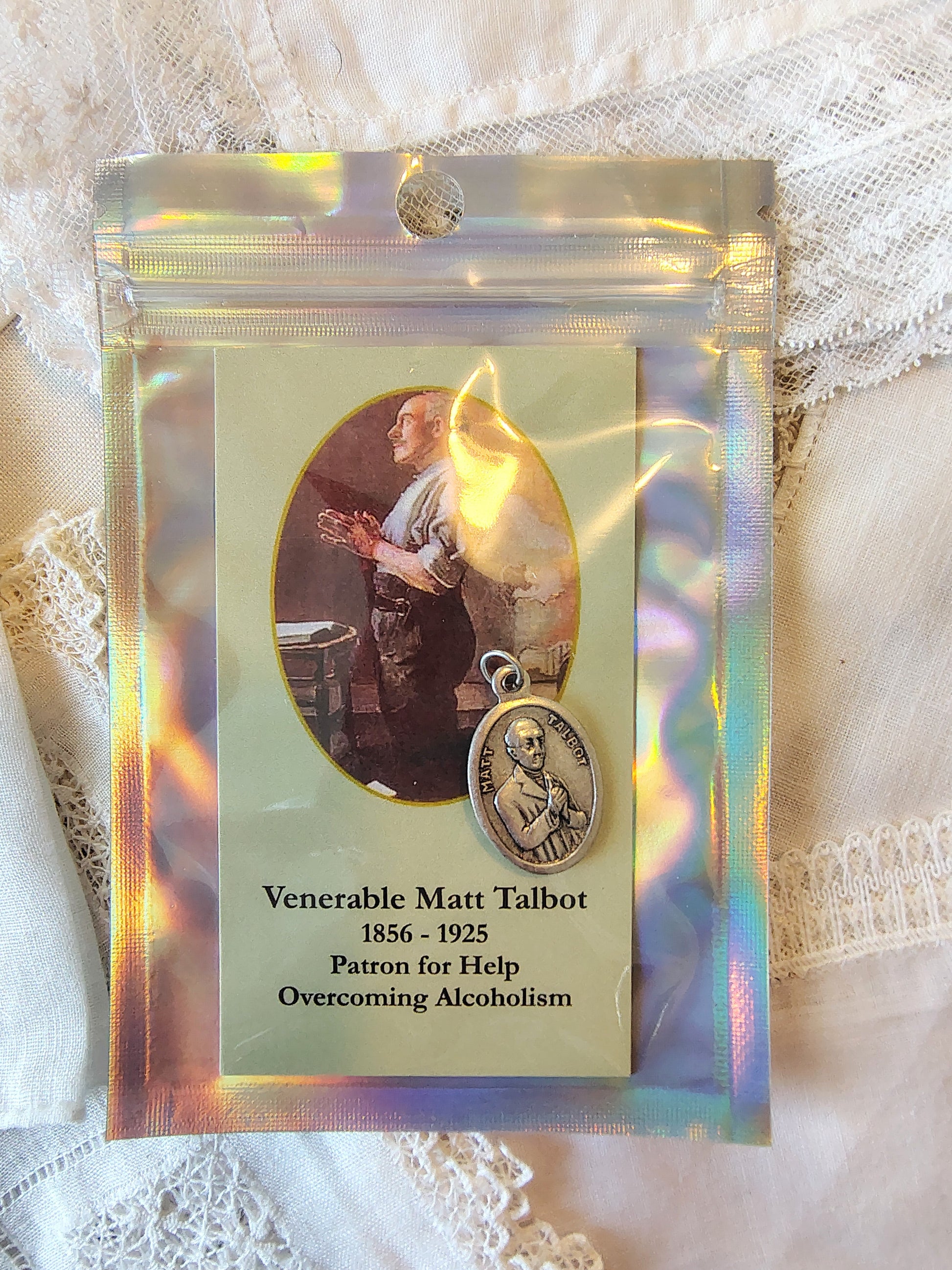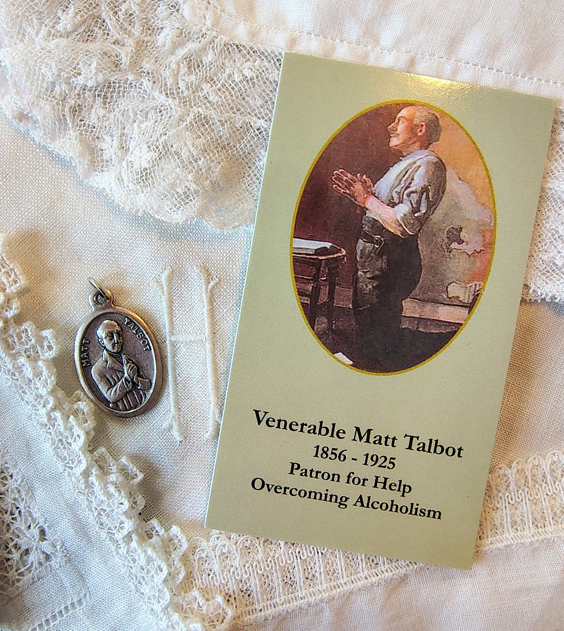Venerable Matt Talbot medal and prayer card set sobriety charm patron saint of alcohol addiction recovery. Prayer key-chain jewelry charm.